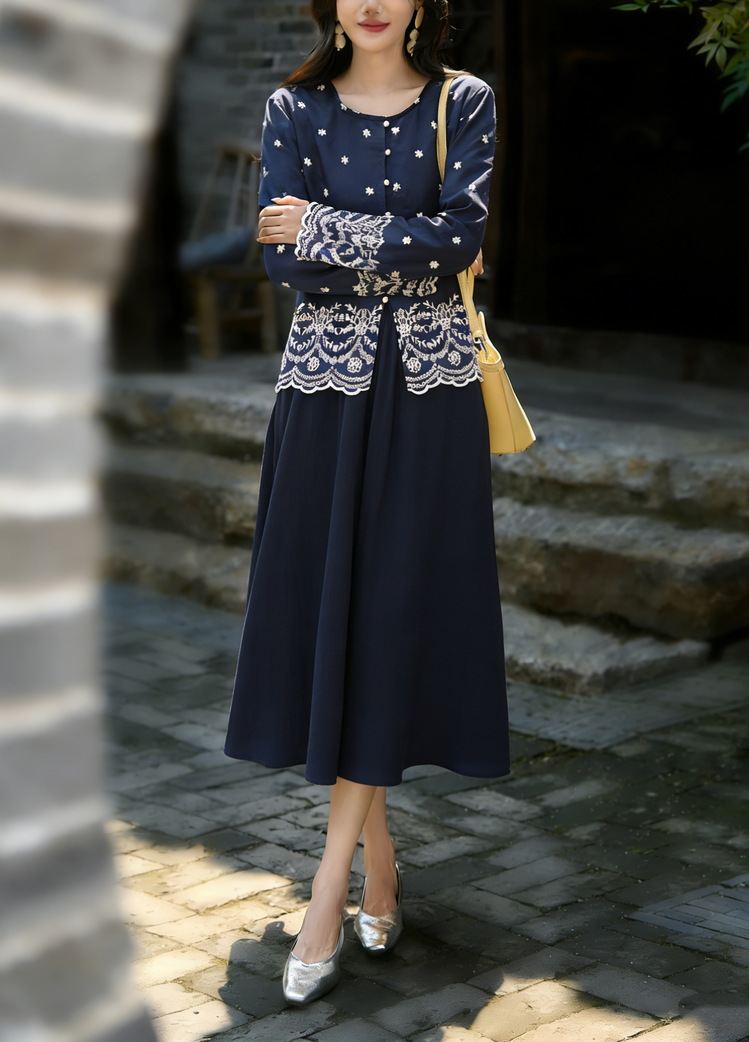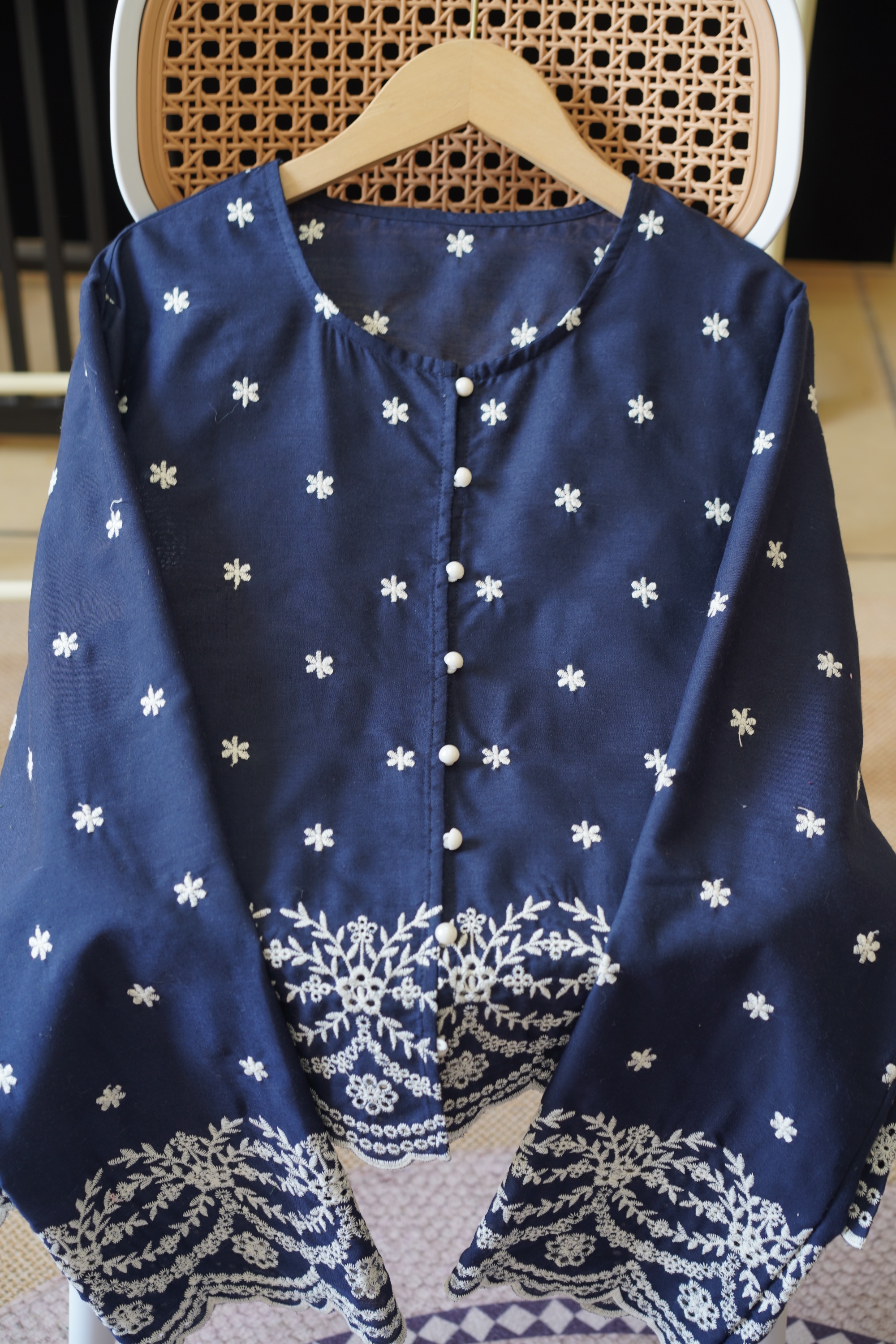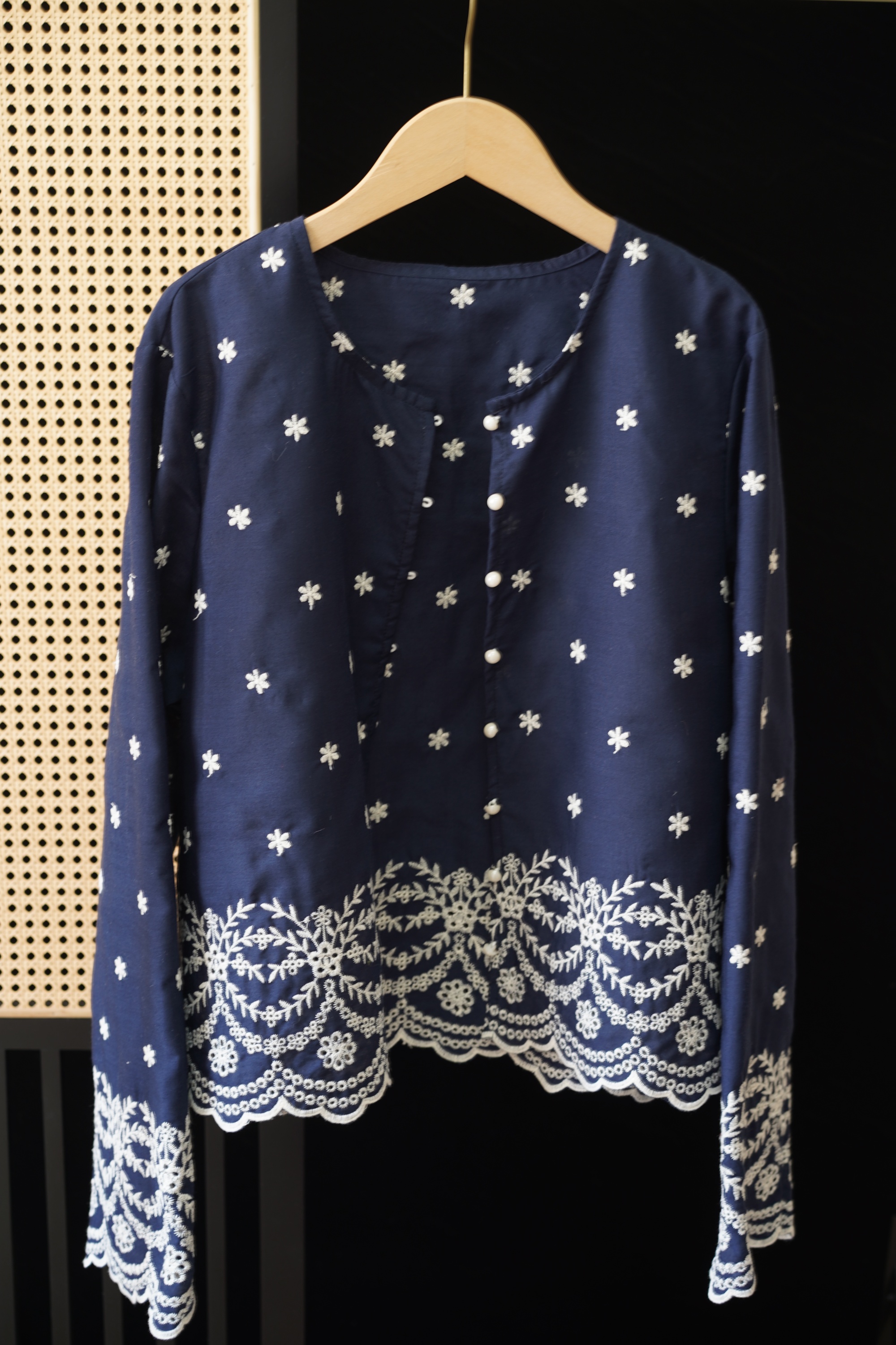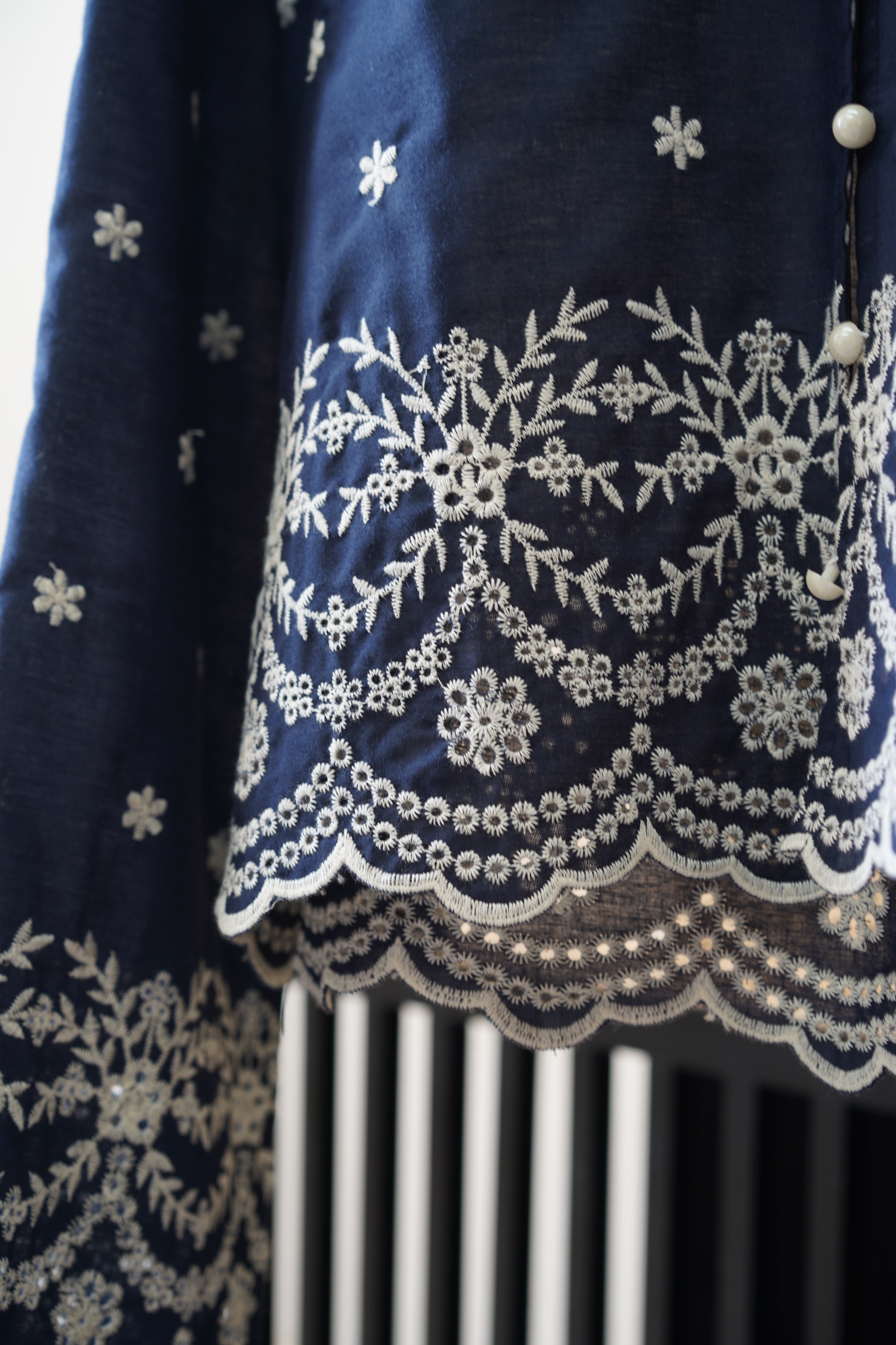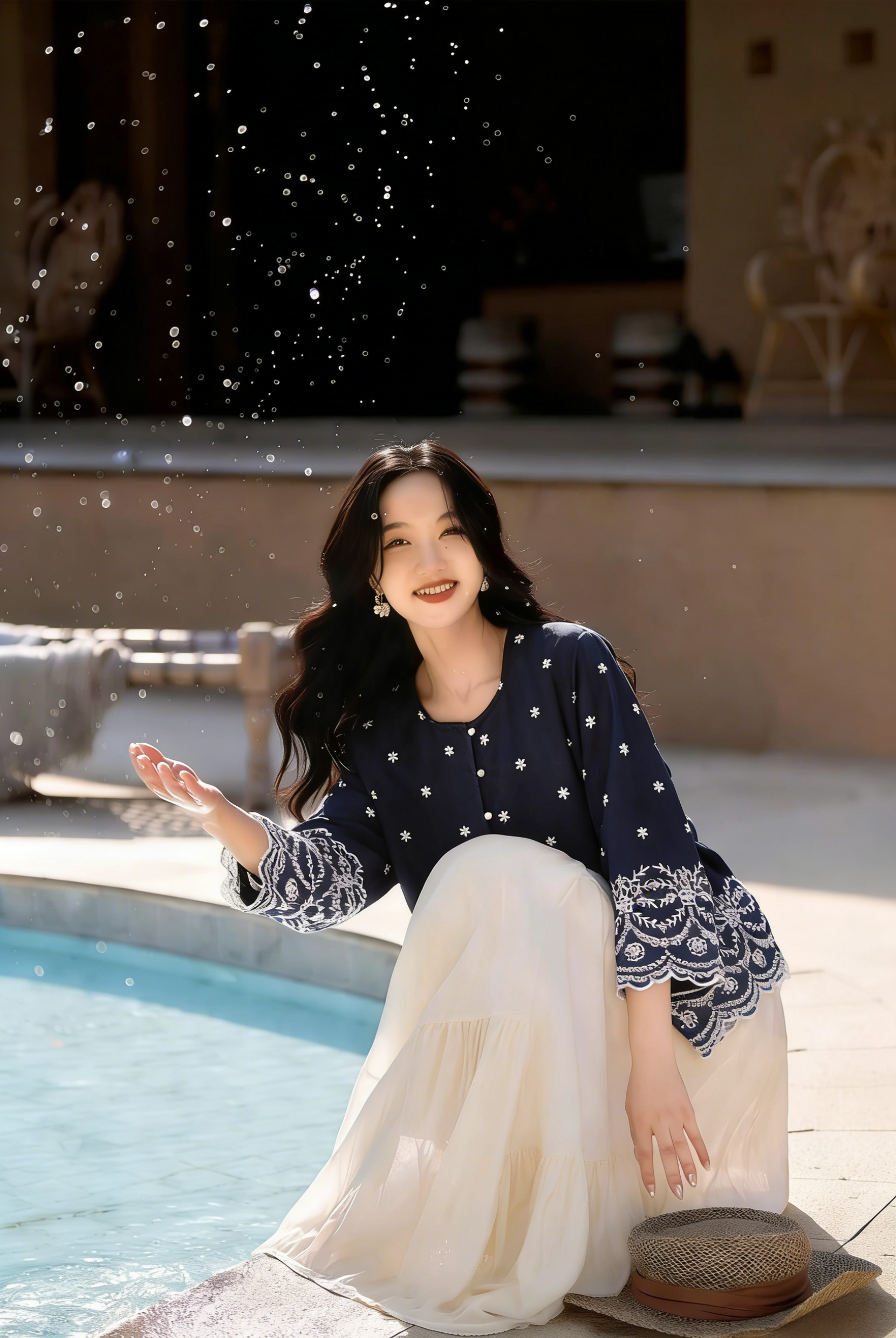 下单3-7天发货!LONGNVFAIR 藏青色撞白满天星刺绣花边上衣/奶油色花瓣半裙套装 一眼沦陷的东方雅致 梨形身材遮肉显瘦 温柔清冷国风穿搭