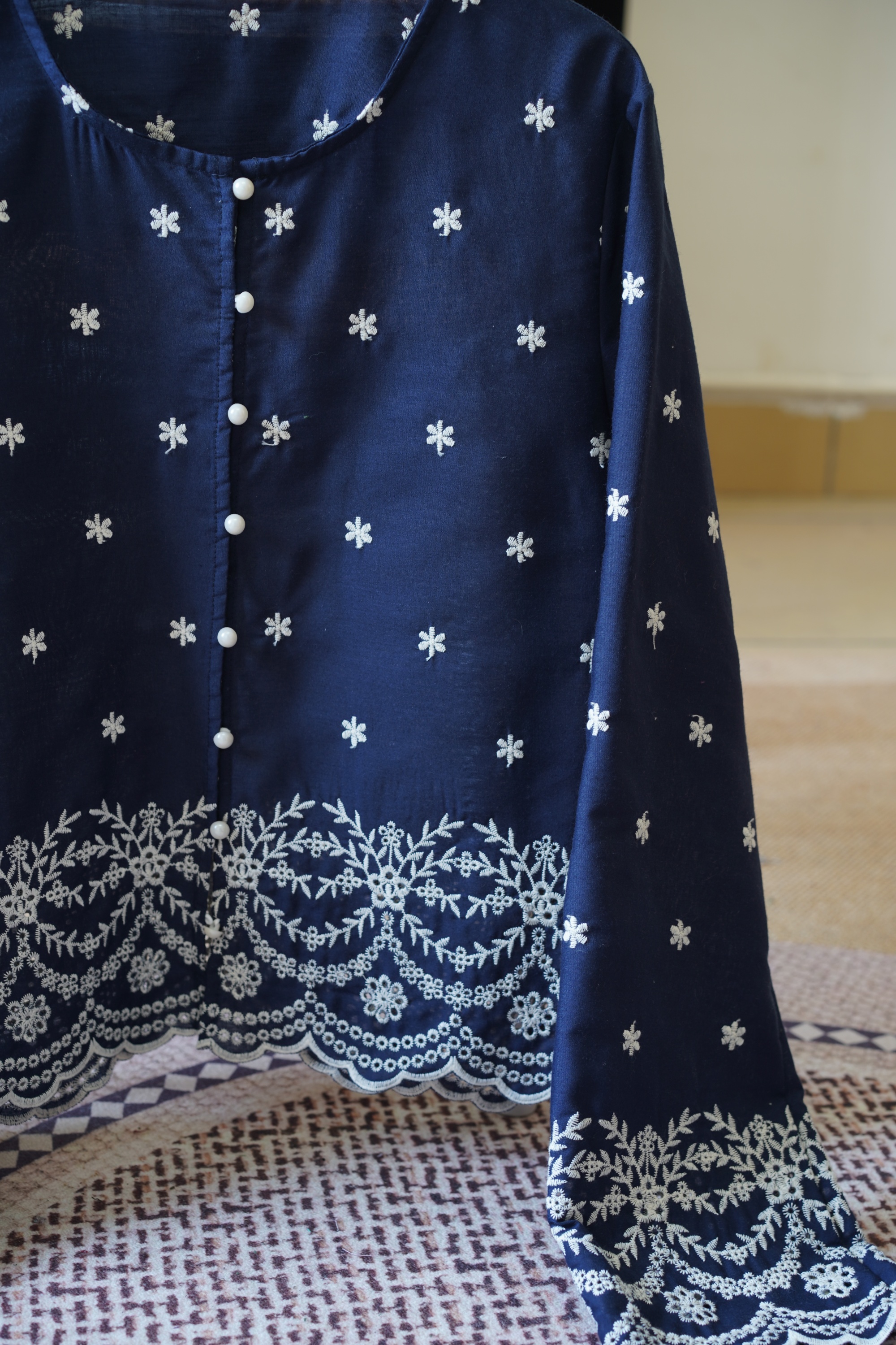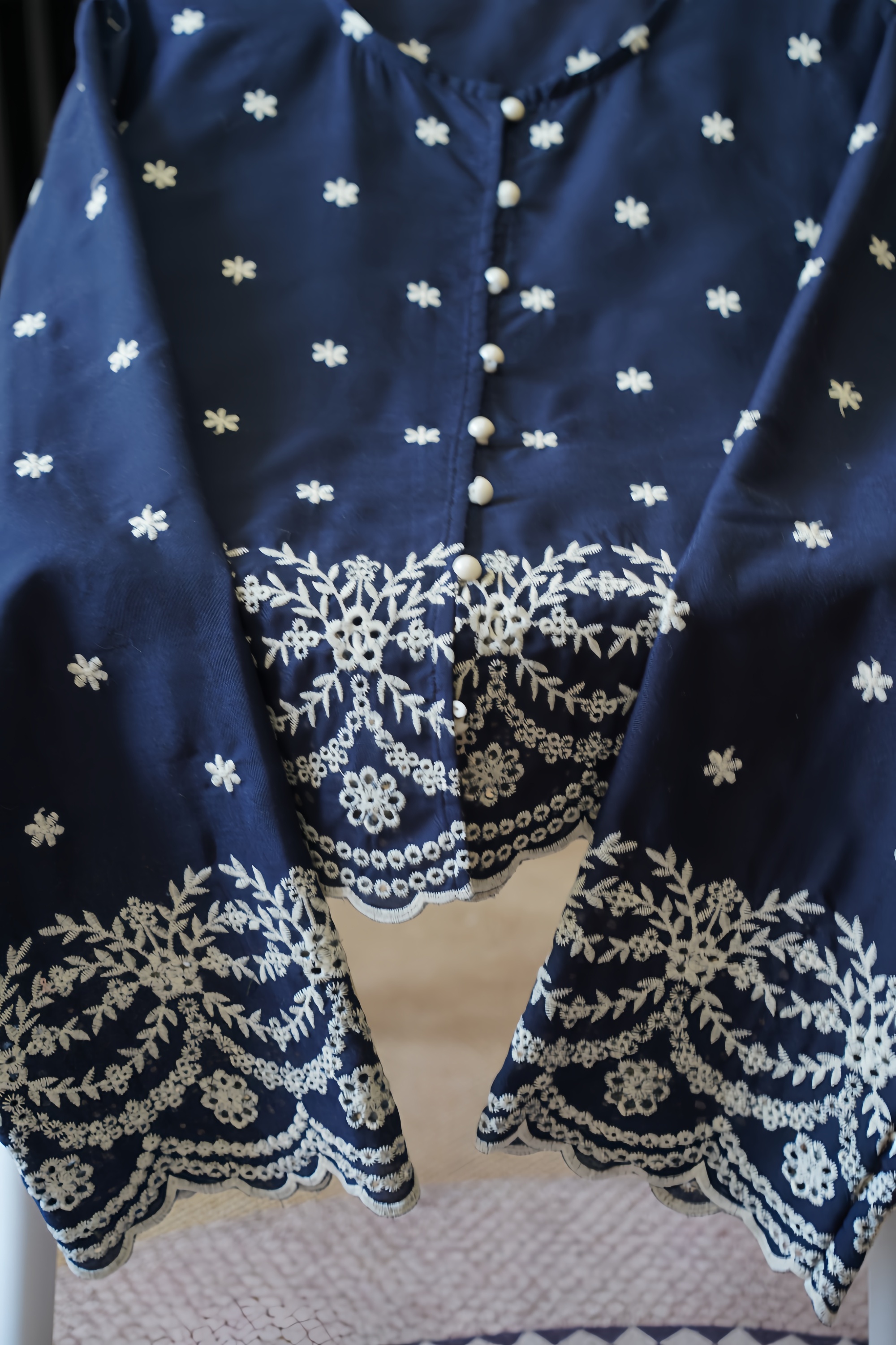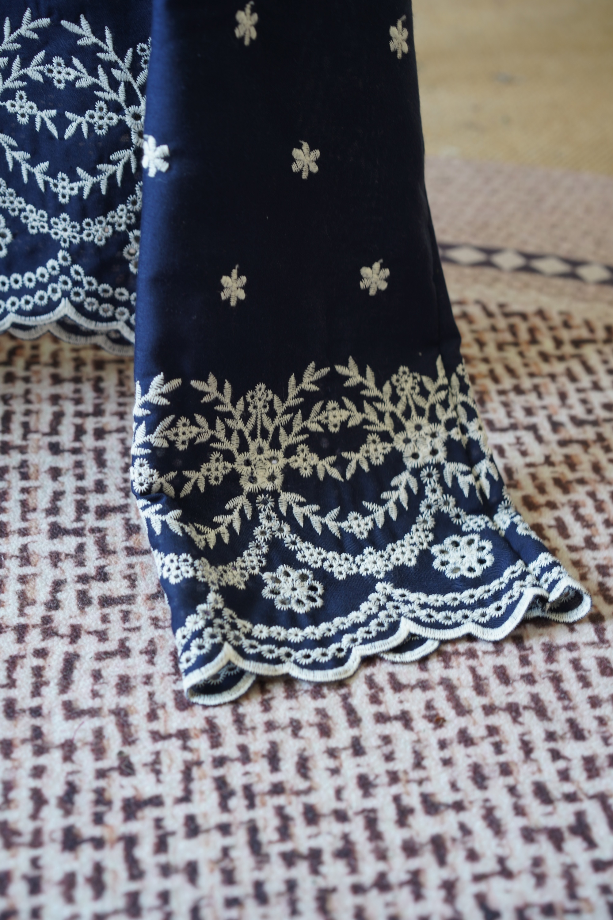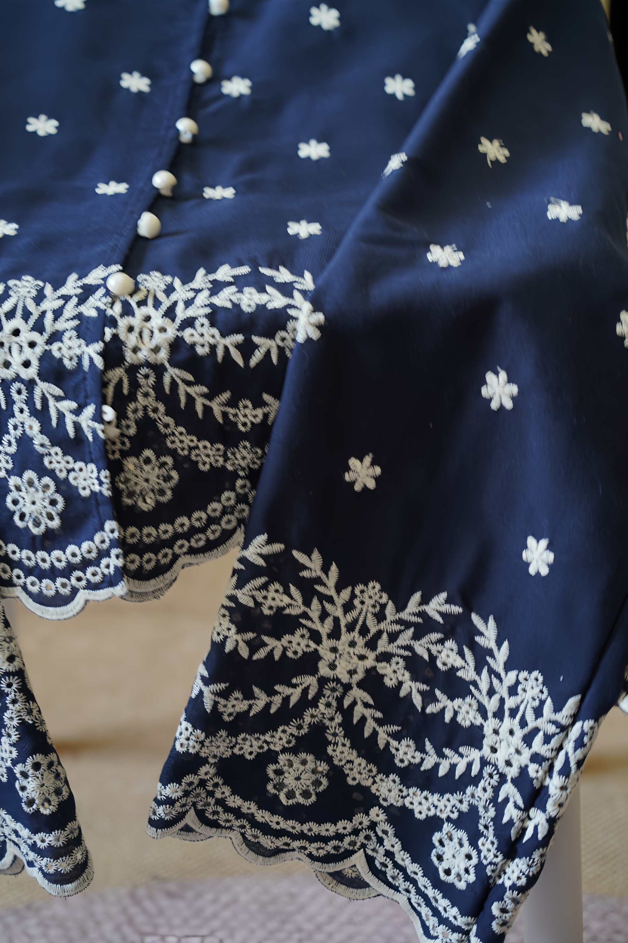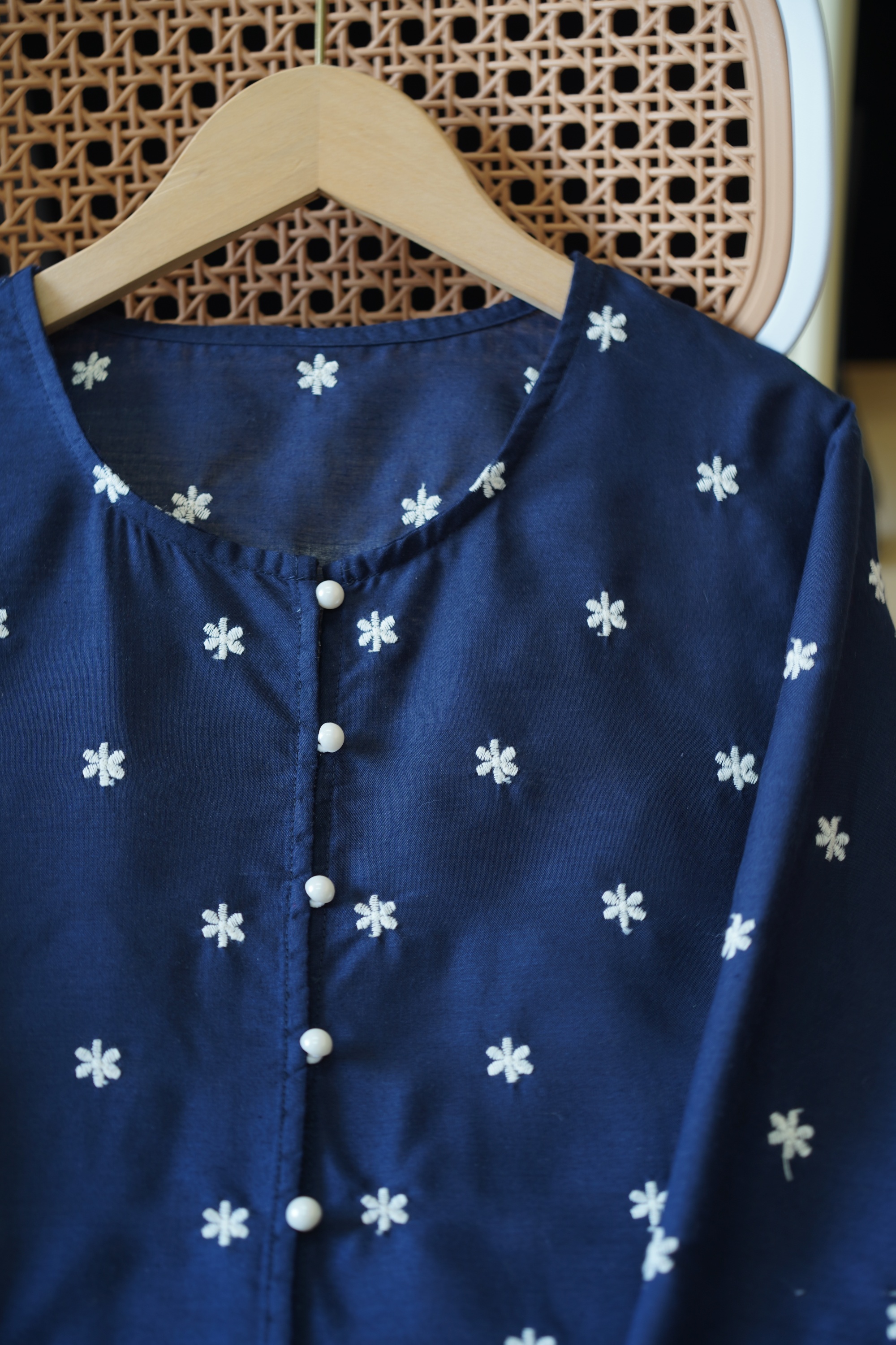 下单3-7天发货!LONGNVFAIR 藏青色撞白满天星刺绣花边上衣/奶油色花瓣半裙套装 一眼沦陷的东方雅致 梨形身材遮肉显瘦 温柔清冷国风穿搭