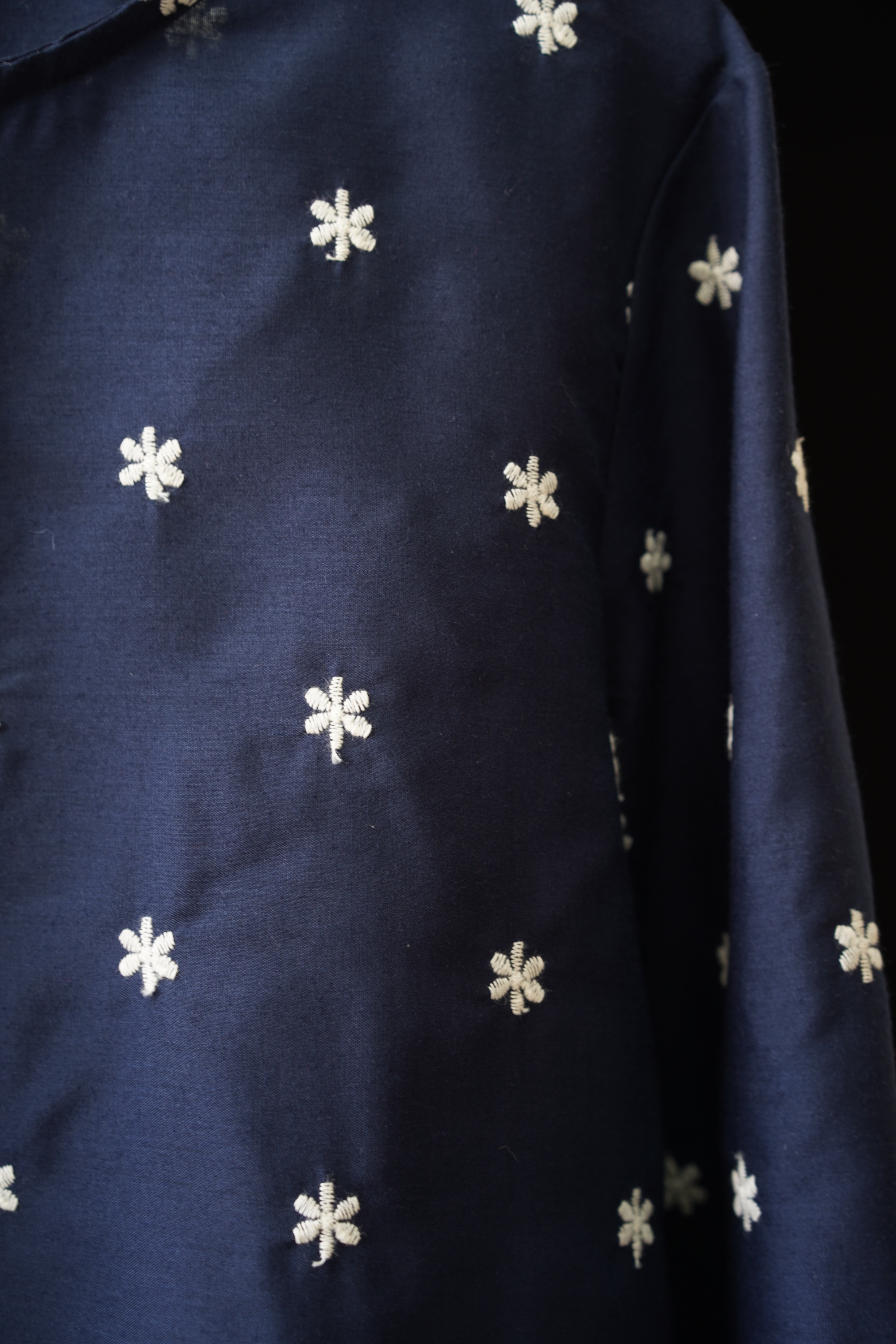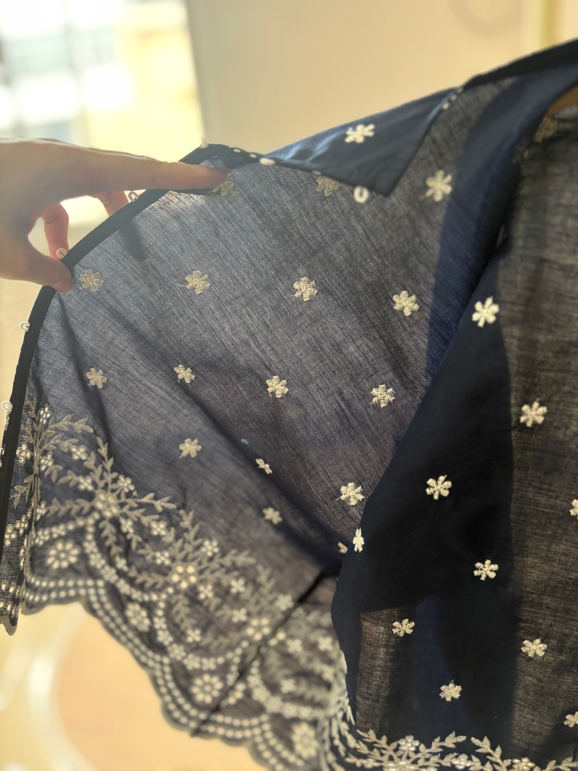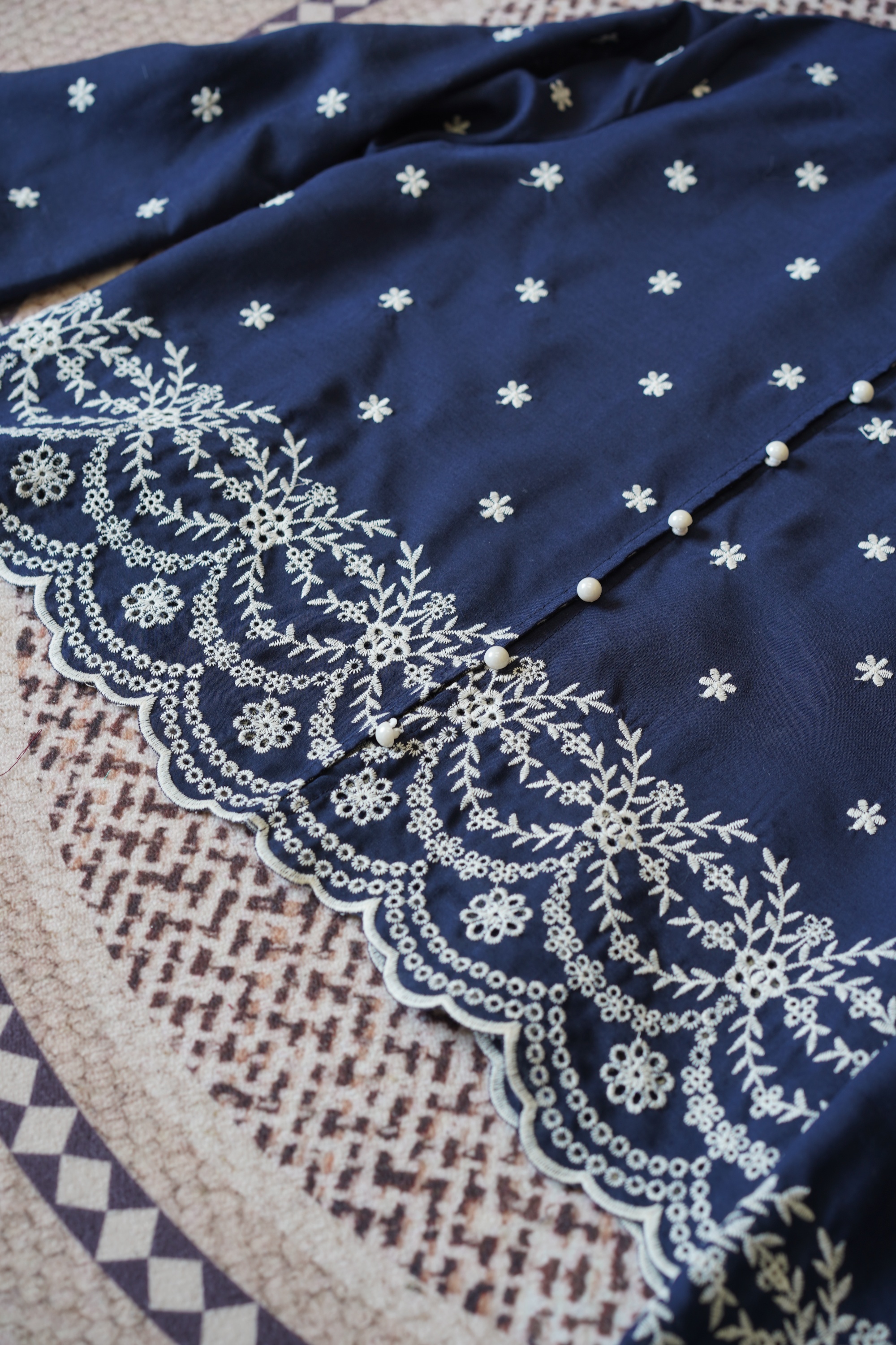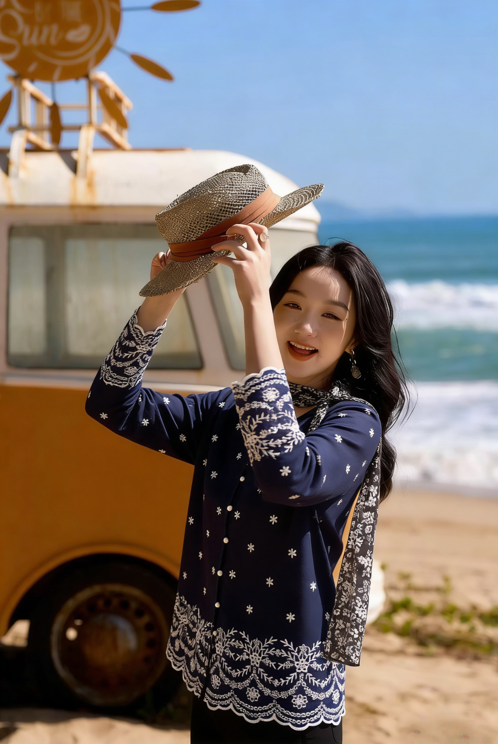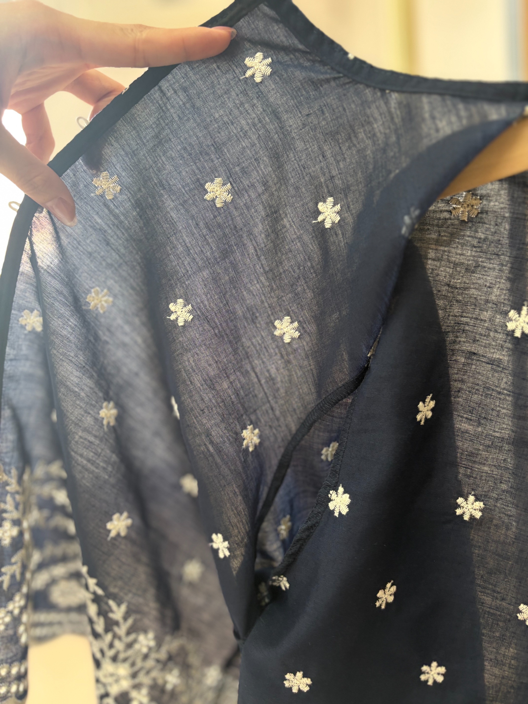 下单3-7天发货!LONGNVFAIR 藏青色撞白满天星刺绣花边上衣/奶油色花瓣半裙套装 一眼沦陷的东方雅致 梨形身材遮肉显瘦 温柔清冷国风穿搭