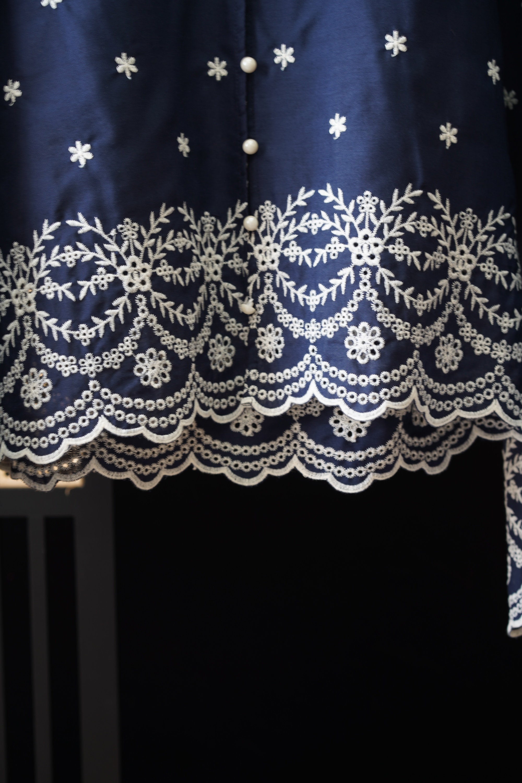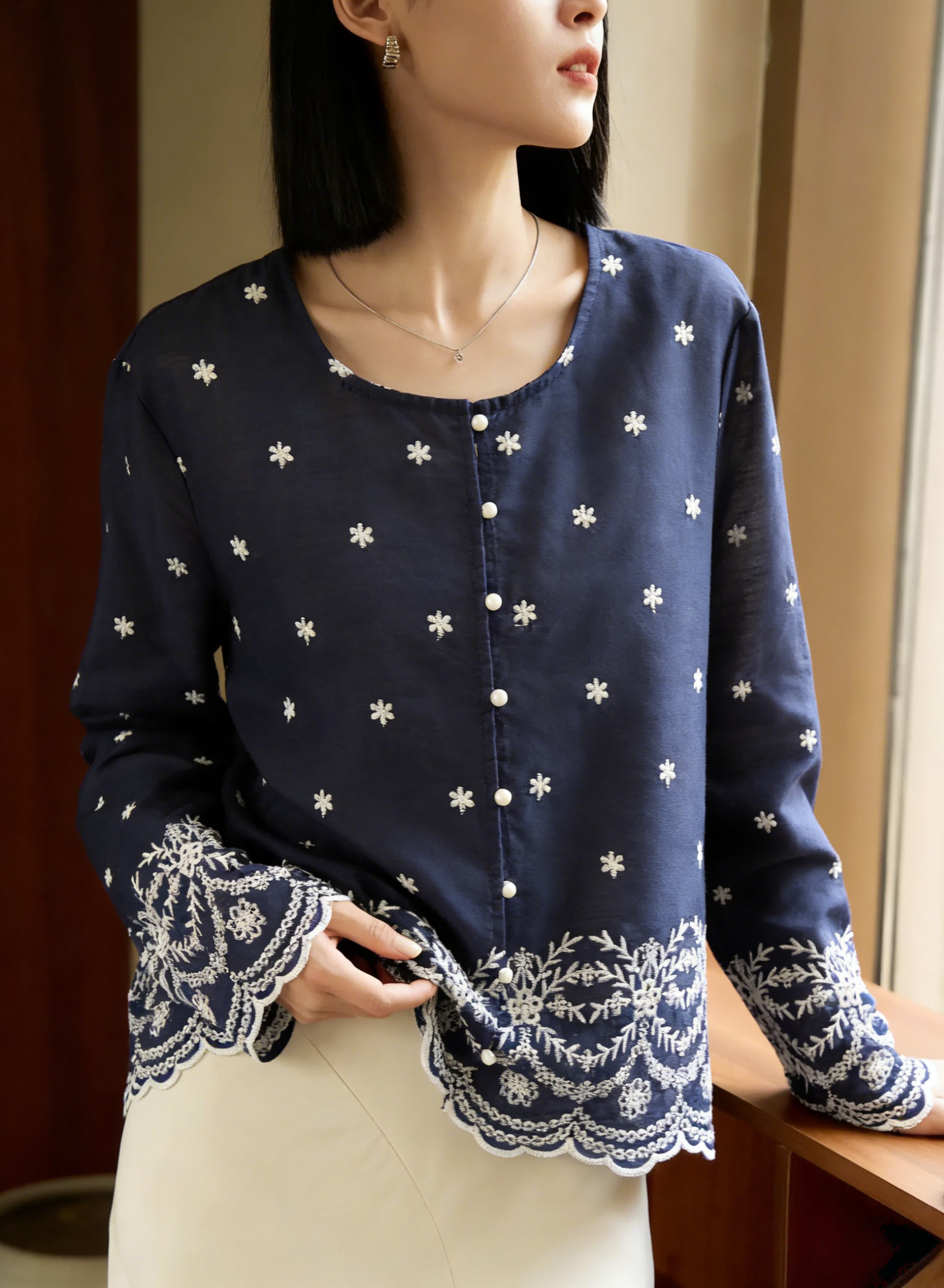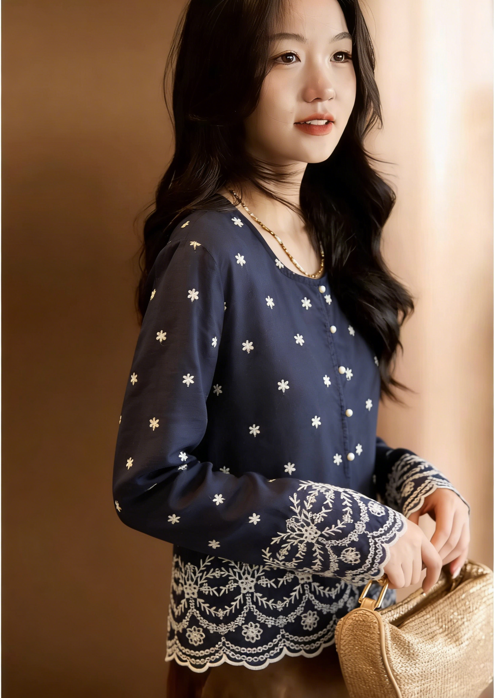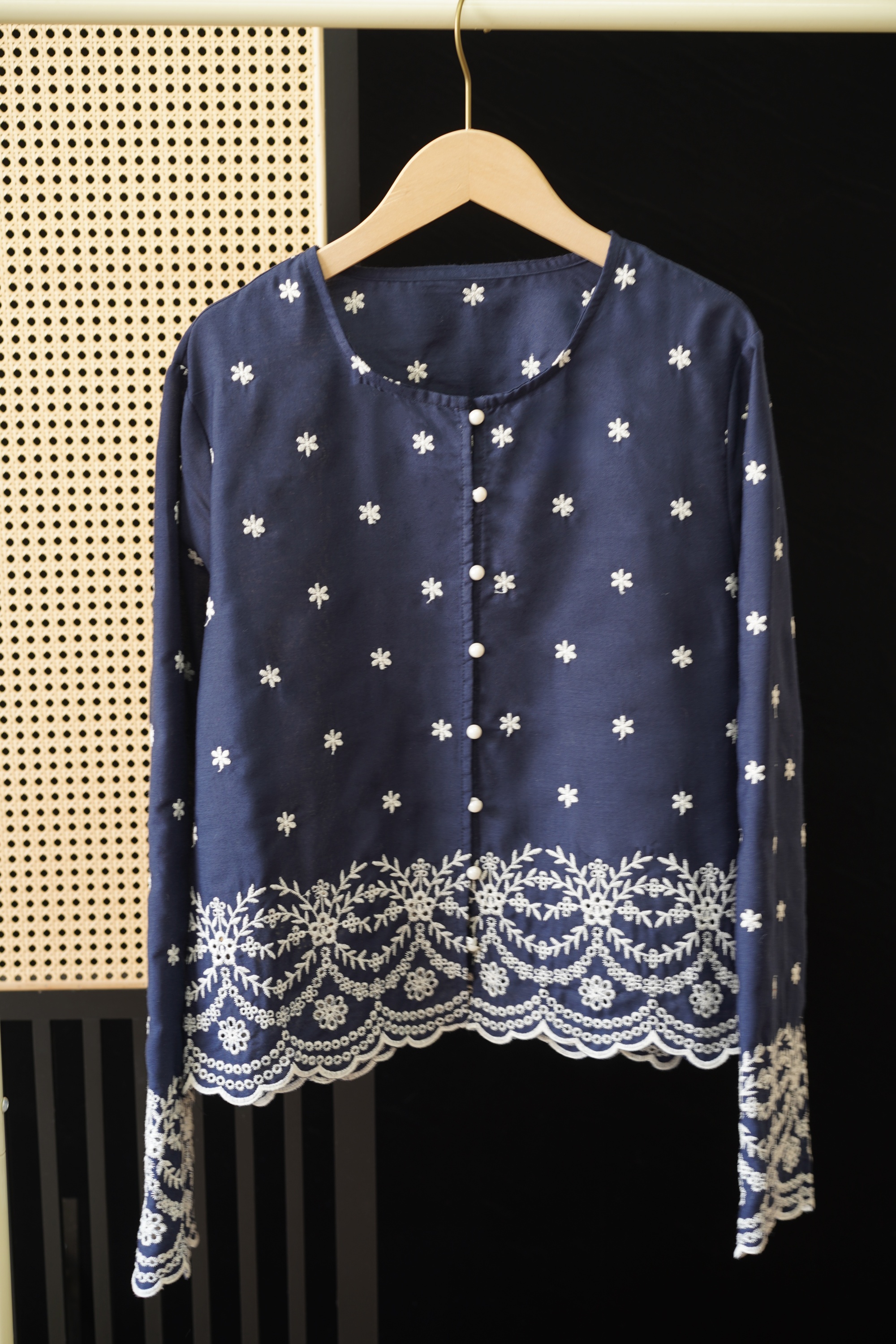 藏青色撞白满天星刺绣花边上衣:棉50% 涤纶50%