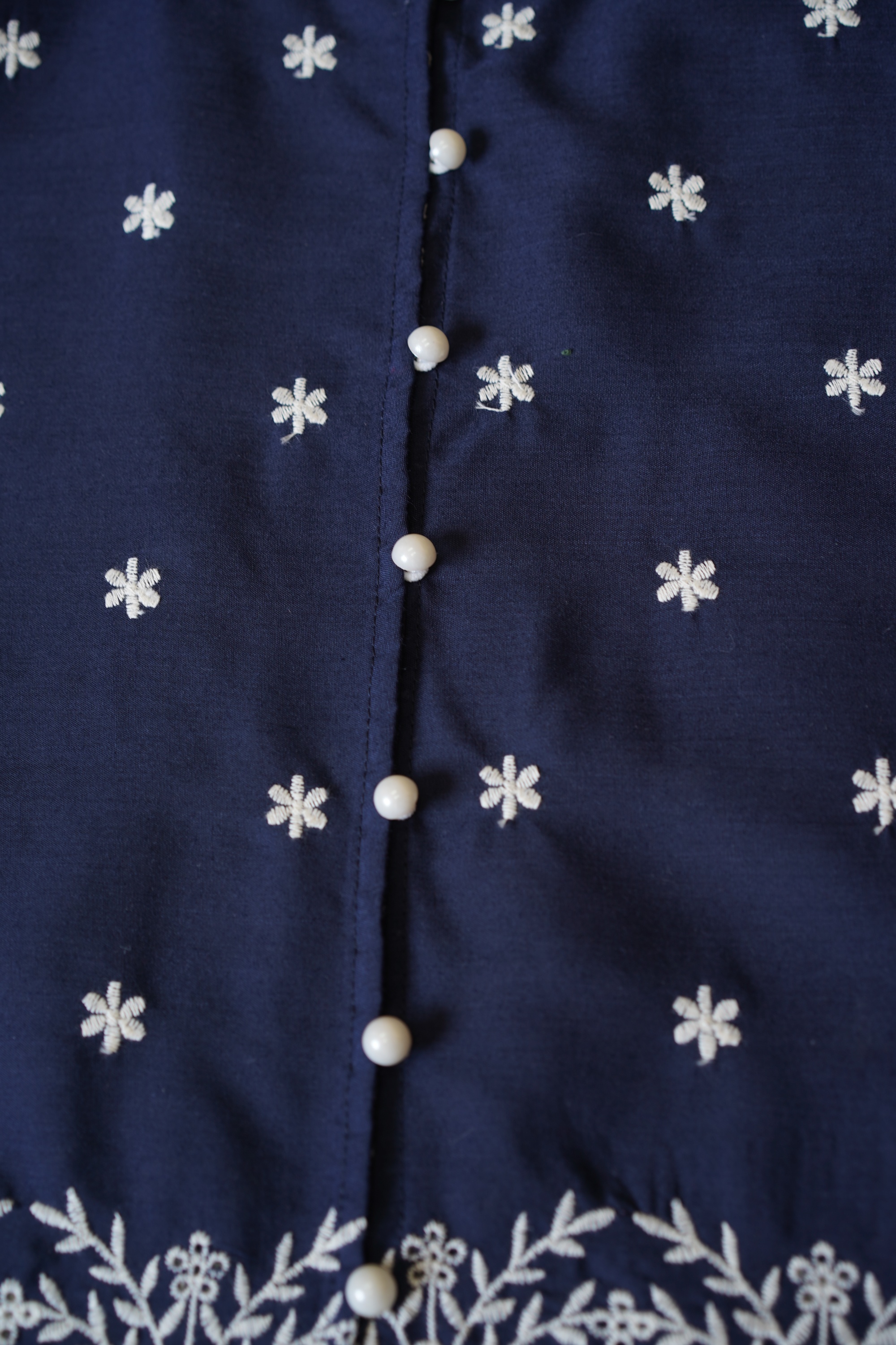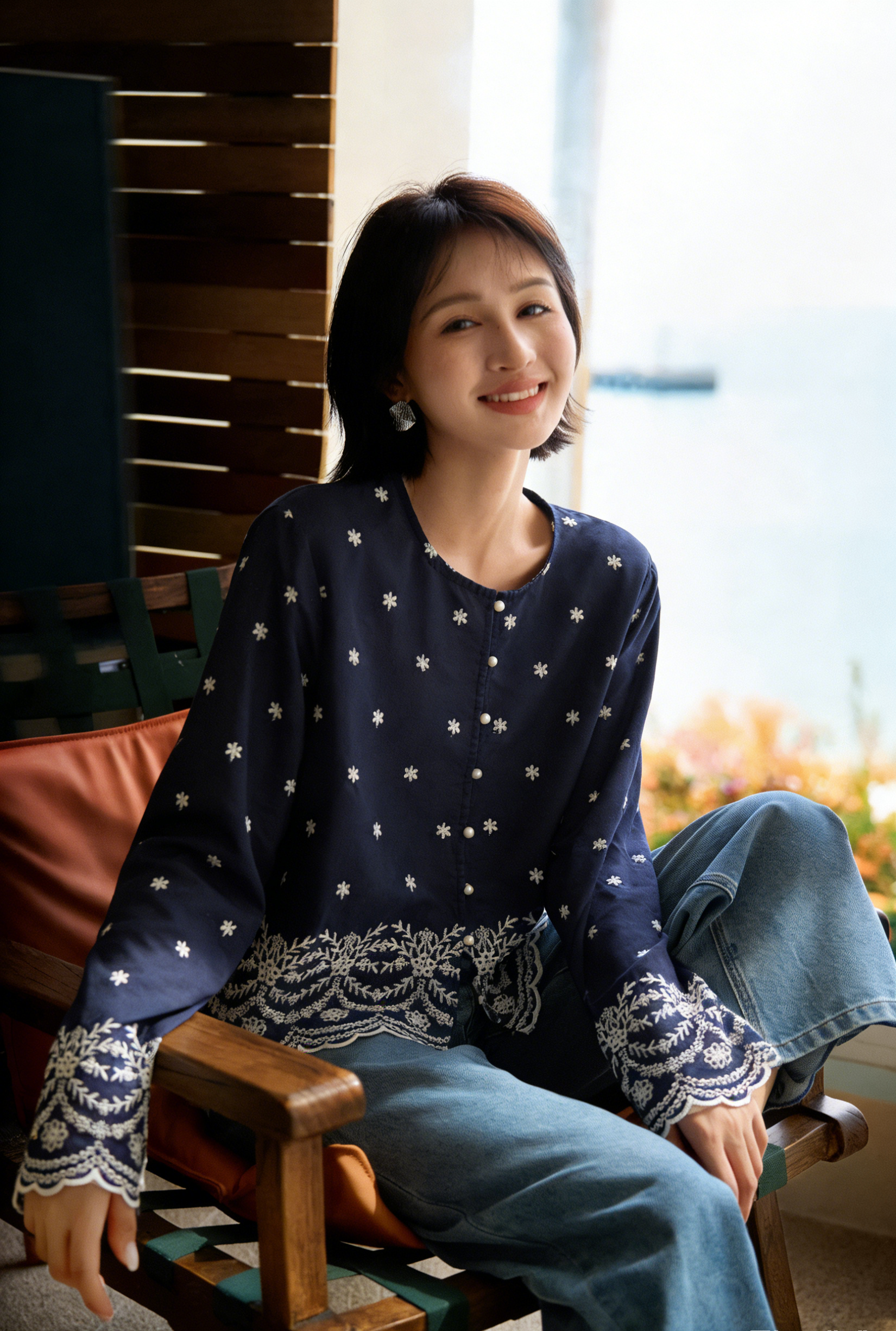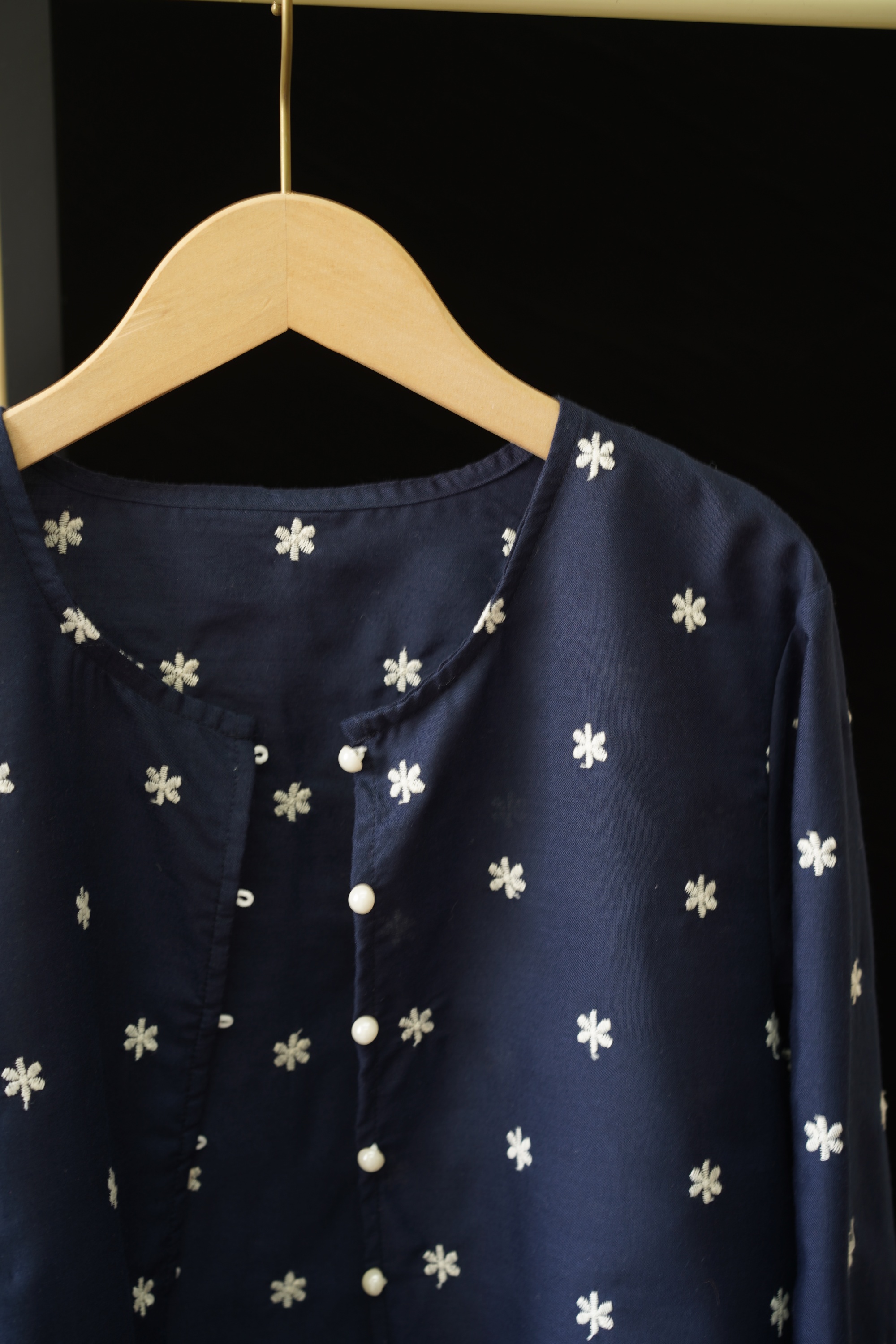 藏青色撞白满天星刺绣花边上衣:棉50% 涤纶50%