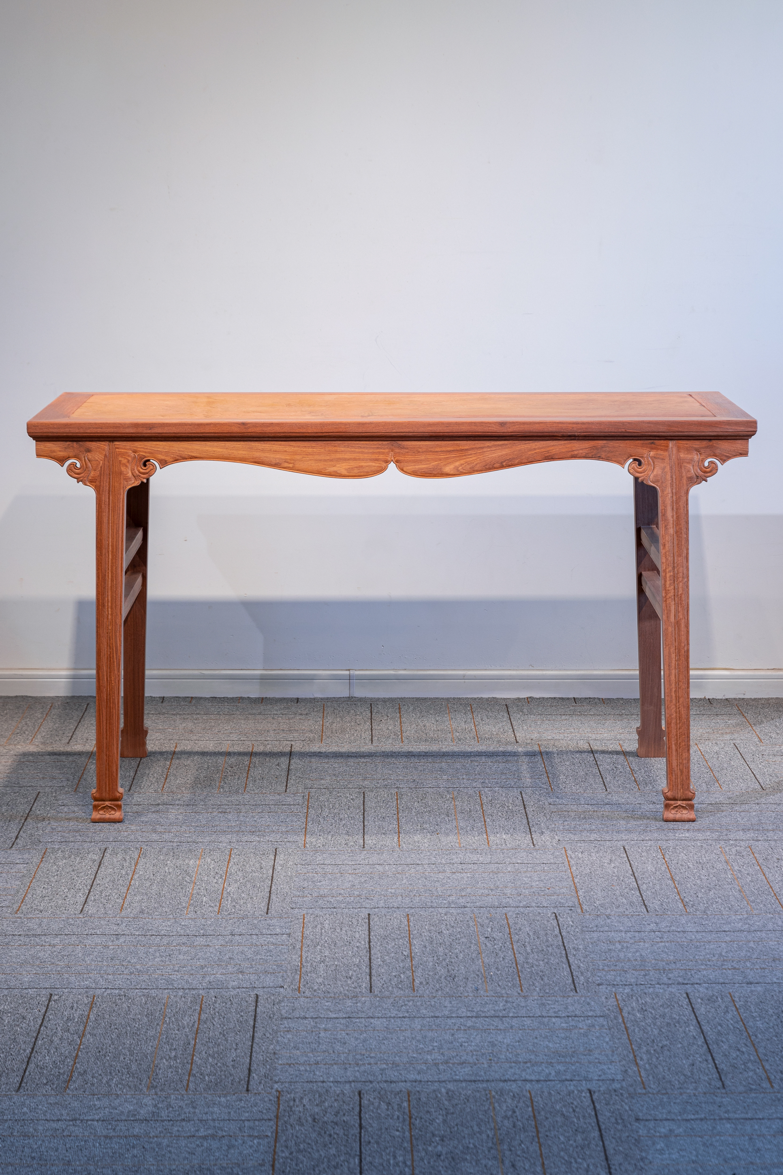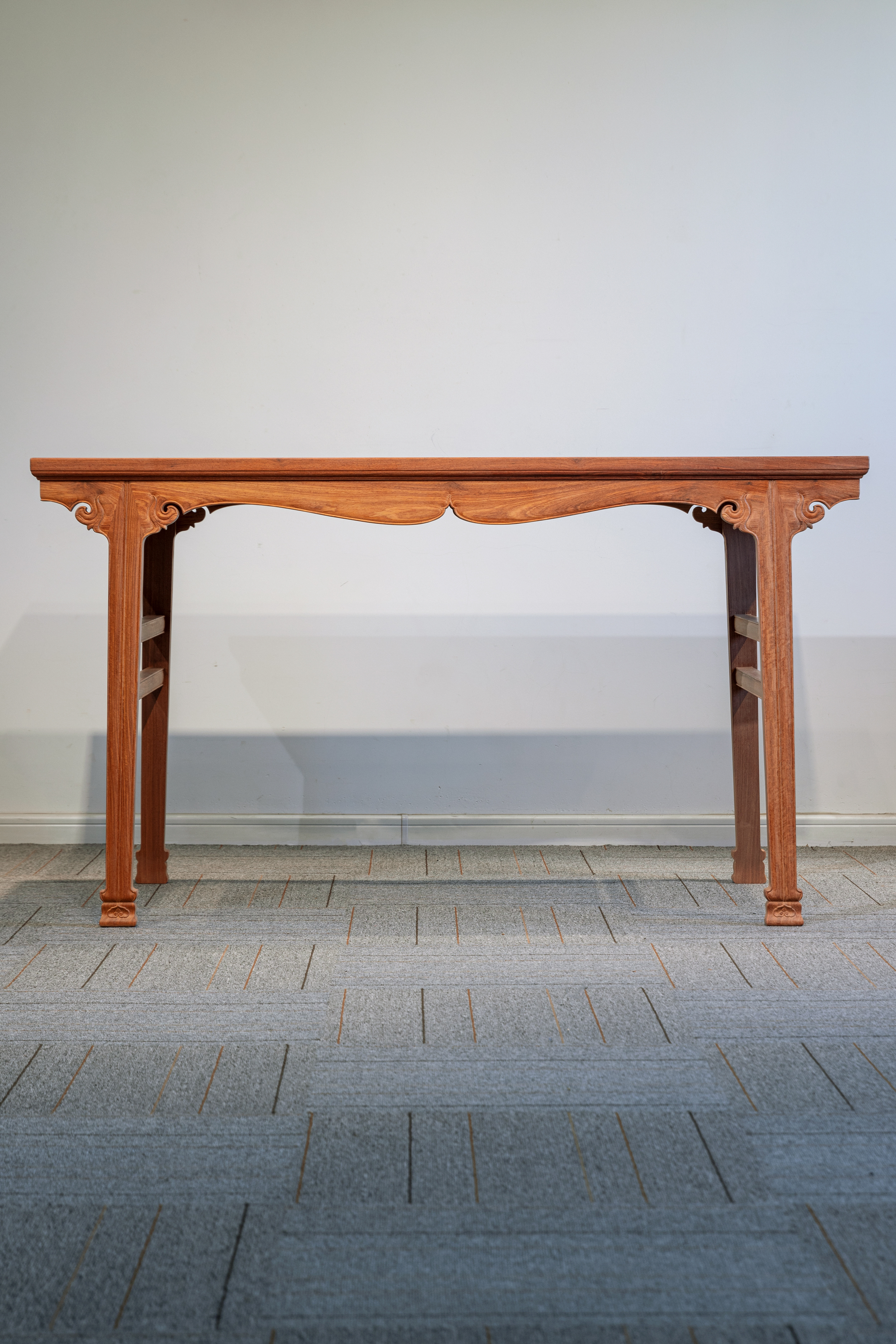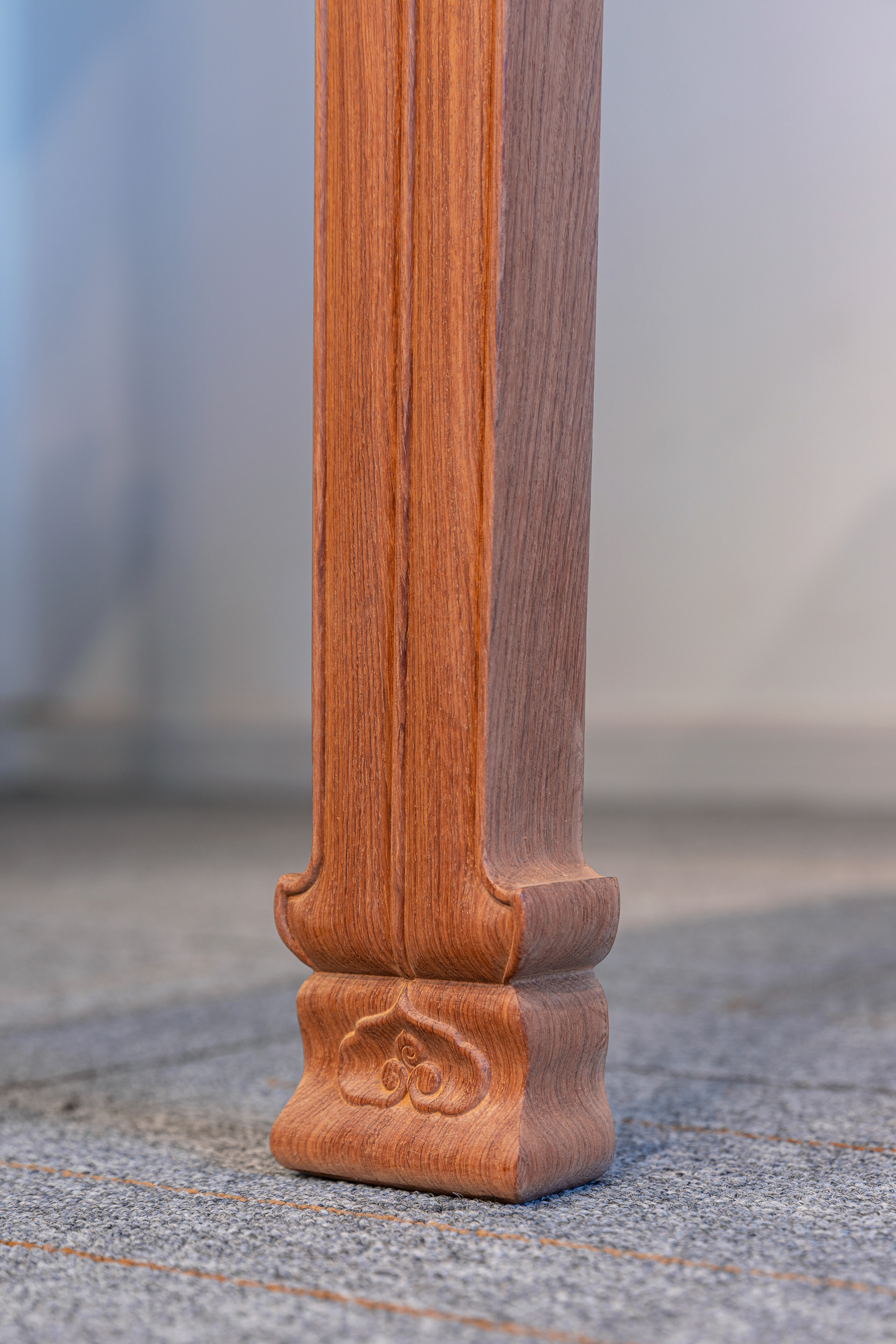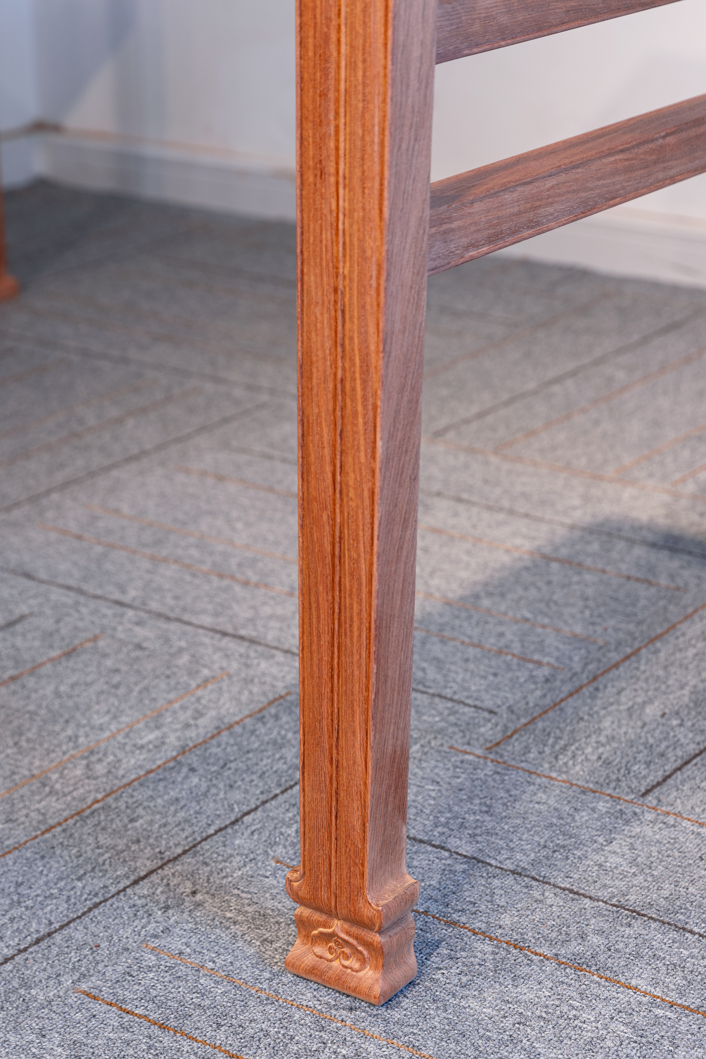 腿足挓度明显,之间设矩形梯子枨,梯子枨起素混面双压边线。腿足底端外撇为花叶状璞足,下方略近覆钟,其上浮雕一灵芝状如意云头,甚为生动,云头牙尖衍生为一炷香线,直贯腿足,插向云顶,挺拔刚劲。