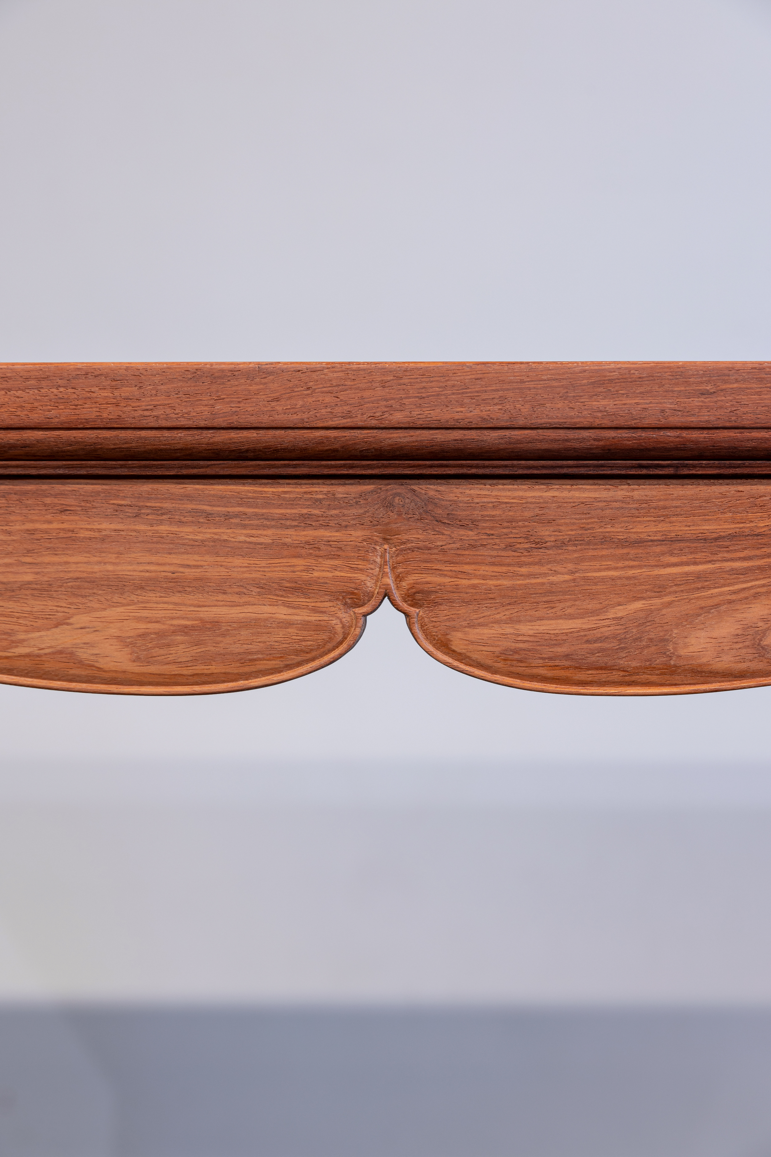 画案,整体俊逸健朗,落落大方,比例适宜。桌面攒框,侧面冰盘沿台阶式,下方微弧面,至底皮条线压边,自然顺畅,案面下穿带出透半榫,这种做法质朴而坚实,与之相应的大边亦为半透榫做法。牙板挖壸门,曲线柔和,跌宕起伏,人字形出尖两侧垂下较多,是早期软木家具的风格。