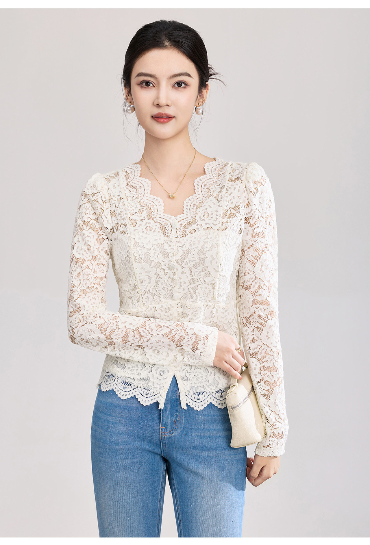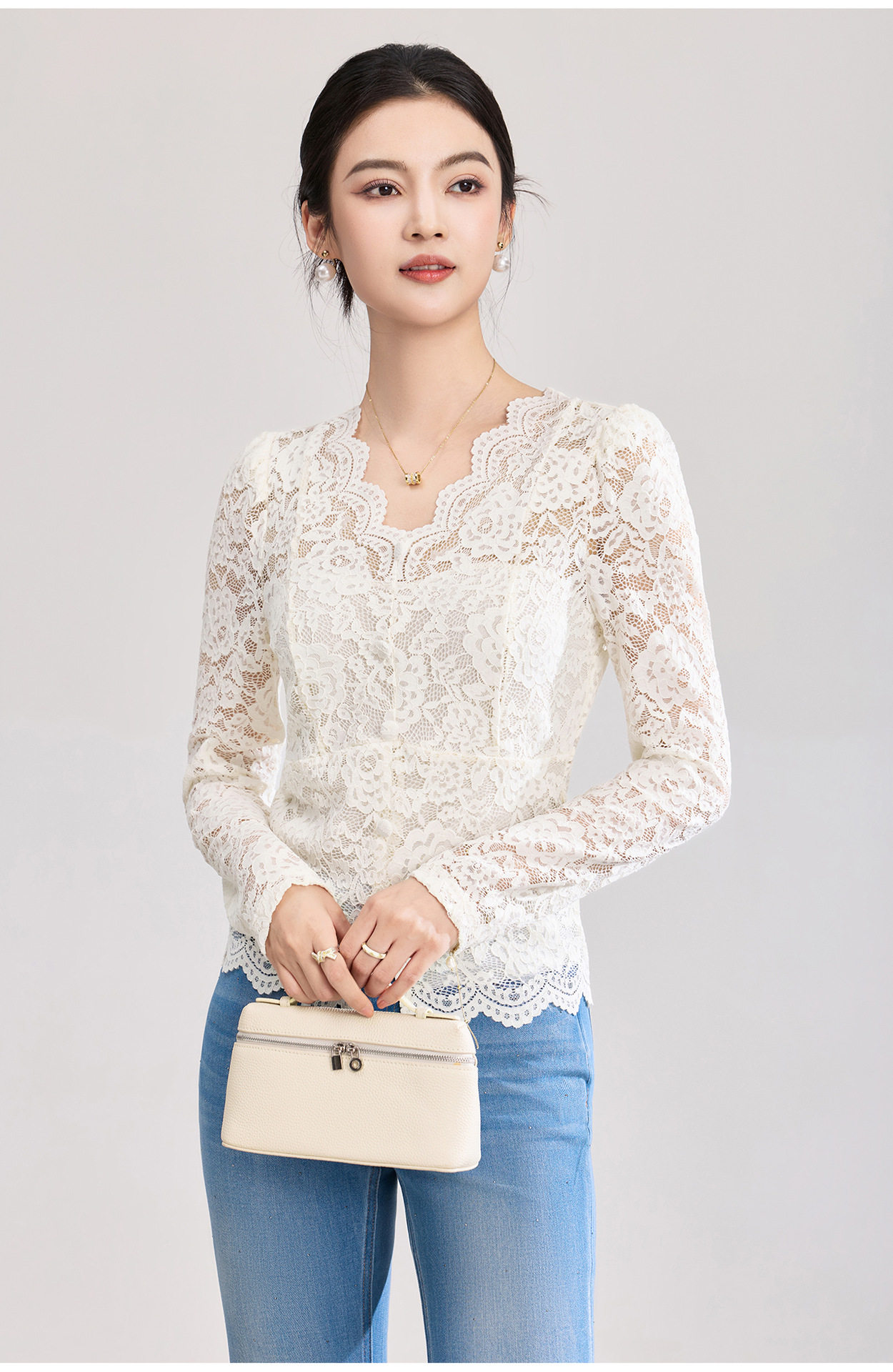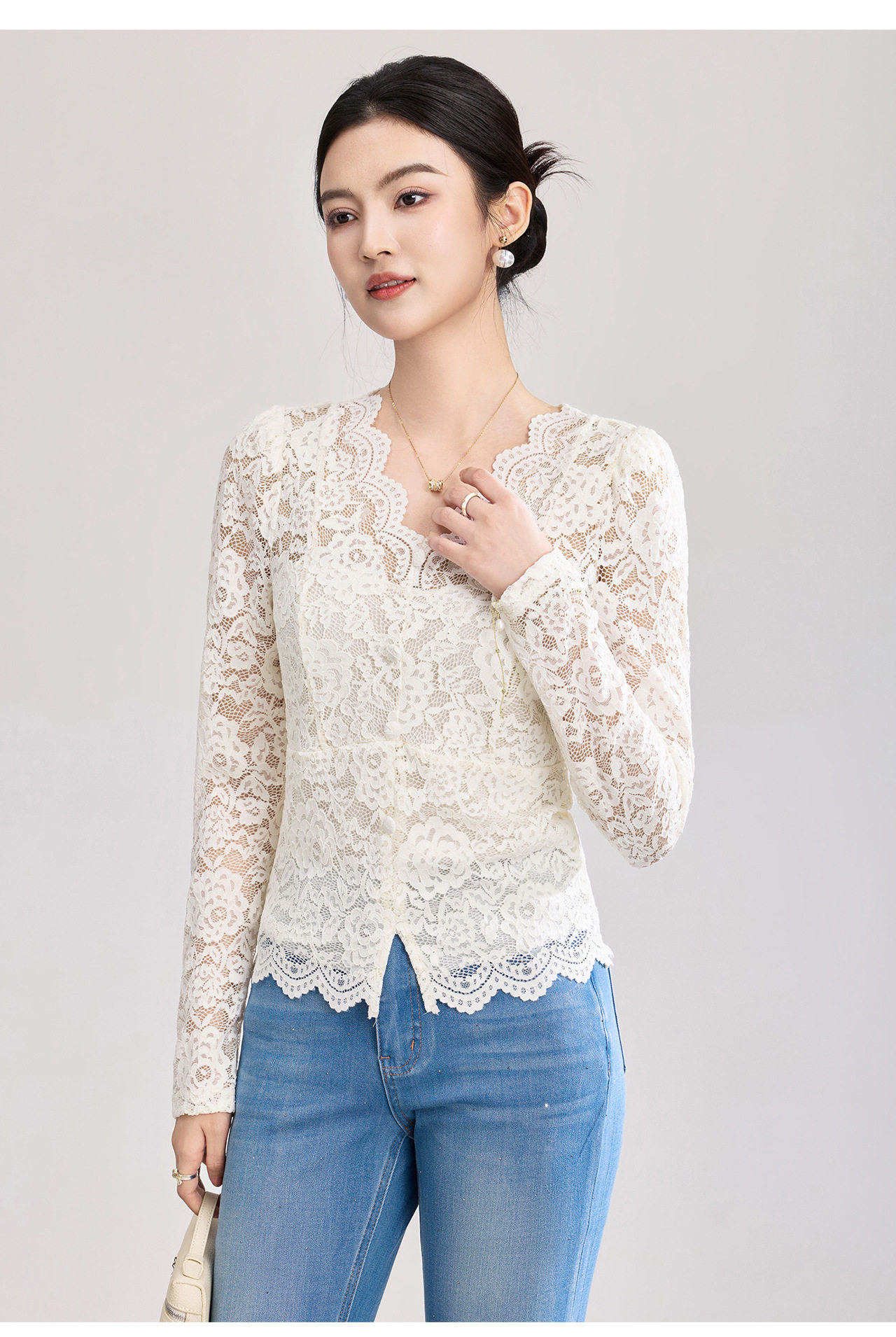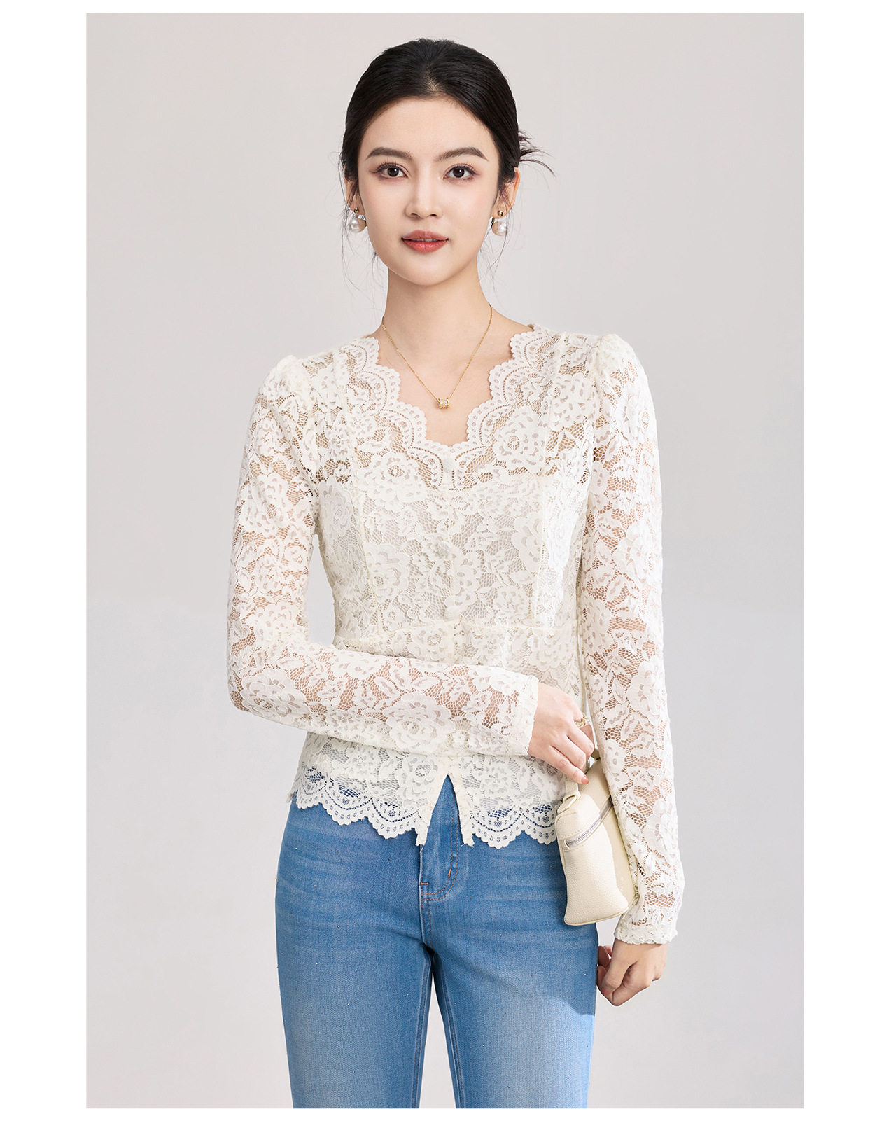 「高货wl」全新升级【铂金会员174/天猫229/差价55】(02155)洛诗琳法式刺绣蕾丝打底衫女2026春夏气质镂空蕾丝V领上衣