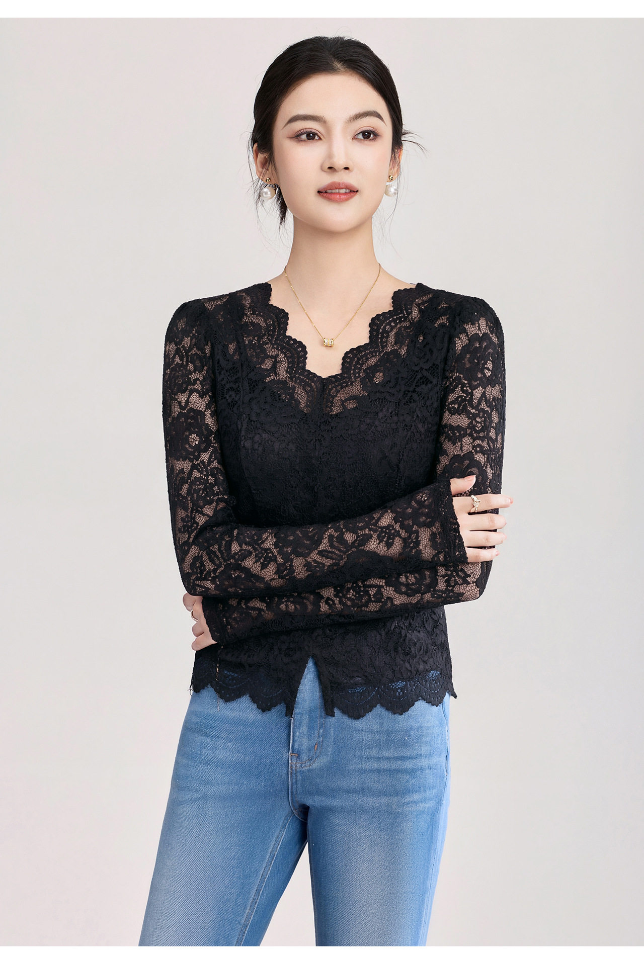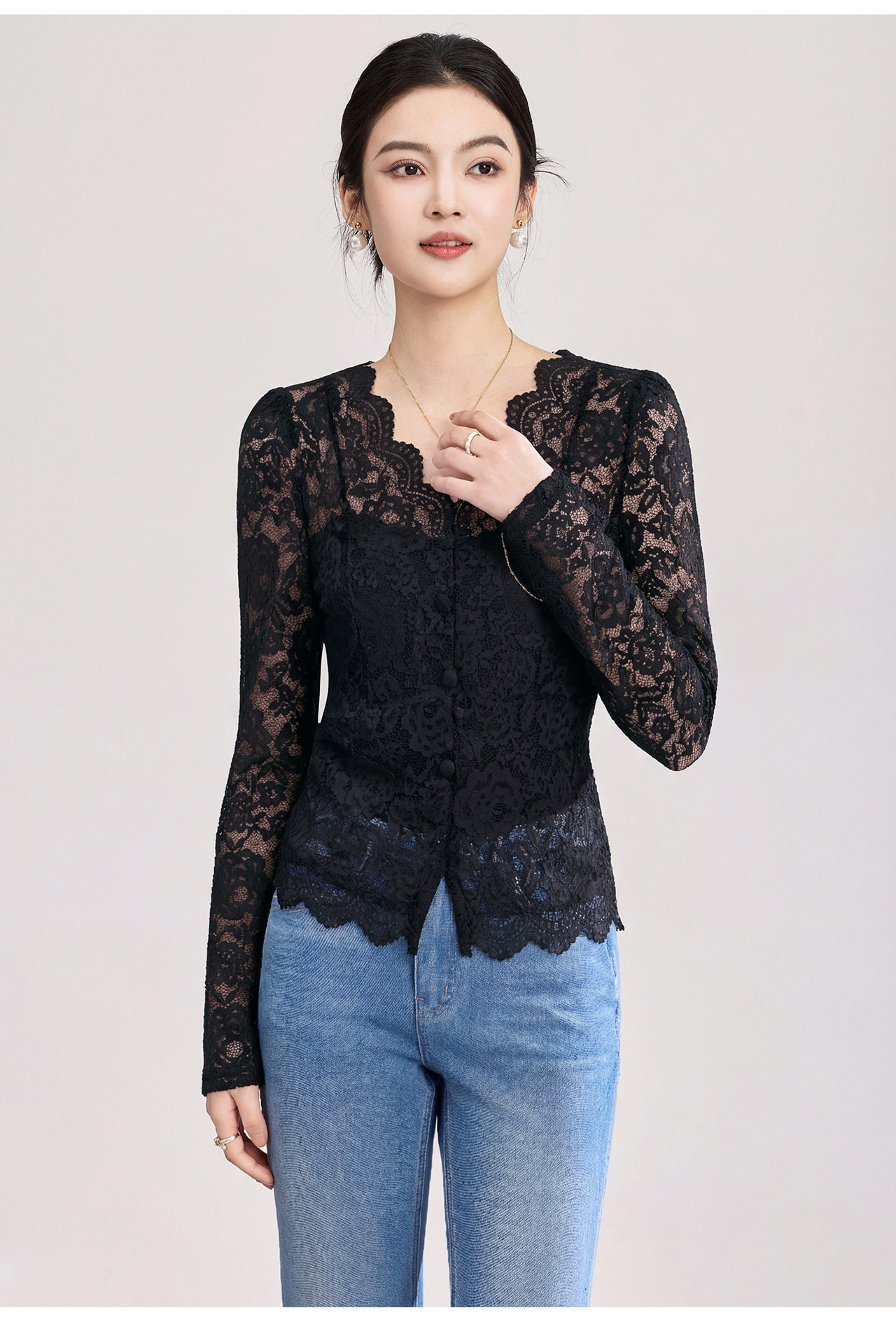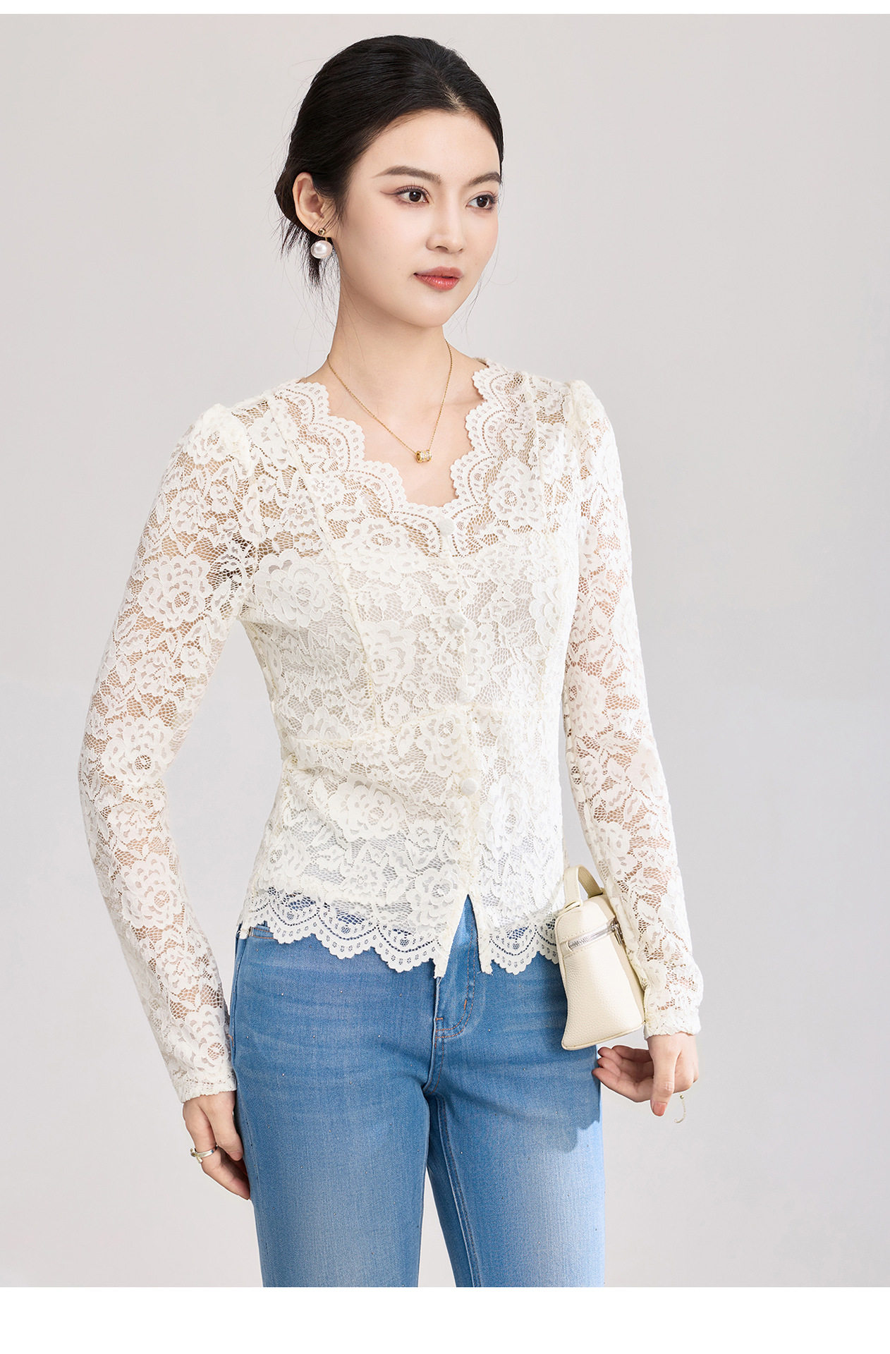 「高货wl」全新升级【铂金会员174/天猫229/差价55】(02155)洛诗琳法式刺绣蕾丝打底衫女2026春夏气质镂空蕾丝V领上衣