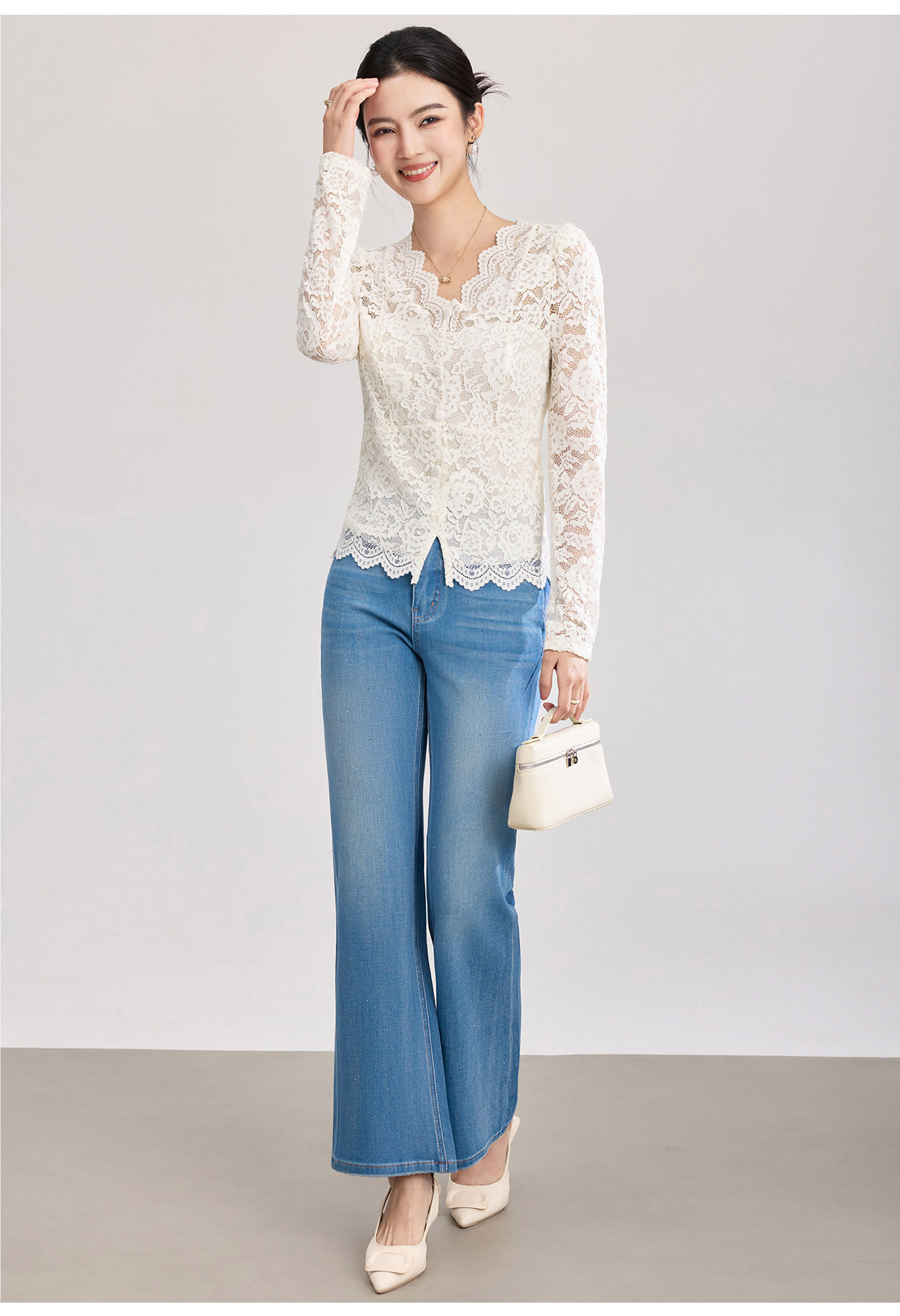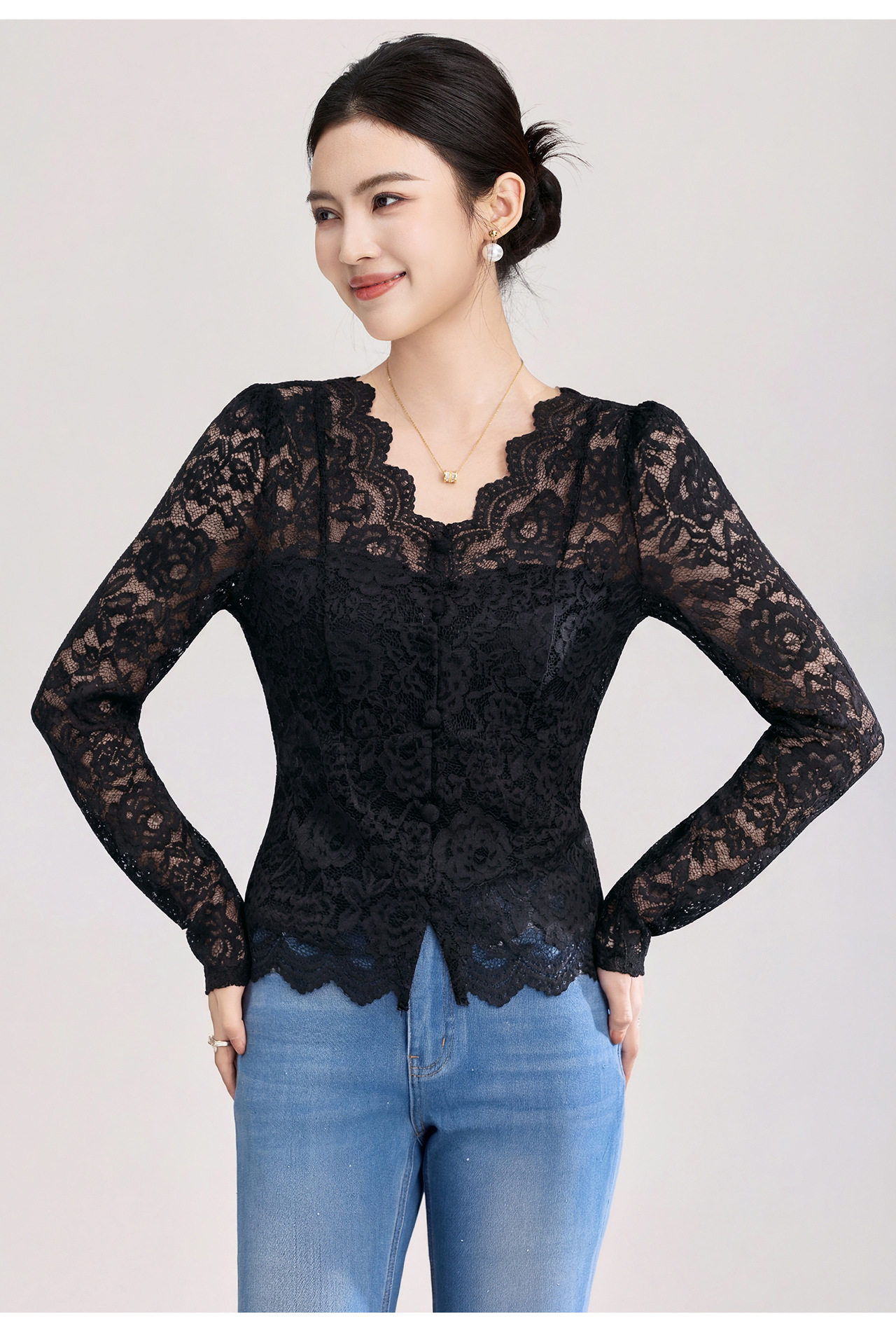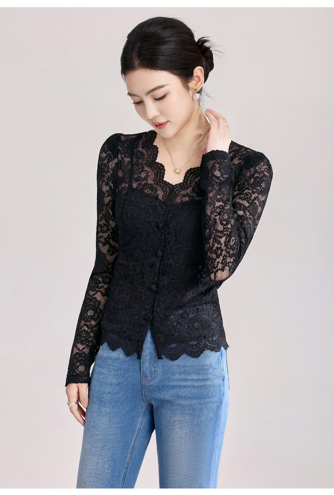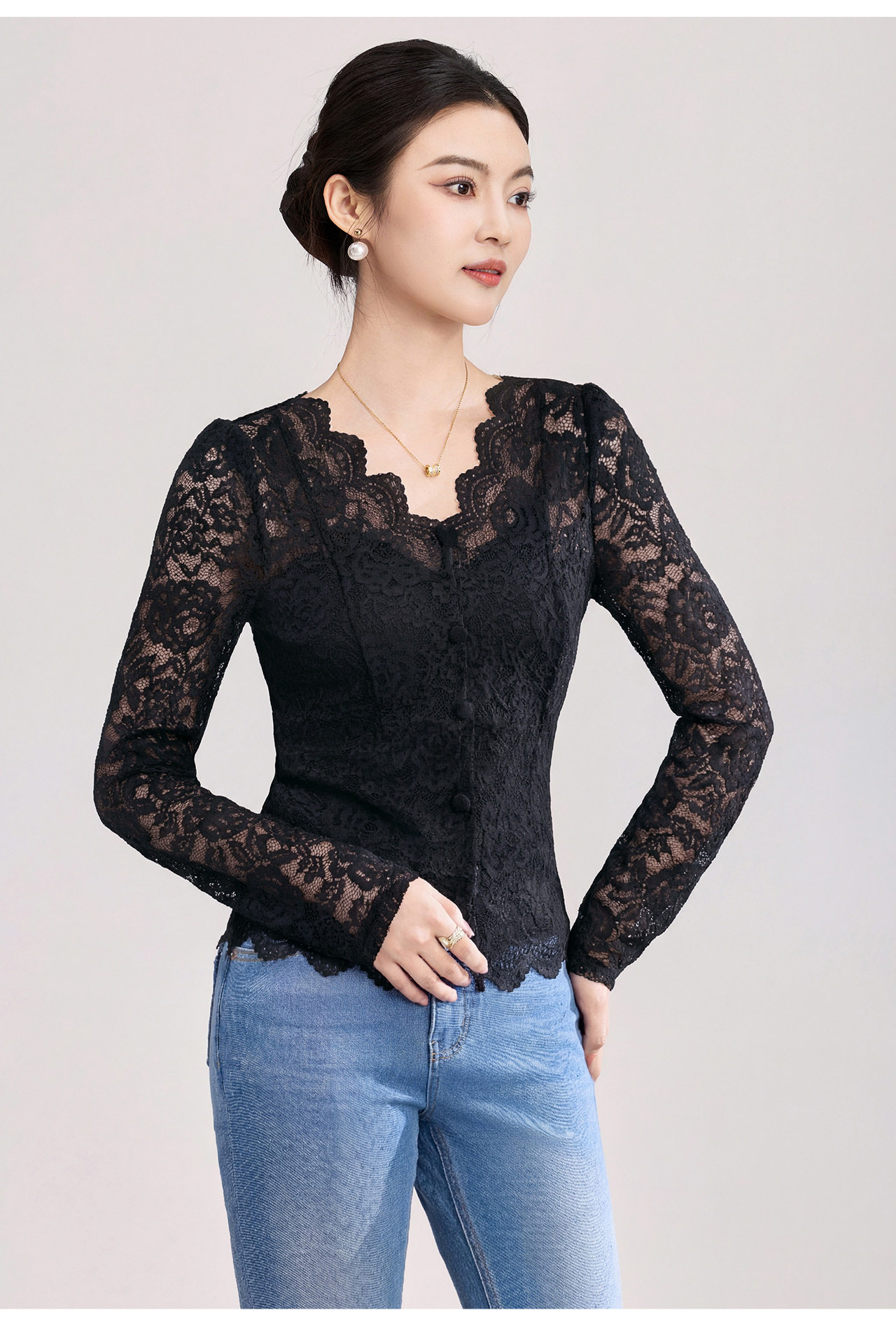 「高货wl」全新升级【铂金会员174/天猫229/差价55】(02155)洛诗琳法式刺绣蕾丝打底衫女2026春夏气质镂空蕾丝V领上衣