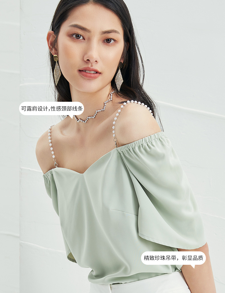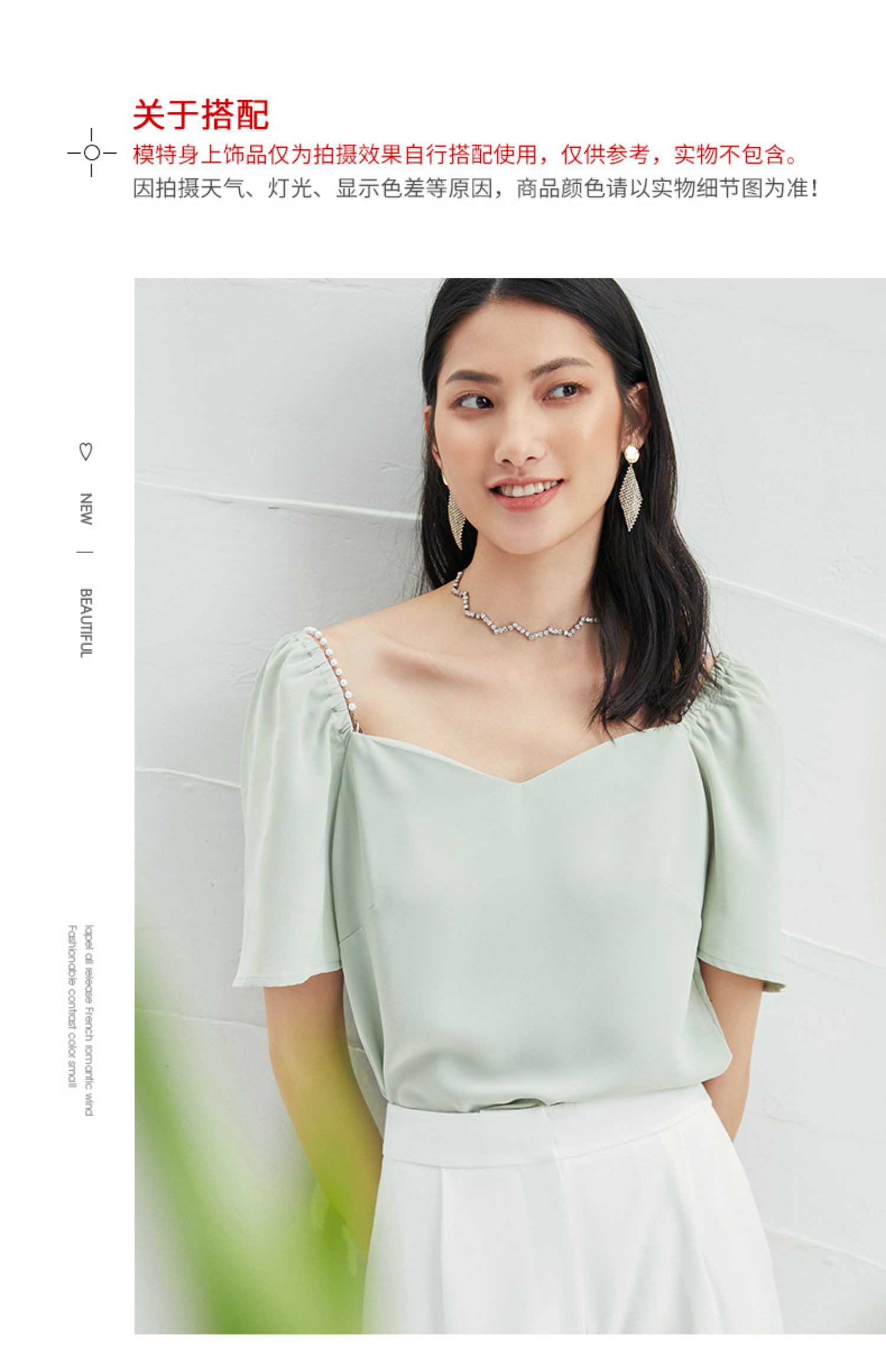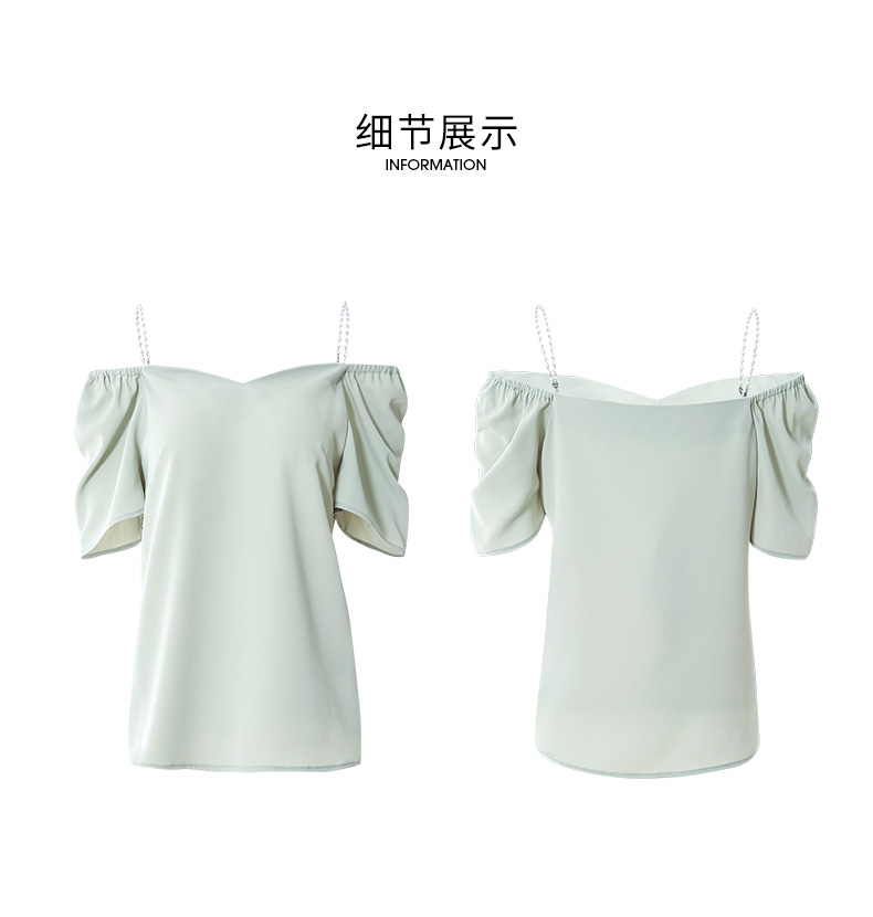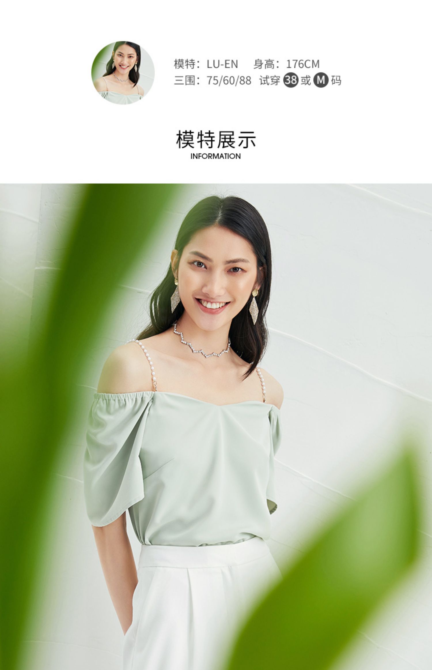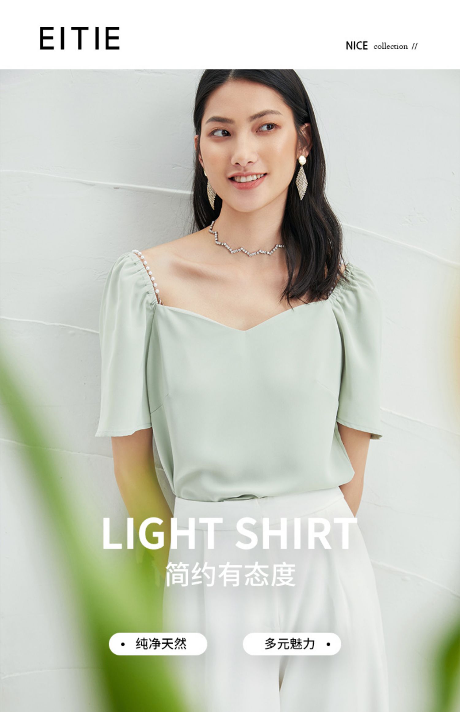 EITIE爱特爱夏新款通勤显瘦直筒短款一字肩泡泡袖雪纺衫上衣B2213910
