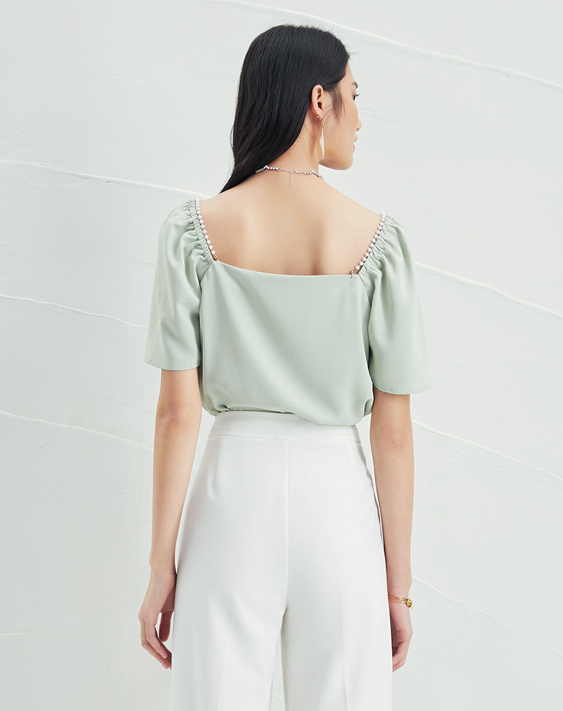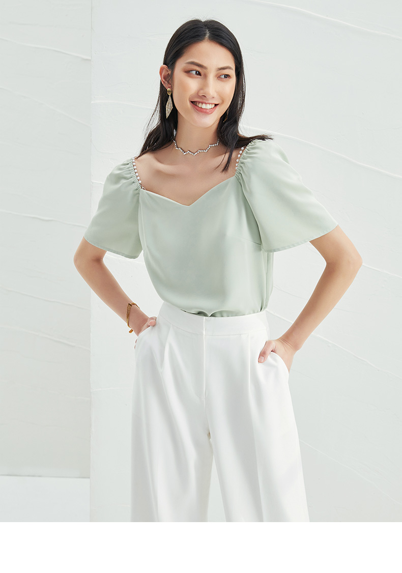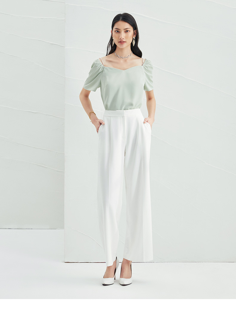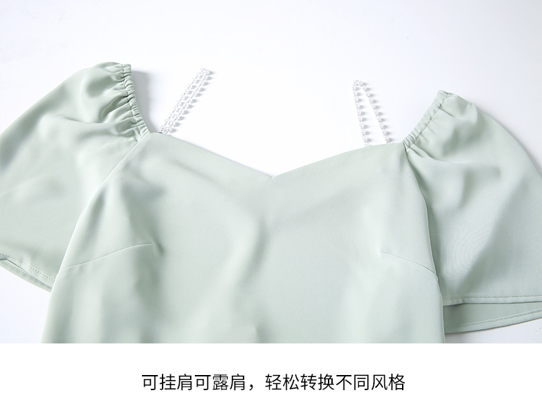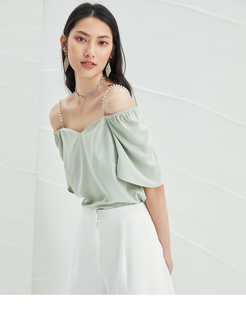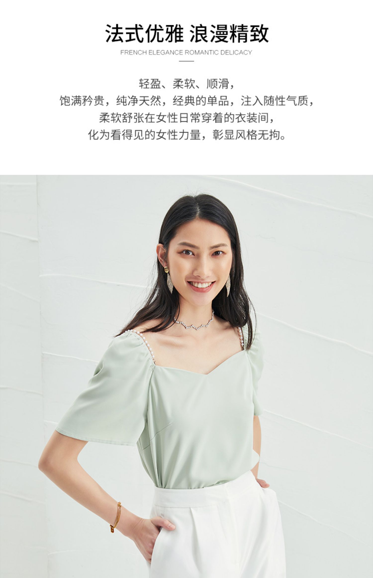 EITIE爱特爱夏新款通勤显瘦直筒短款一字肩泡泡袖雪纺衫上衣B2213910