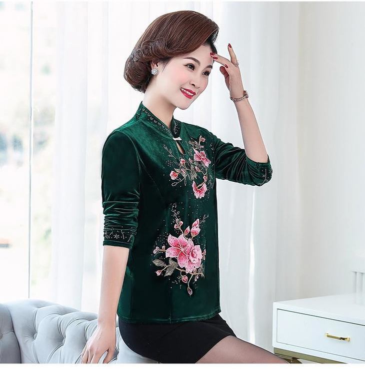 NP-妈妈装春秋金丝绒长袖T恤上衣中老年女装旗袍领秋装上衣打底衫