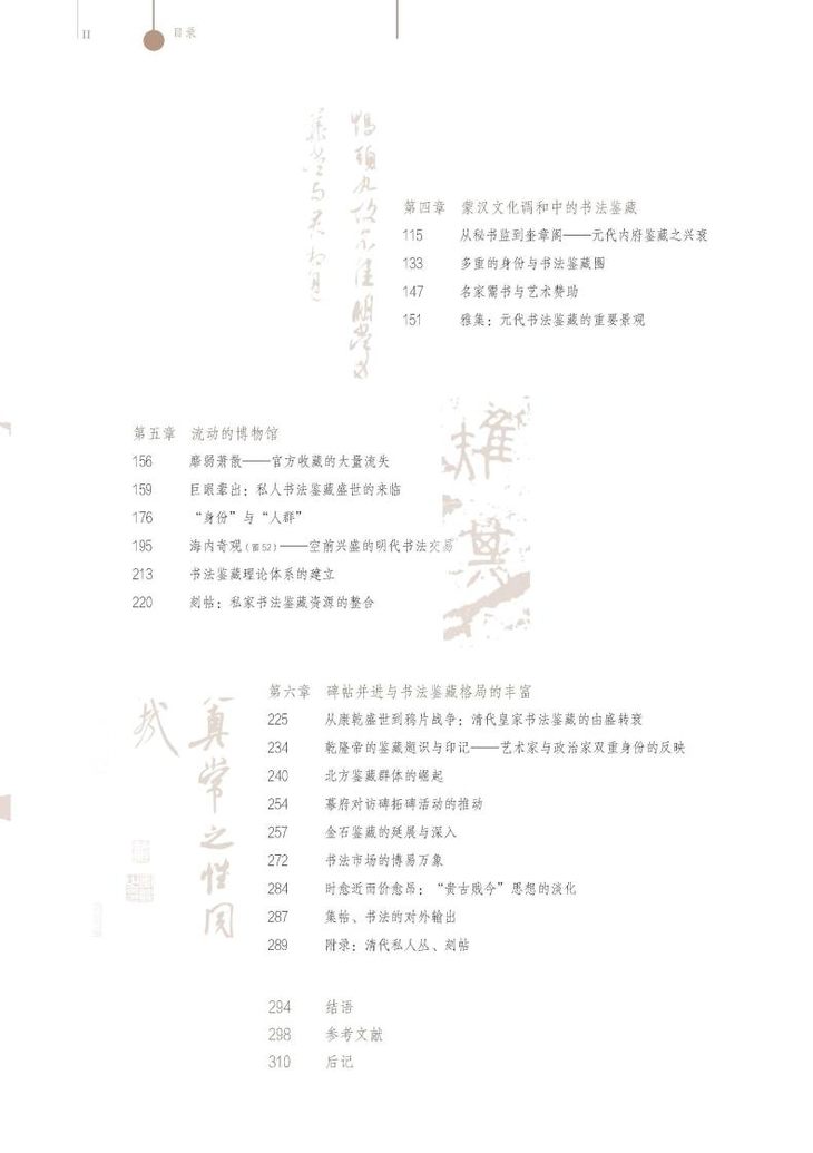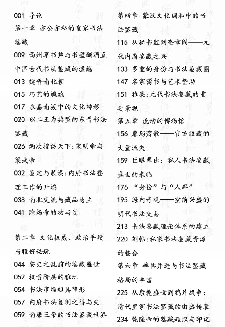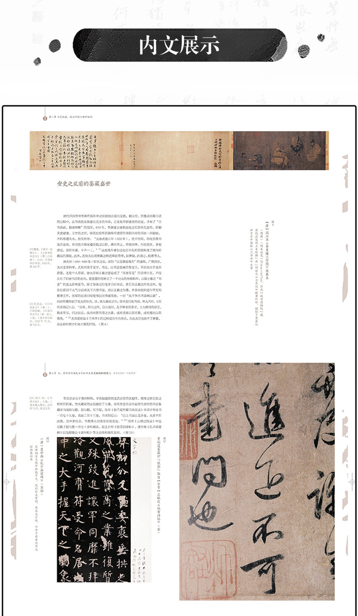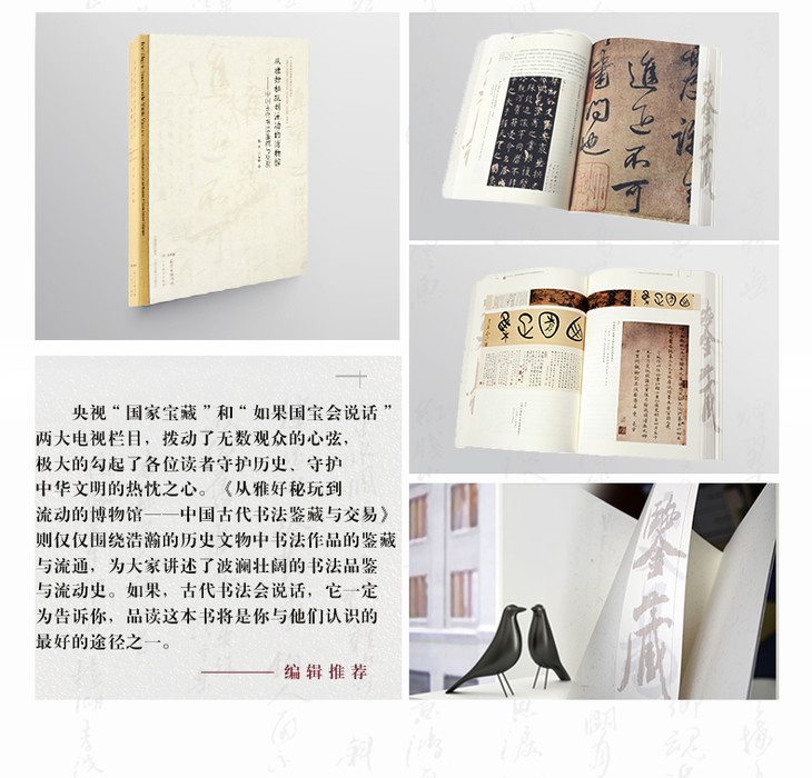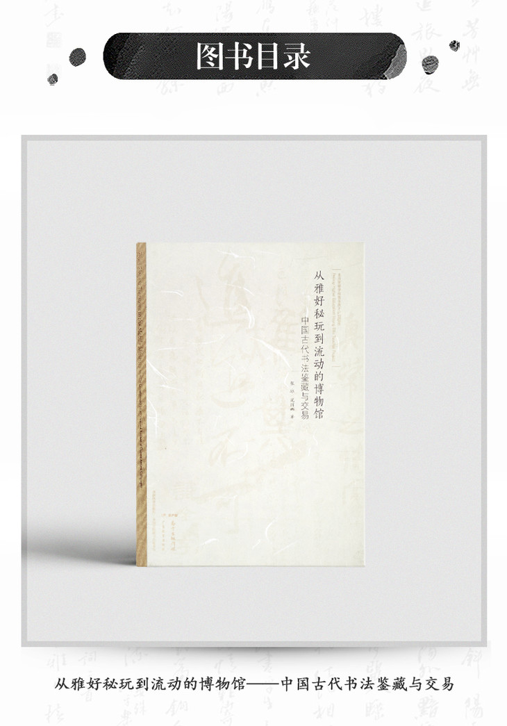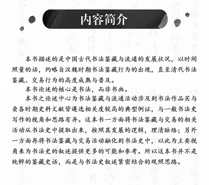 本书综览汉至清末上下千余年的书法鉴藏与交易史,规模宏阔,内容充实。作者一方面在正史、书画著录、题跋及笔记等各种文献中发掘一手材料,另一方面采纳了近年来学界的个案研究成果,使全书既有丰富的细节,亦有宏观的视野。本书不仅适合作为古代书画鉴藏史的入门书籍,对于已在此领域耕耘的研究者来说,其综览视域亦将有助于新课题的开发。