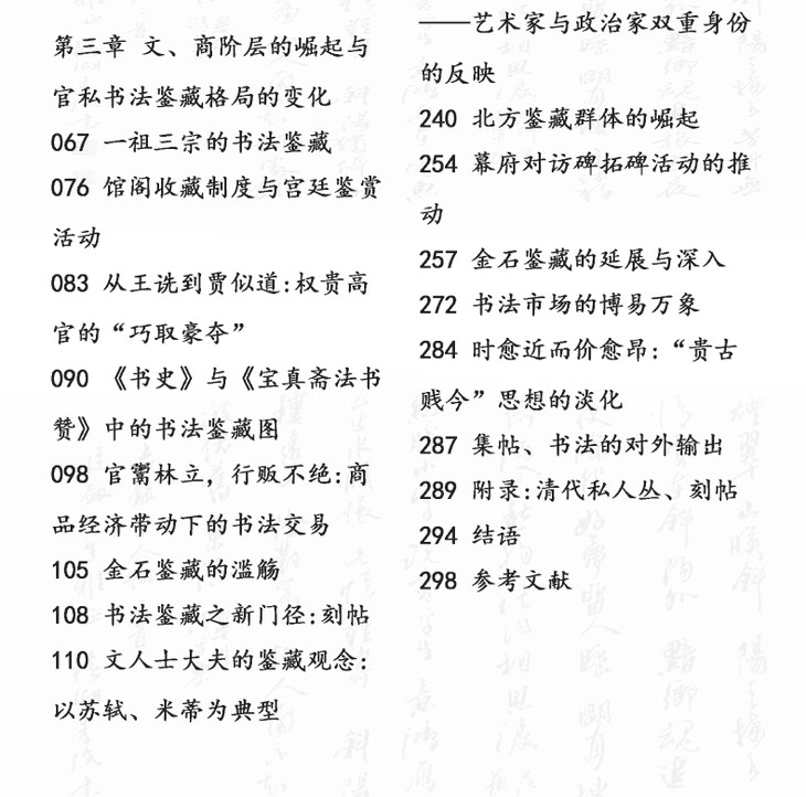 由于时间的关系,目前相关书法鉴藏史的成果多见于个案和断代,通史则如凤毛麟角。两位博士有鉴于此,提出了这份研究成果,意图为我们勾勒古代书法鉴藏史的总体景观。从朦胧的鉴藏意识与行为的寻找,到逐渐完整的鉴藏体系与交易模式的总结,他们初步构建了关于书法鉴藏史的宏大叙事模型。同时,为了避免宏大叙事容易导致的空疏,作者采用了通史加专题的写作思路,选取不同时代具有代表性的典型问题配合官私收藏与交易的梳理,这是十分明智的。