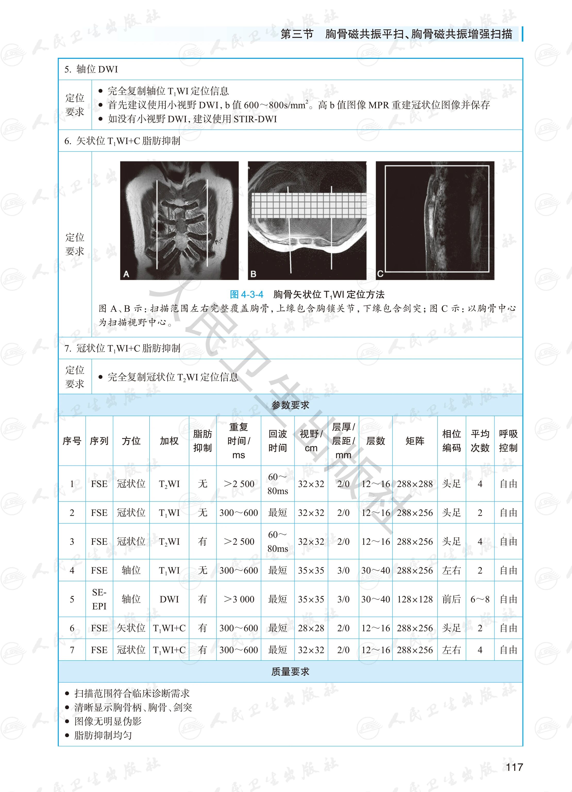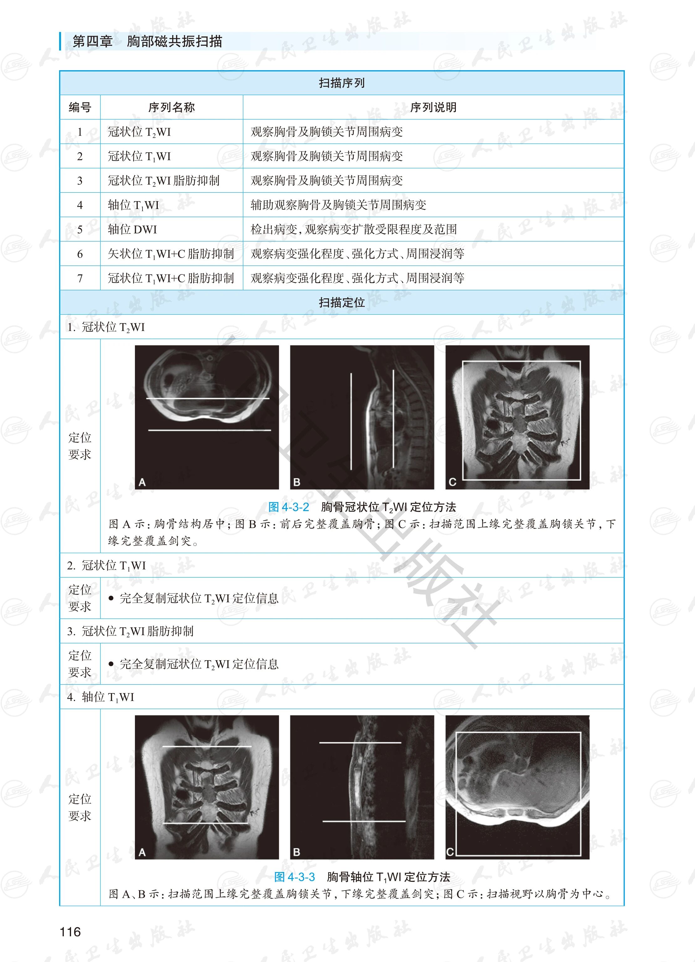 涵盖全身各部位MR检查项目,每个检查项目包括患者准备和摆位、扫描序列、扫描定位、参数要求、质量要求、标准图像示例、伪影图像、特殊注意事项等。