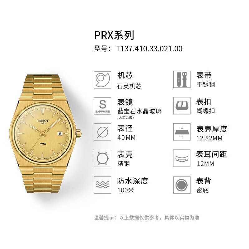 【时计廊】天梭(TISSOT) 瑞士手表PRX超级玩家系列石英表男士腕表 酷飒金盘钢带T137.410.33.021.00