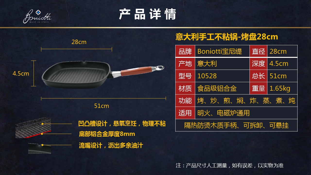 【牛排烤肉必备 可拆卸】Boniotti宝尼缇意大利不粘锅烤盘28cm 木质把手可拆卸