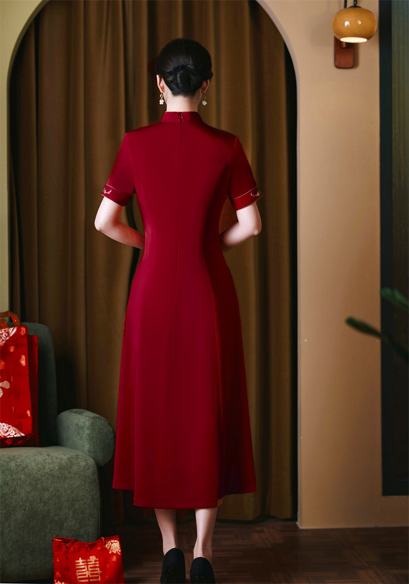 仿醋酸绣花长款旗袍大摆裙,时尚喜妈妈婚宴旗袍裙GX-21683