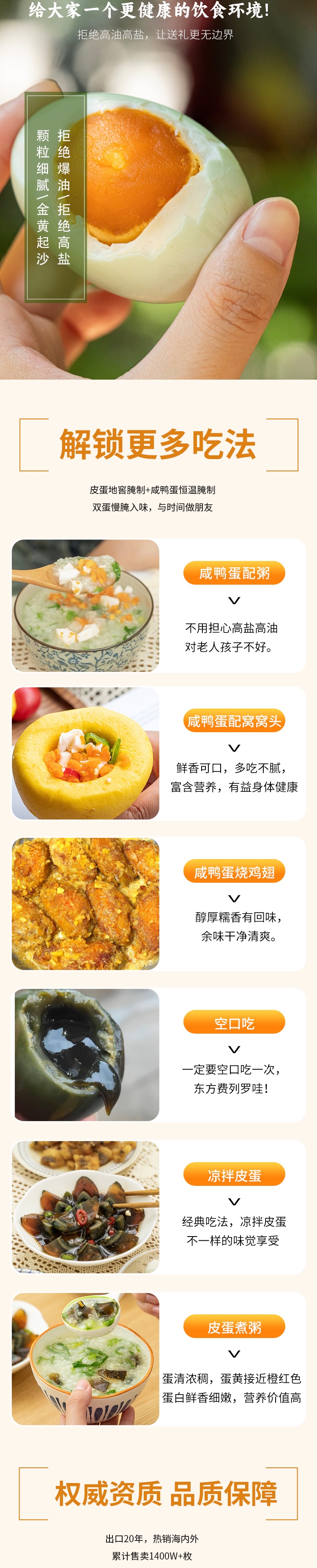 ④每个人口感不一,咸淡标准有区别,东南西北人众口难调。我们已经是用最少的盐去腌制,如果您的口感太淡,时间又放的太长,想要减掉咸度,洗干净用冷水泡半天再来蒸熟。咸度自然减轻。我们的咸鸭蛋反复加热也会流油。
