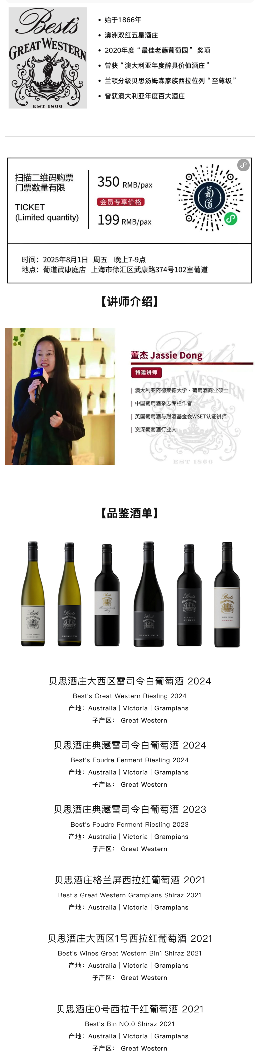 【2025.8.1 武康门票 Wukang Ticket】手慢则无,澳洲酒评圣经盖章认证,双红五星酒庄—贝思酒庄品鉴会
