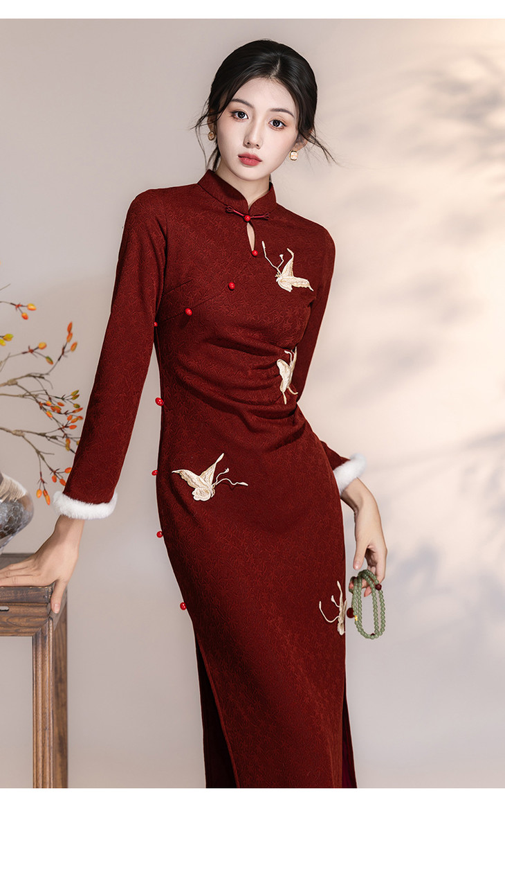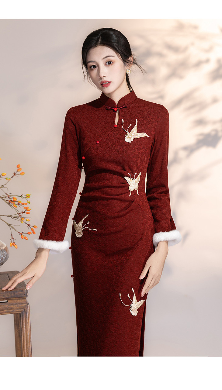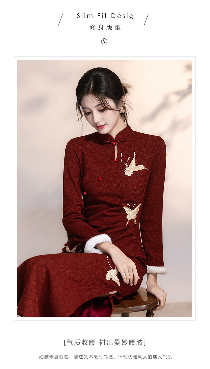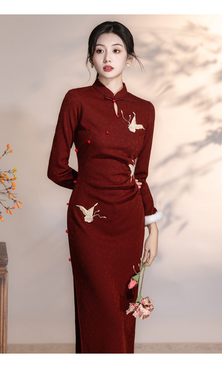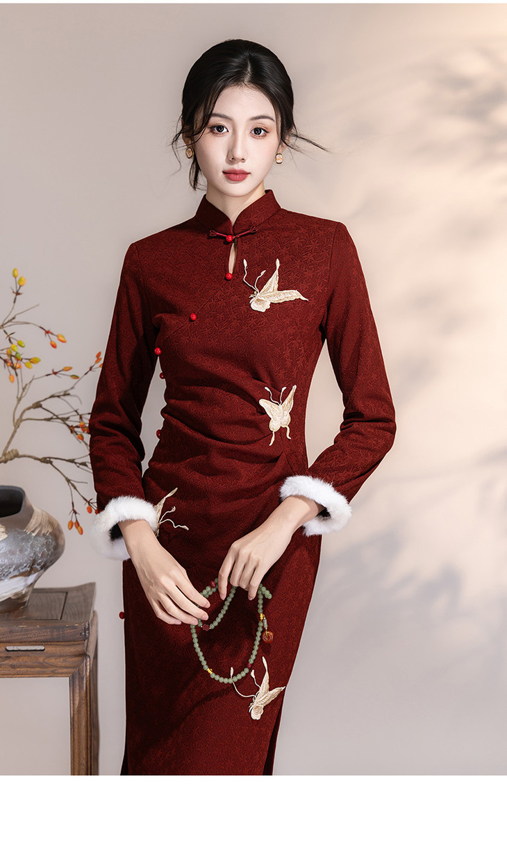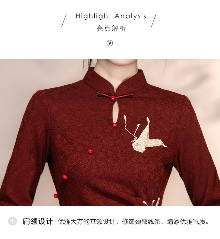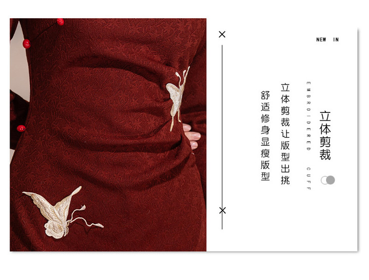 刺绣加绒红色旗袍,新中式订婚礼服裙敬酒服新娘LSB4151
