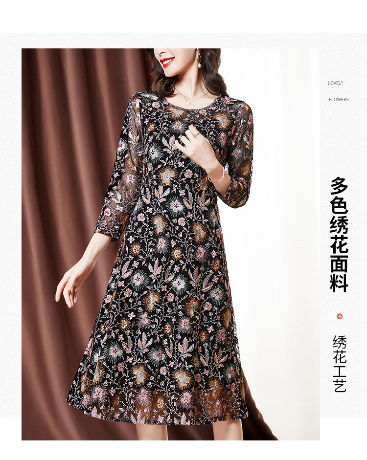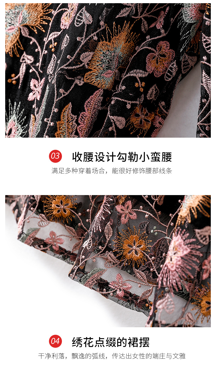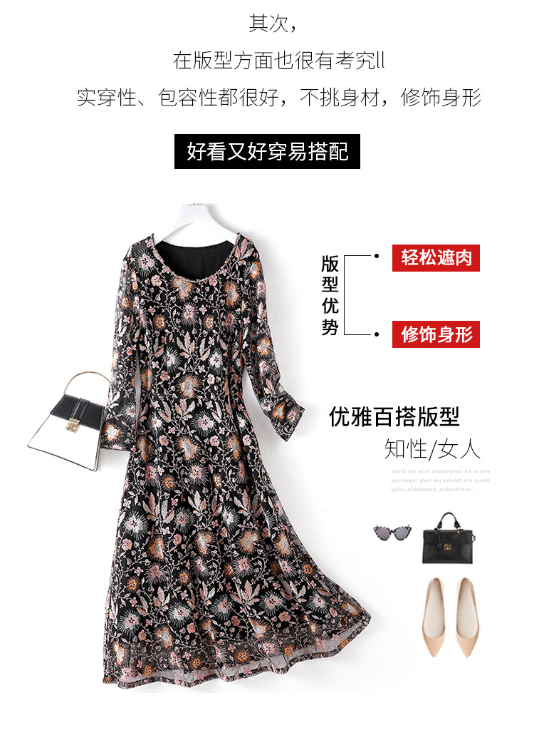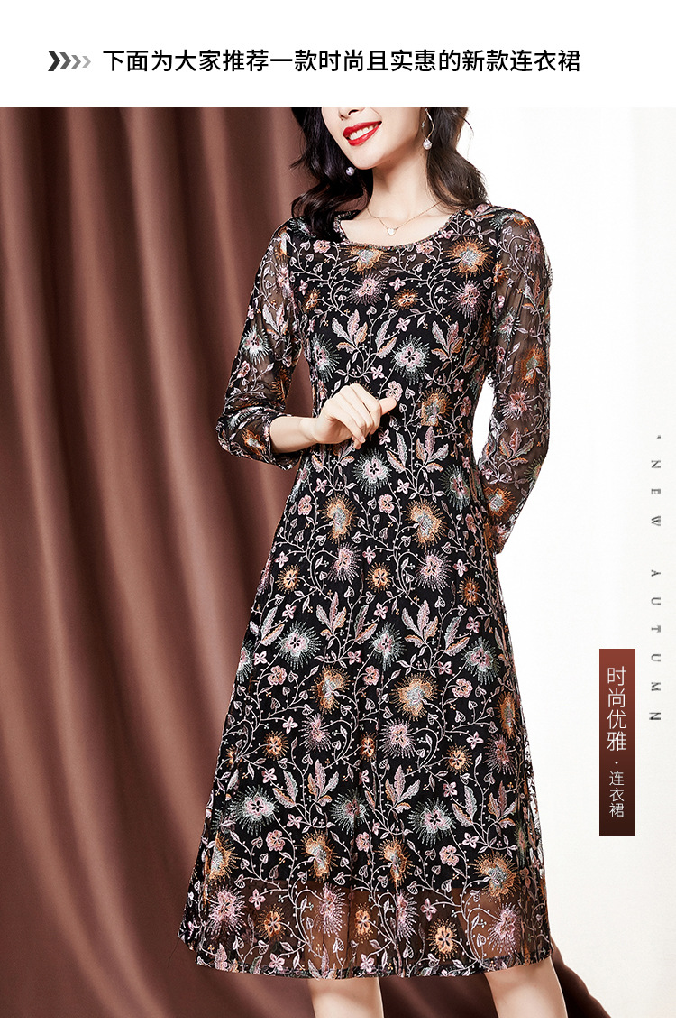 ZS-2919秋新款大码蕾丝绣花长袖连衣裙女气质收腰中长款过膝裙子