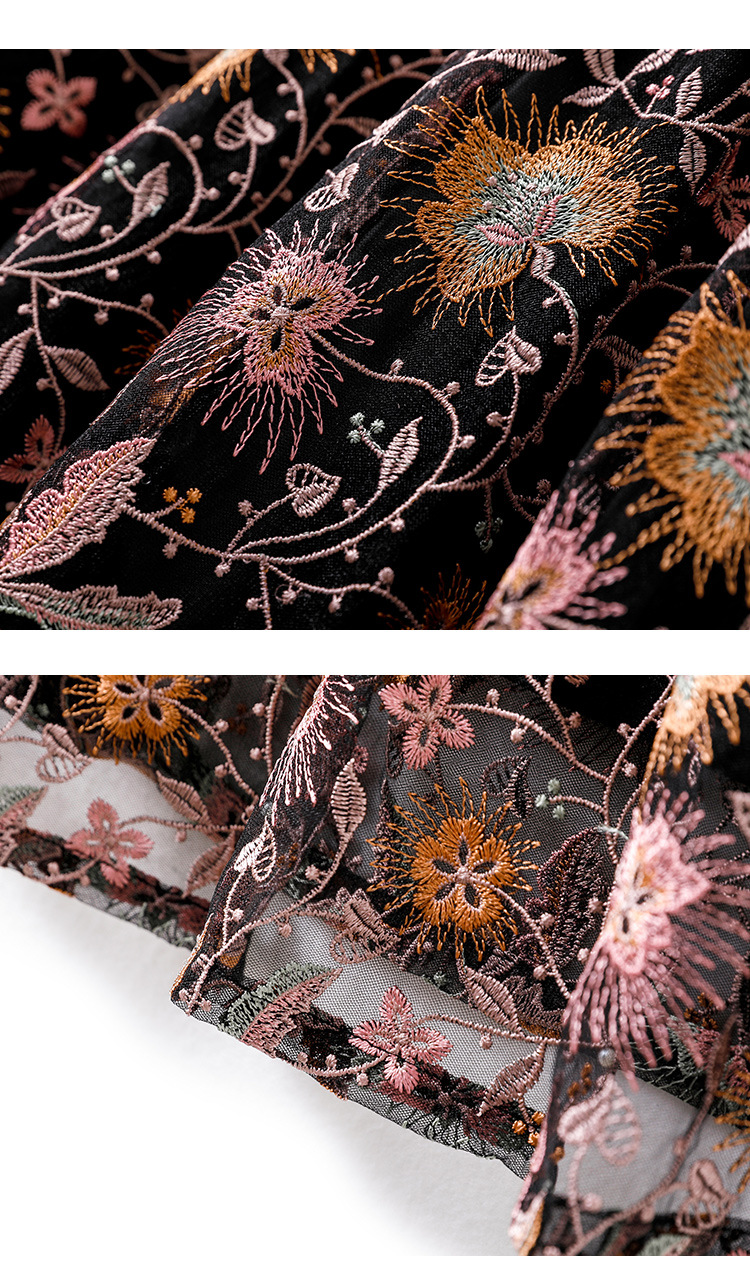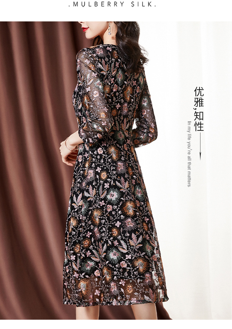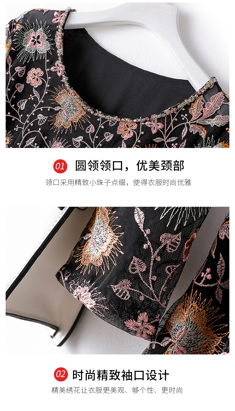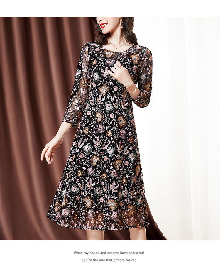 ZS-2919秋新款大码蕾丝绣花长袖连衣裙女气质收腰中长款过膝裙子