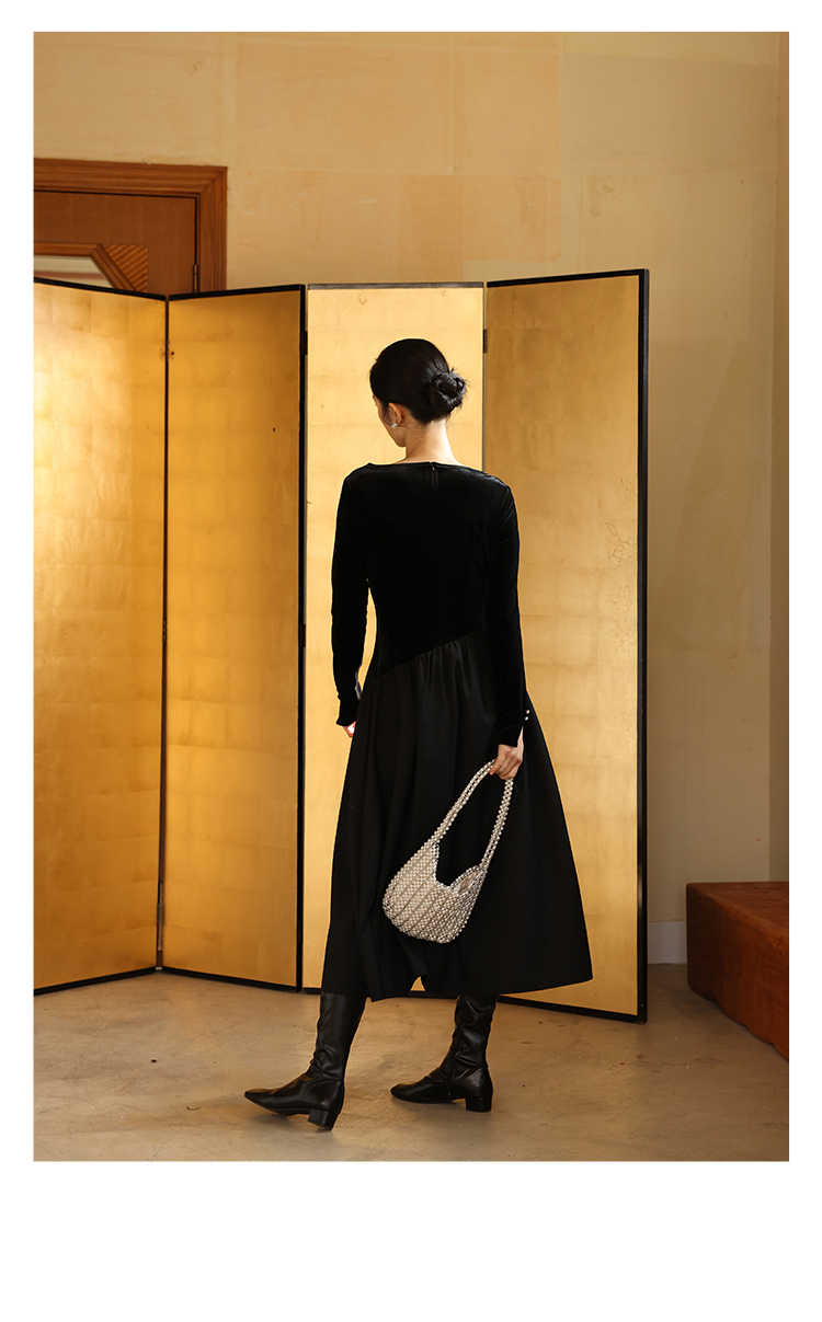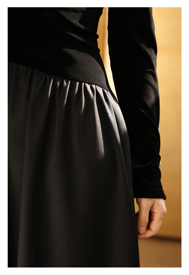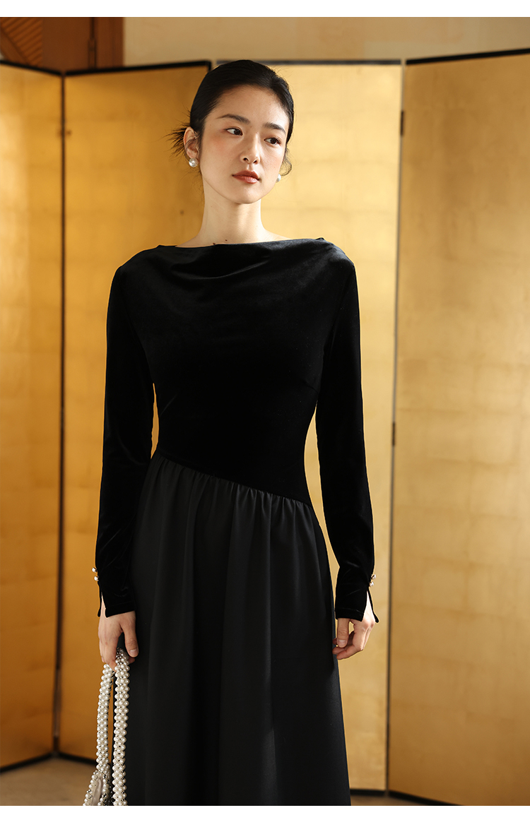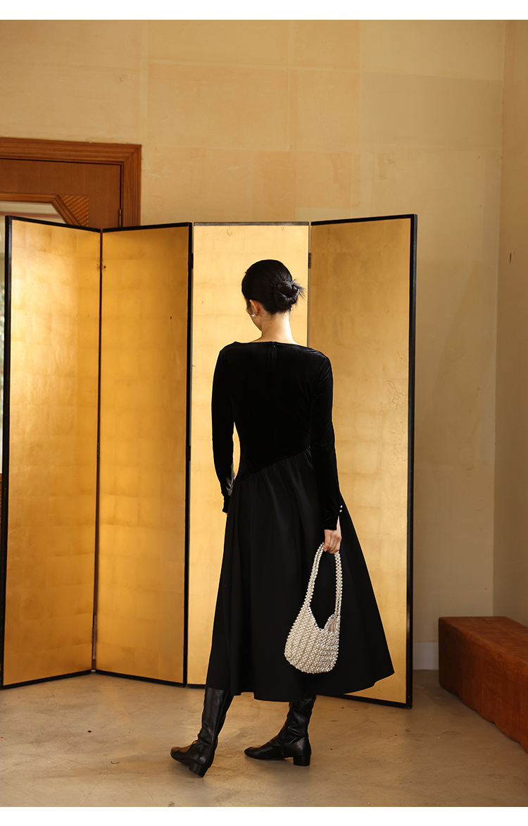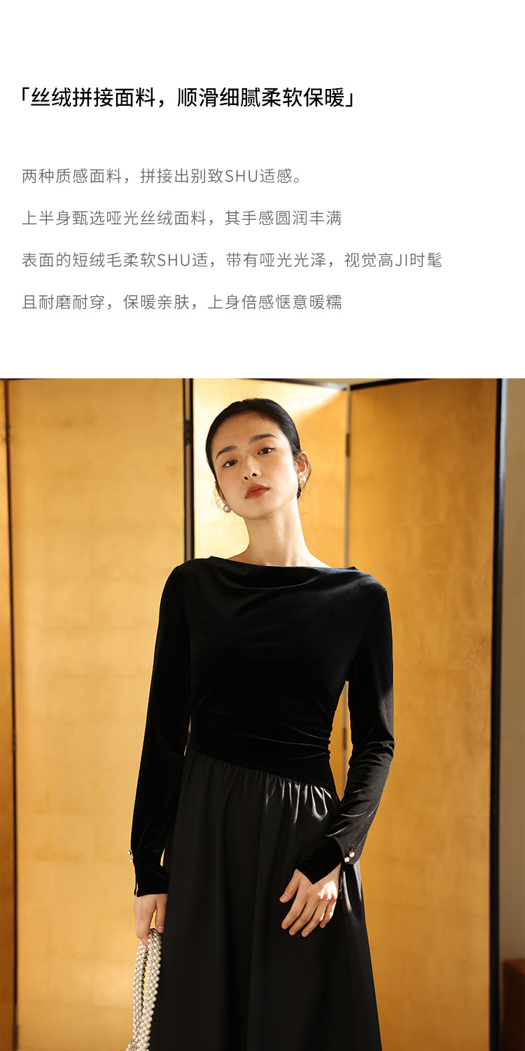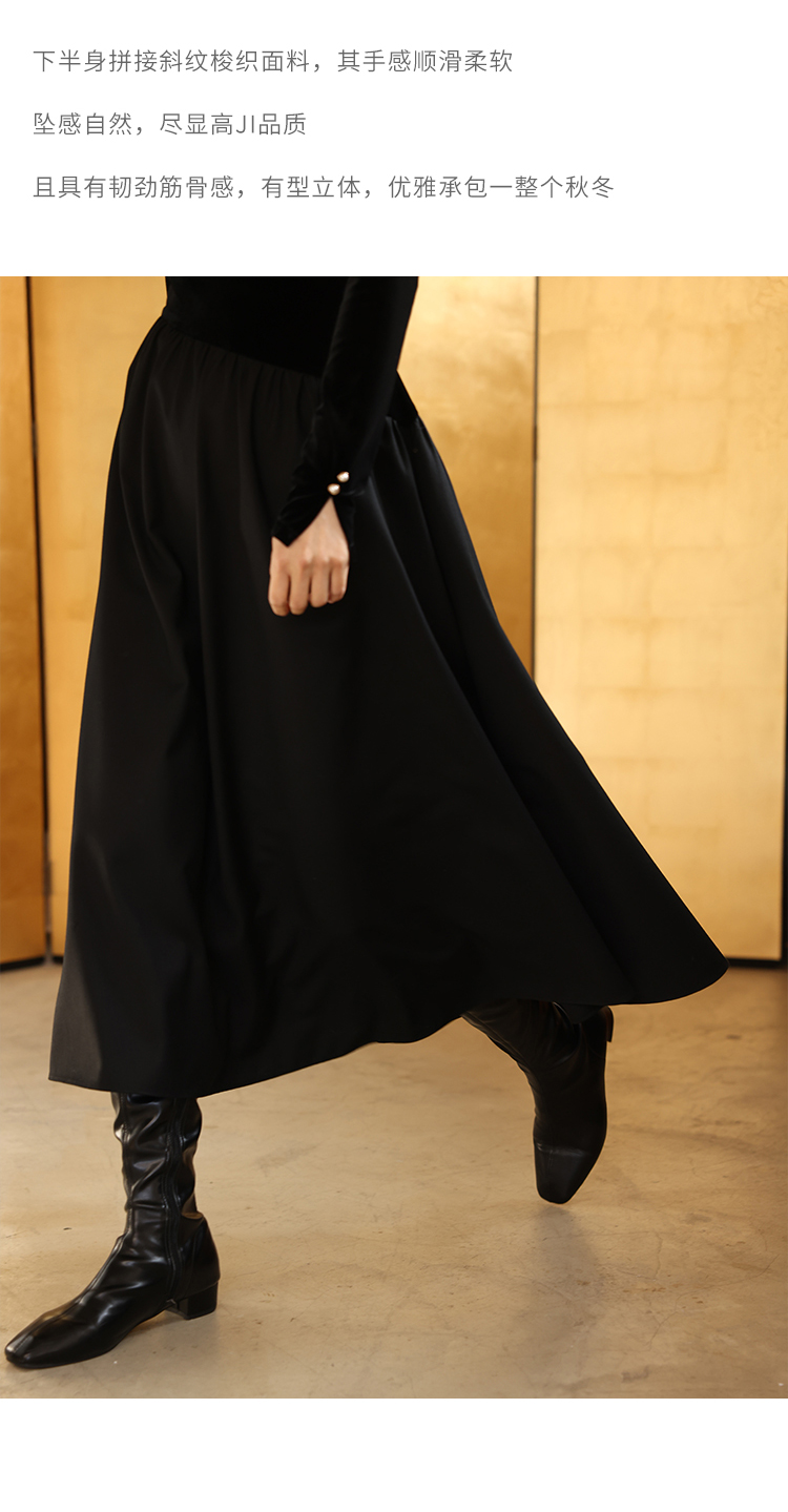HeyDress法式拼接丝绒连衣裙女秋冬复古收腰气质小黑裙赫本风裙子