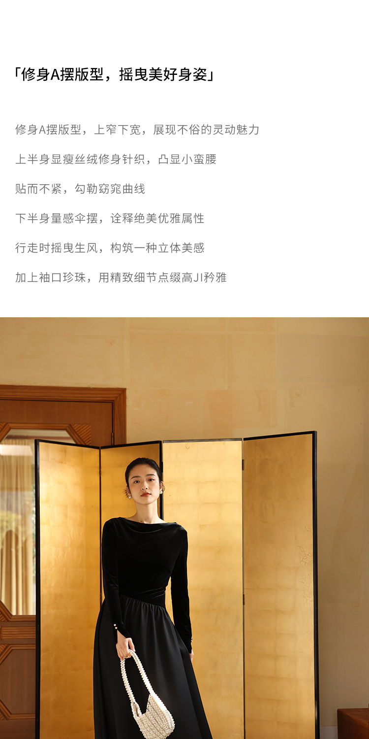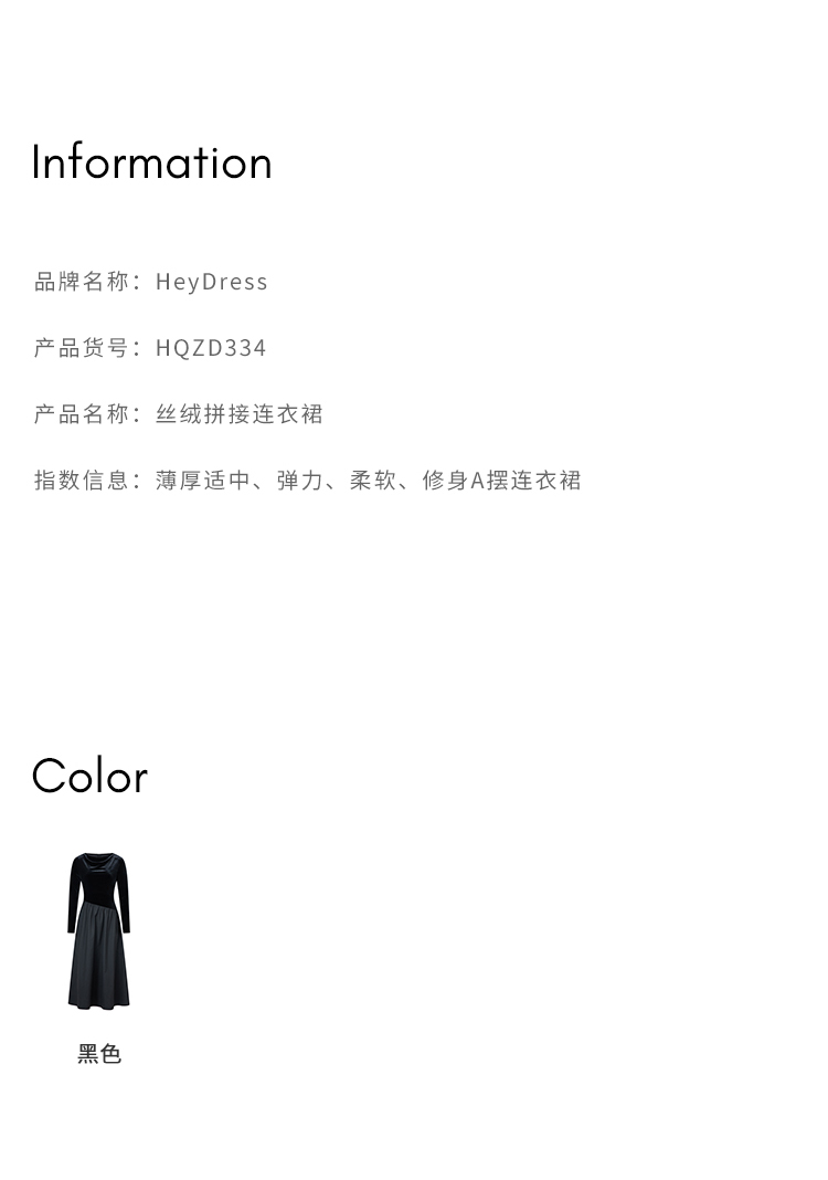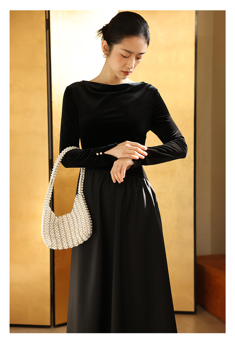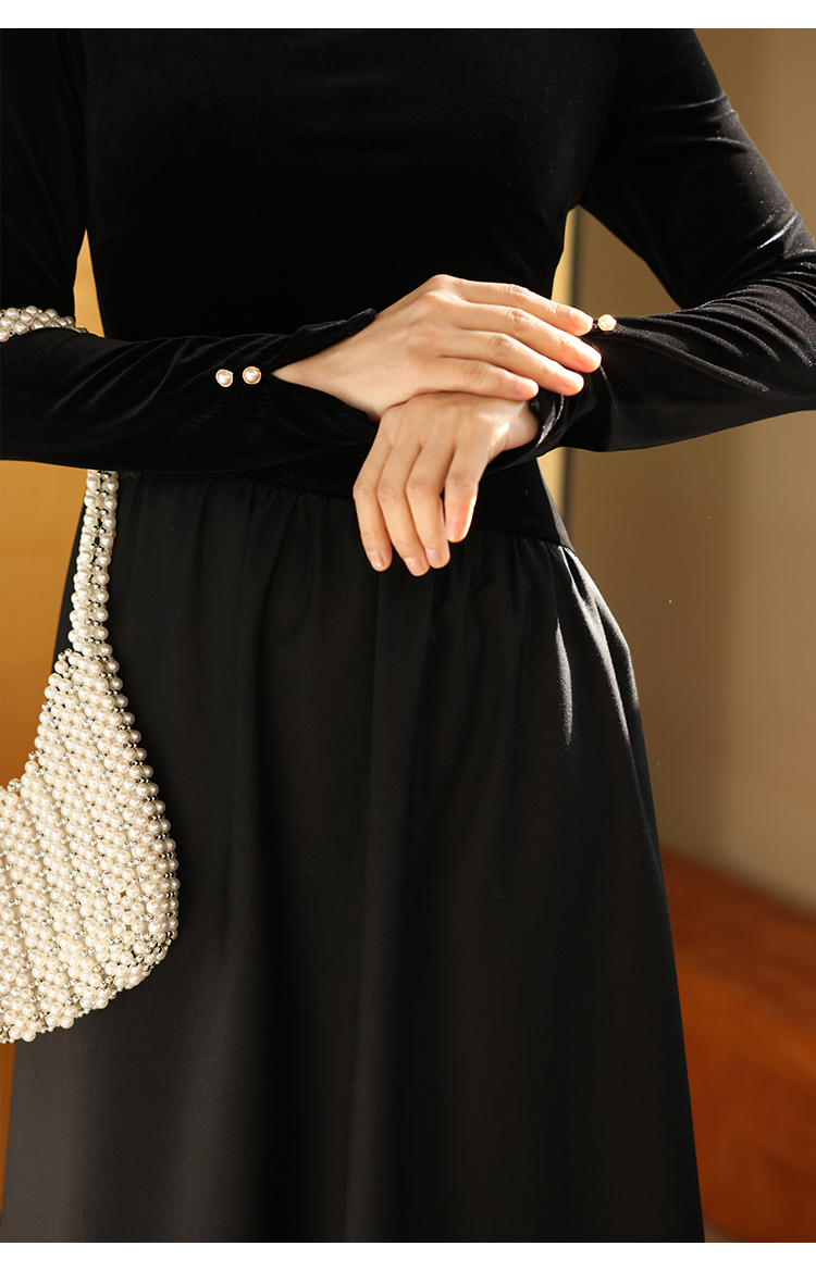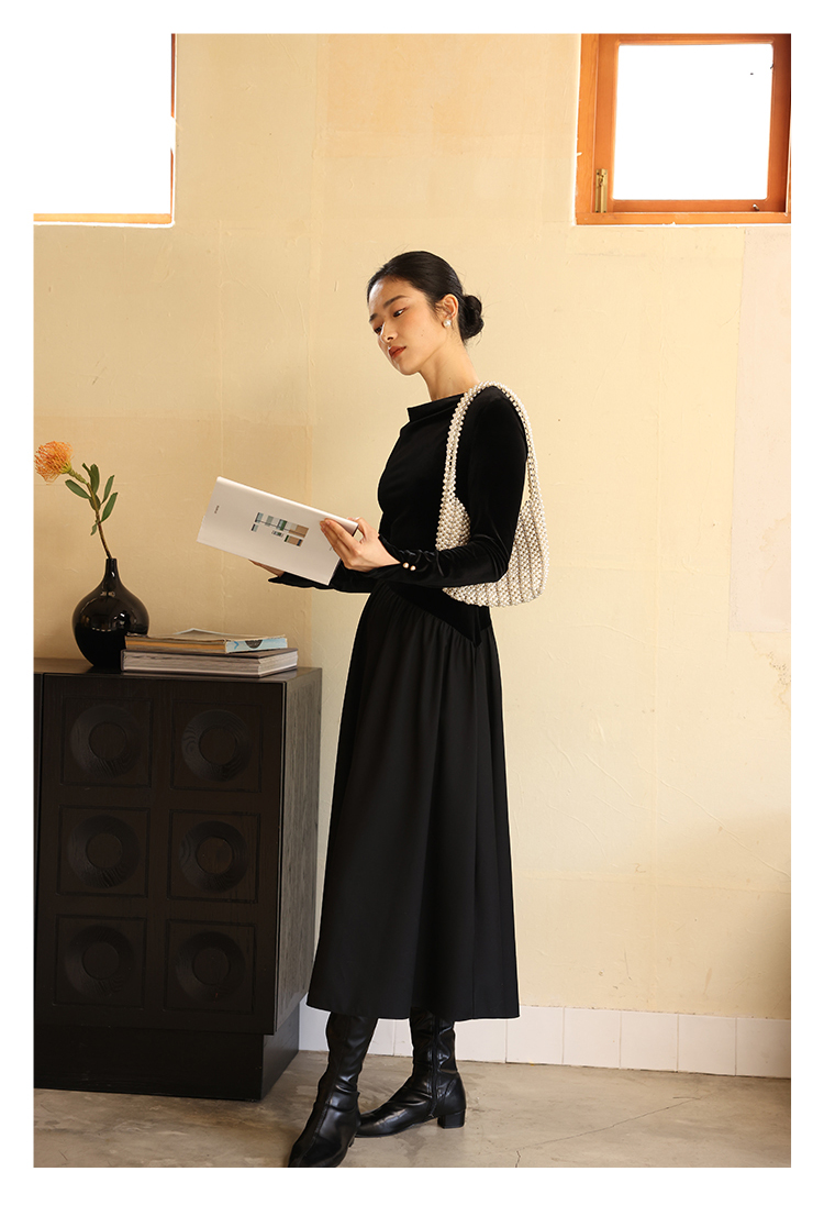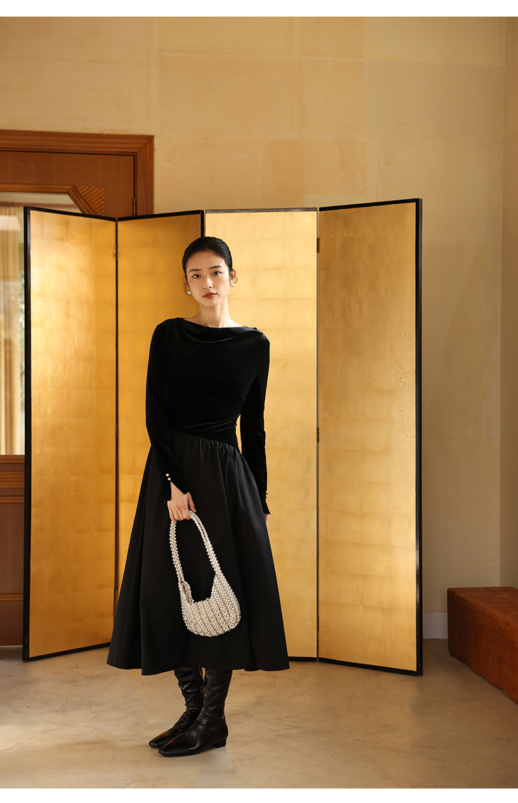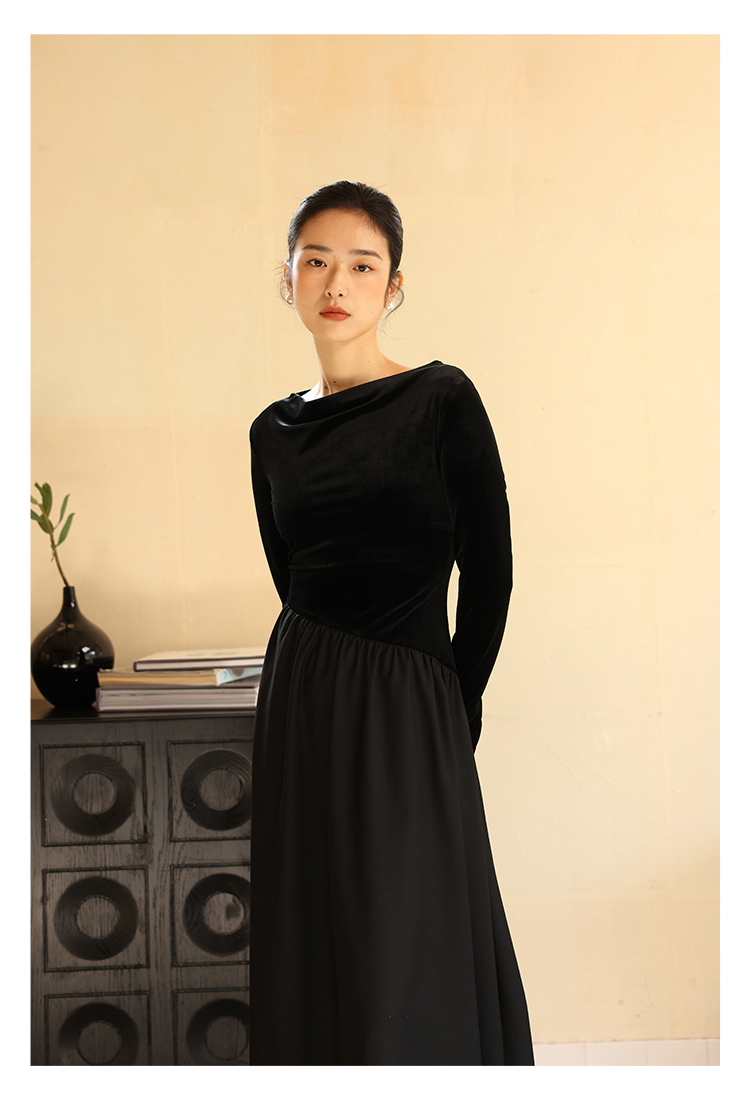 HeyDress法式拼接丝绒连衣裙女秋冬复古收腰气质小黑裙赫本风裙子