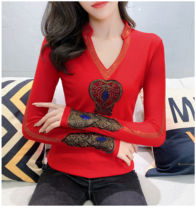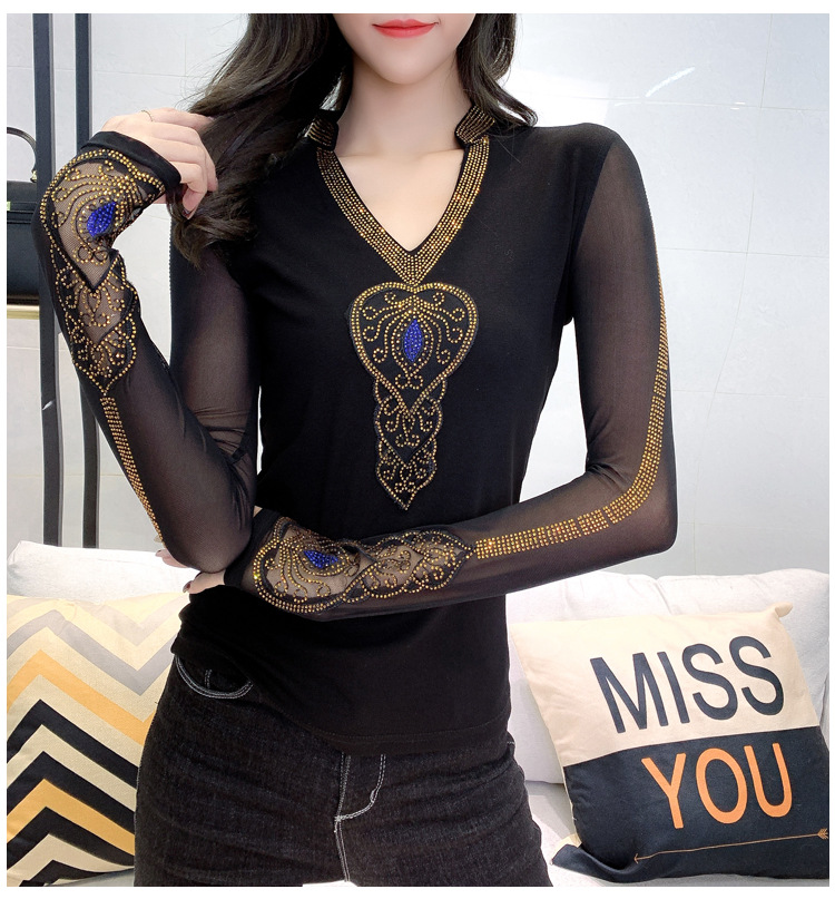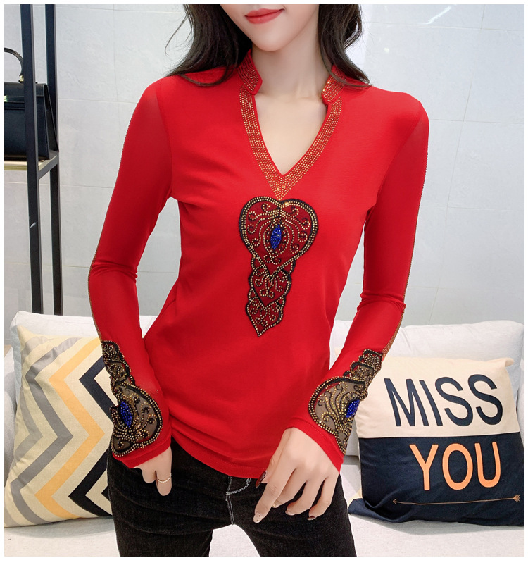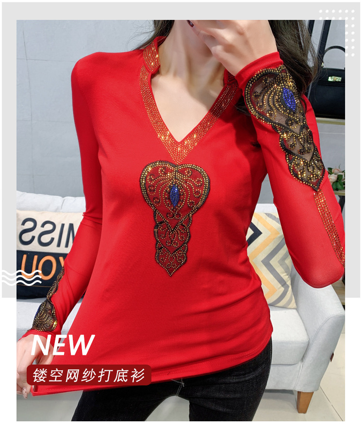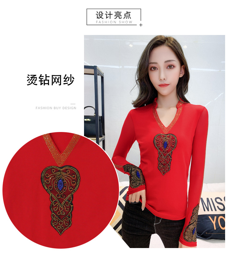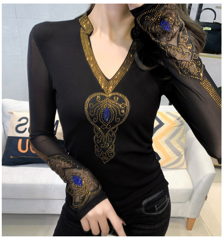 雀说V领重工烫钻t恤女长袖蕾丝拼接小衫上衣新款打底衫AL1836