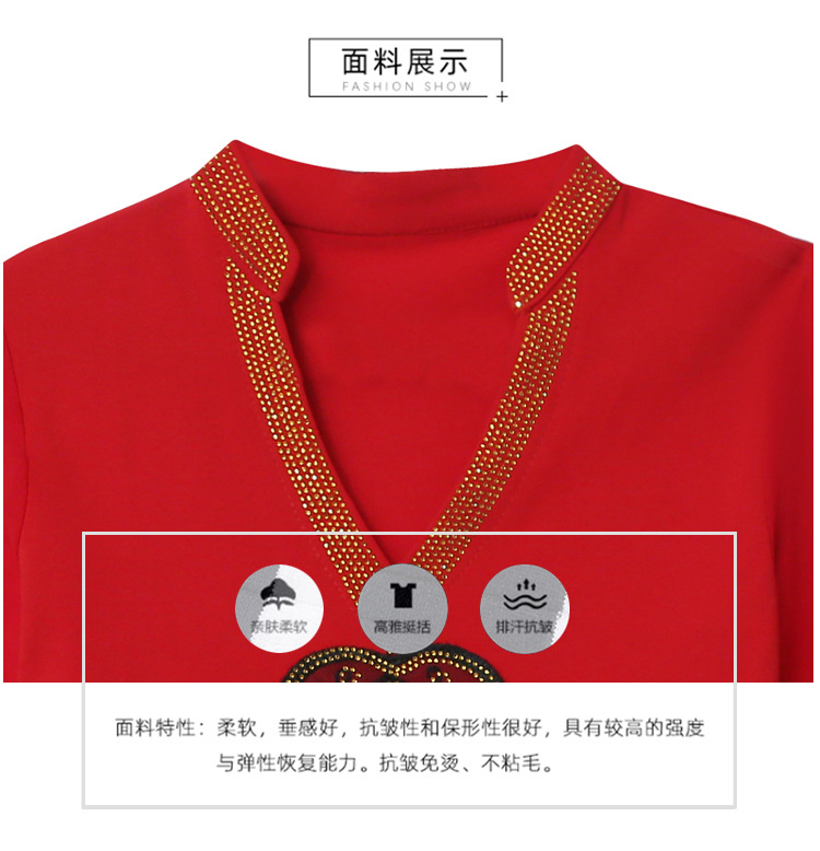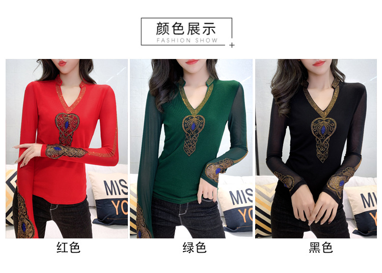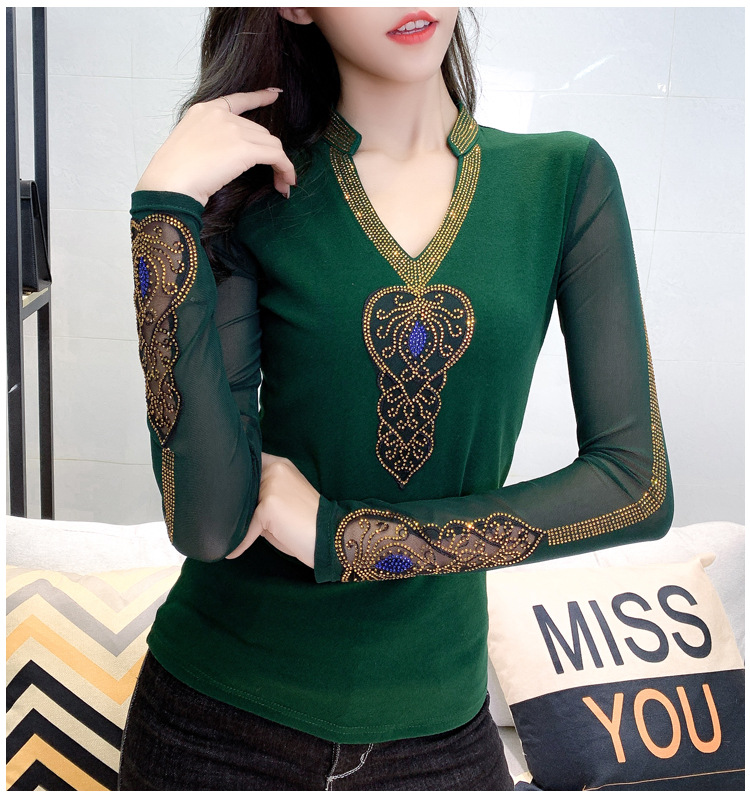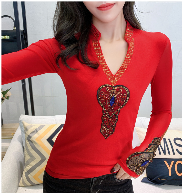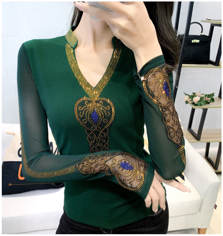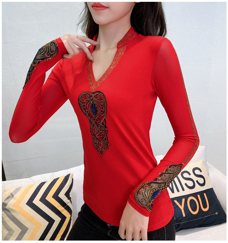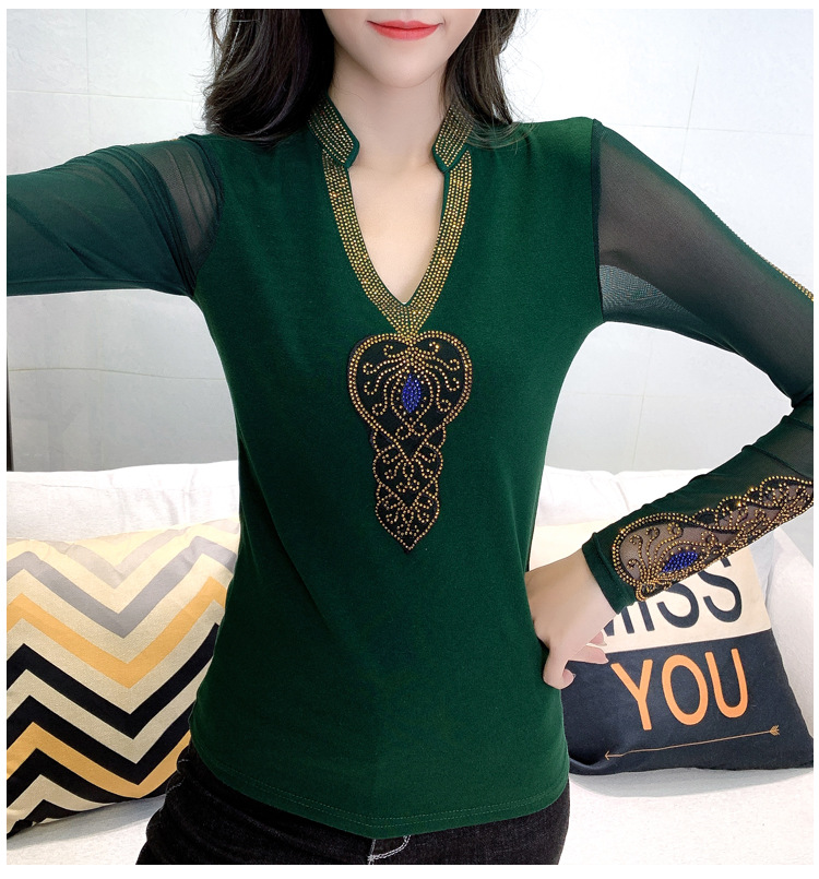 雀说V领重工烫钻t恤女长袖蕾丝拼接小衫上衣新款打底衫AL1836