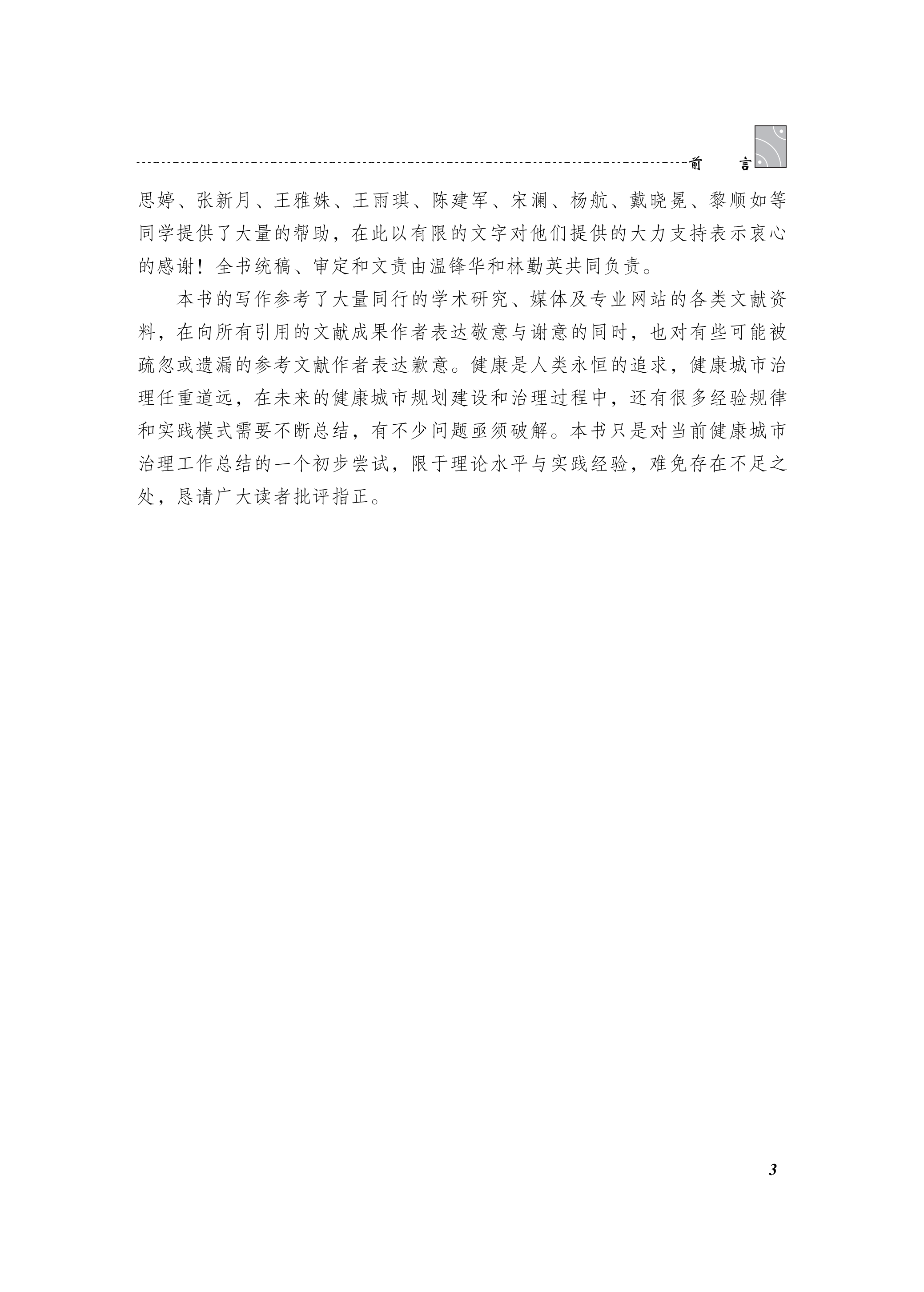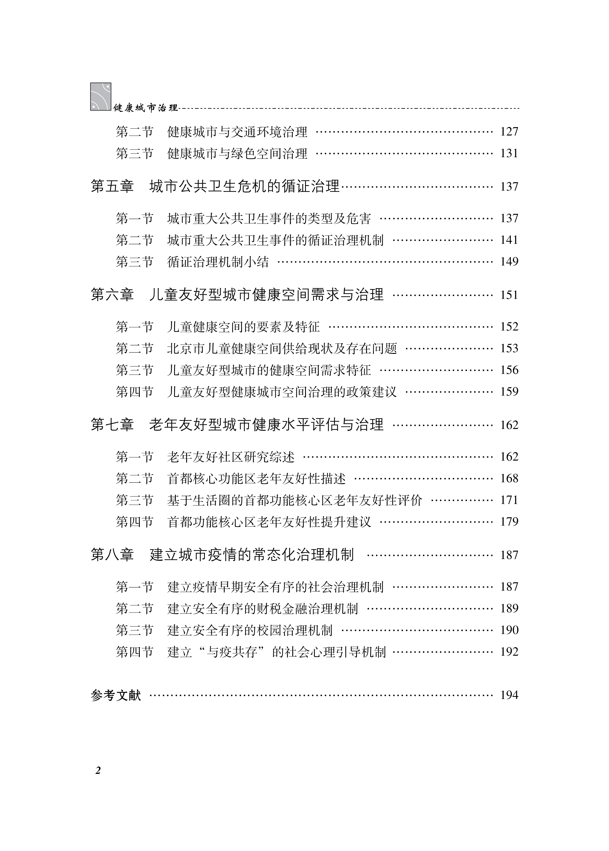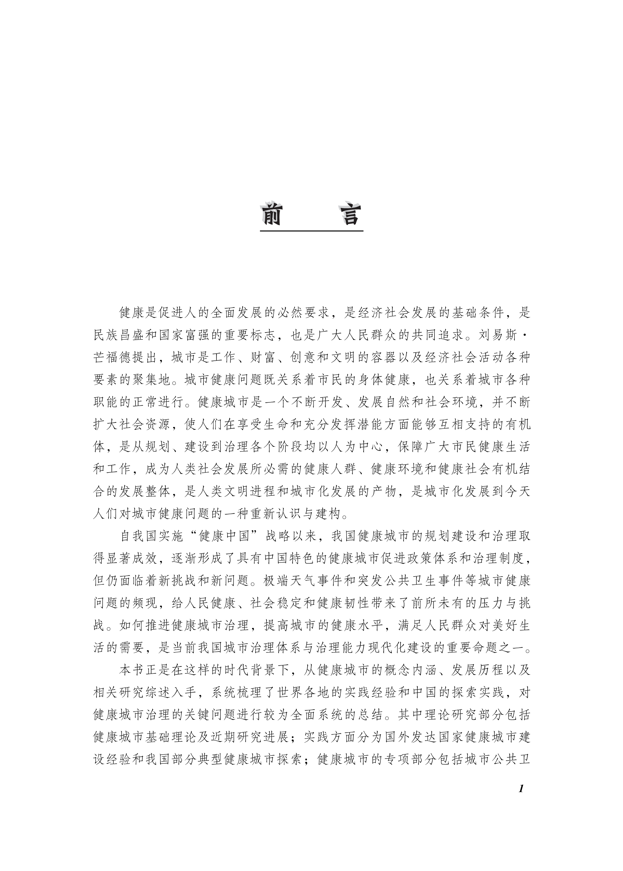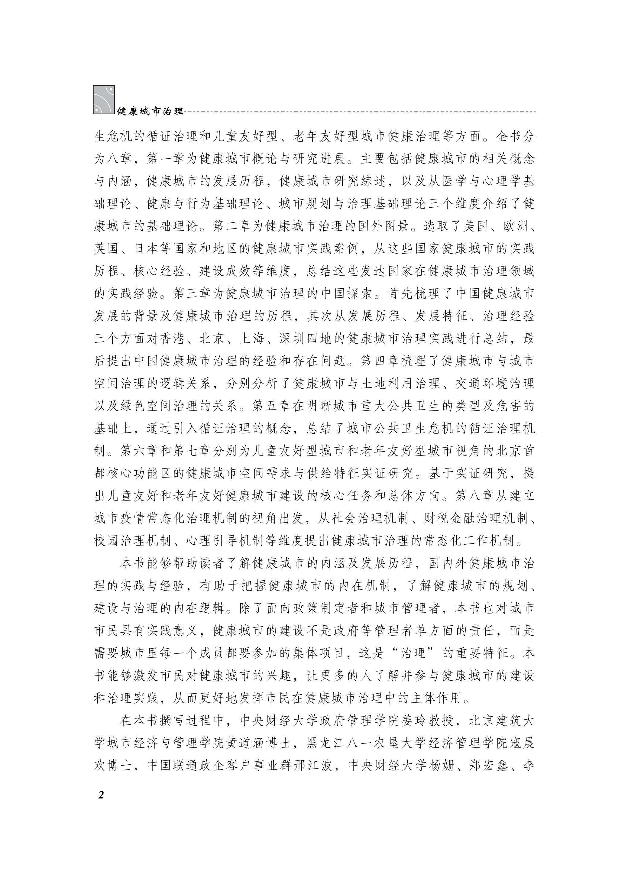 本书正是在这样的时代背景下,从健康城市的概念内涵、发展历程以及相关研究综述入手,系统梳理了世界各地的实践经验和中国的探索实践,对健康城市治理的关键问题进行较为全面系统的总结。其中,理论研究部分包括健康城市基础理论及近期研究进展;实践方面分为国外发达国家健康城市建设经验和我国部分典型健康城市探索;健康城市的专项部分包括城市公共卫生危机的循证治理和儿童友好型、老年友好型城市健康治理等方面。
