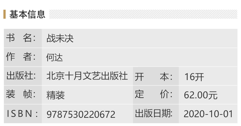《战未决》是作家何达的长篇小说,本书以旷氏家族为中心,反映了社会各阶层在中国共产党领导的抗日民族统一战线旗帜下,同仇敌忾,勇于牺牲,积极投身抗日战争的伟大事迹。小说以旷氏家族三代人的经历与纠葛为主线,多角度地描绘了在抗日战争时期几代人的爱情婚姻和家庭故事,力求塑造一群不同阶层,性格鲜明、生动立体的人物形象,并努力挖掘战争对不同人物内心的猛烈冲击和深刻影响,在语言方面,亲切自然、生动幽默、雅俗共赏。