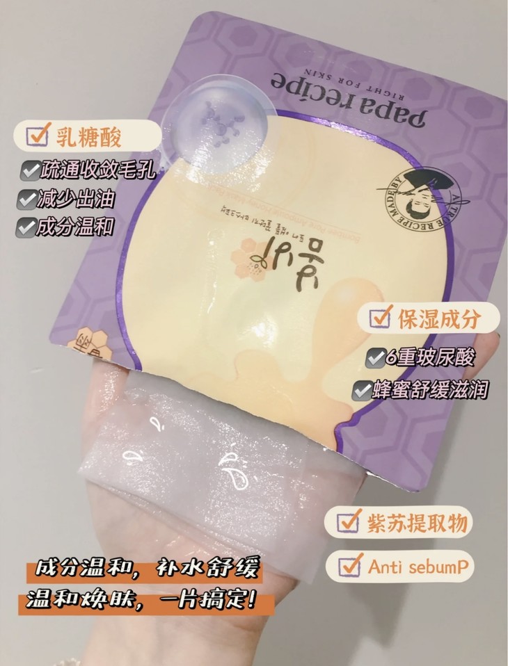 👑春雨蜂蜜乳糖酸细歛面膜 👍 大毛孔救星! 🙌含有“乳糖酸、紫苏提取物”等成分,有效疏通毛孔、减少出油。 ✅同时更有6重玻尿酸!温和成分,补水舒缓,舒缓肌肤,一片搞定💡! 💦精华液和面膜带有淡淡的紫色~上脸清爽不粘腻,膜布柔滑亲肤☁️。 🔆敷完脸色明亮了不少🌞!它也很适合需要刷酸的你喔~