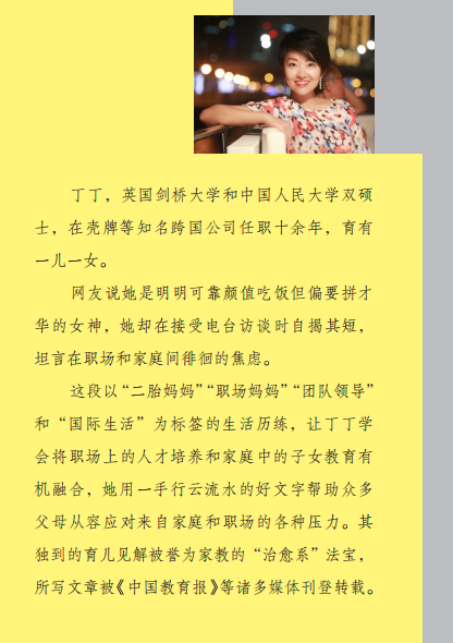 丁丁是国内外一流大学的双硕士,曾在知名跨国企业任职,是在海外职场打拼十余年的职业女性,同时她也是一位育儿作家,所写的育儿文章被诸多媒体登刊转载......但抛开这些光鲜亮眼的标签,她只是一个二宝妈妈,一个在工作和家庭之间寻找微妙的平衡点的平凡女性。