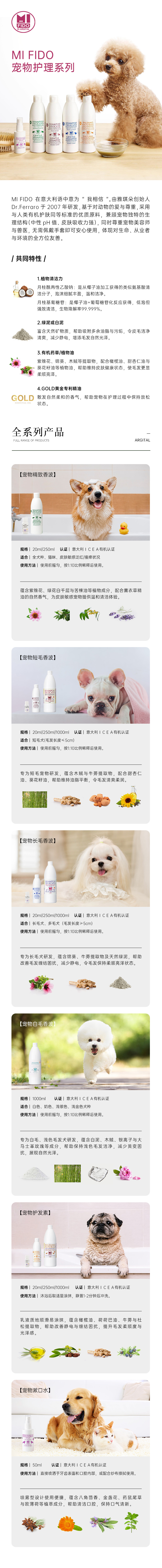 宠物精致香波20ml/250ml:月桂两性乙酸钠、天然矿物质水、乙醇 (源自小麦)月桂基葡糖苷、椰油酰水解小麦蛋白钠、乳酸、绿泥凝胶、紫锥花提取物、黄原胶、小檗属植物树脂提取、安息香树脂提取物、薰衣草精油、绿花白千层精油、苦楝油、葵花籽油、百里香精油、柠檬烯、芳樟醇、香叶醇。
