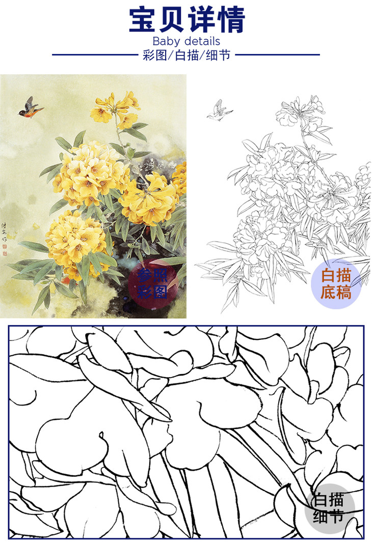 工笔花鸟白描底稿-周中耀牡丹小品《二乔》-多种白描尺寸可选-ZY04
