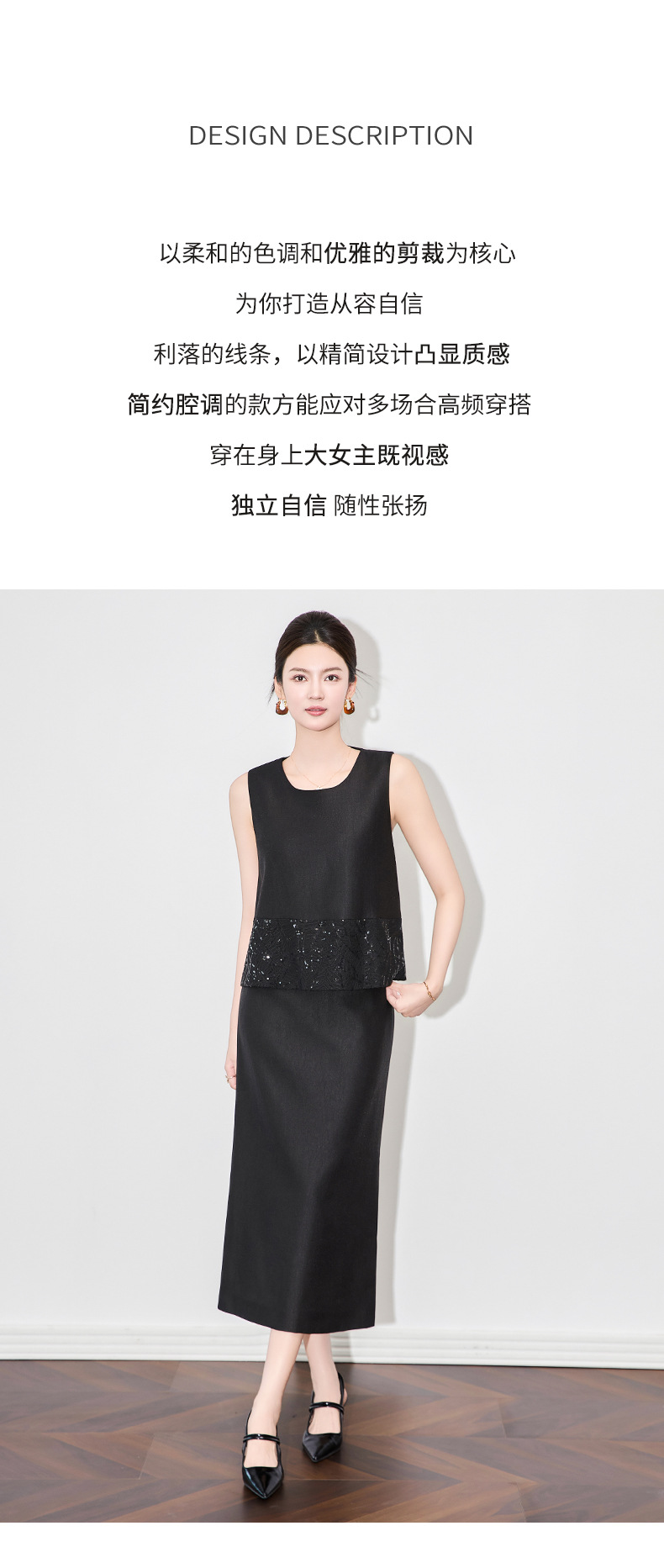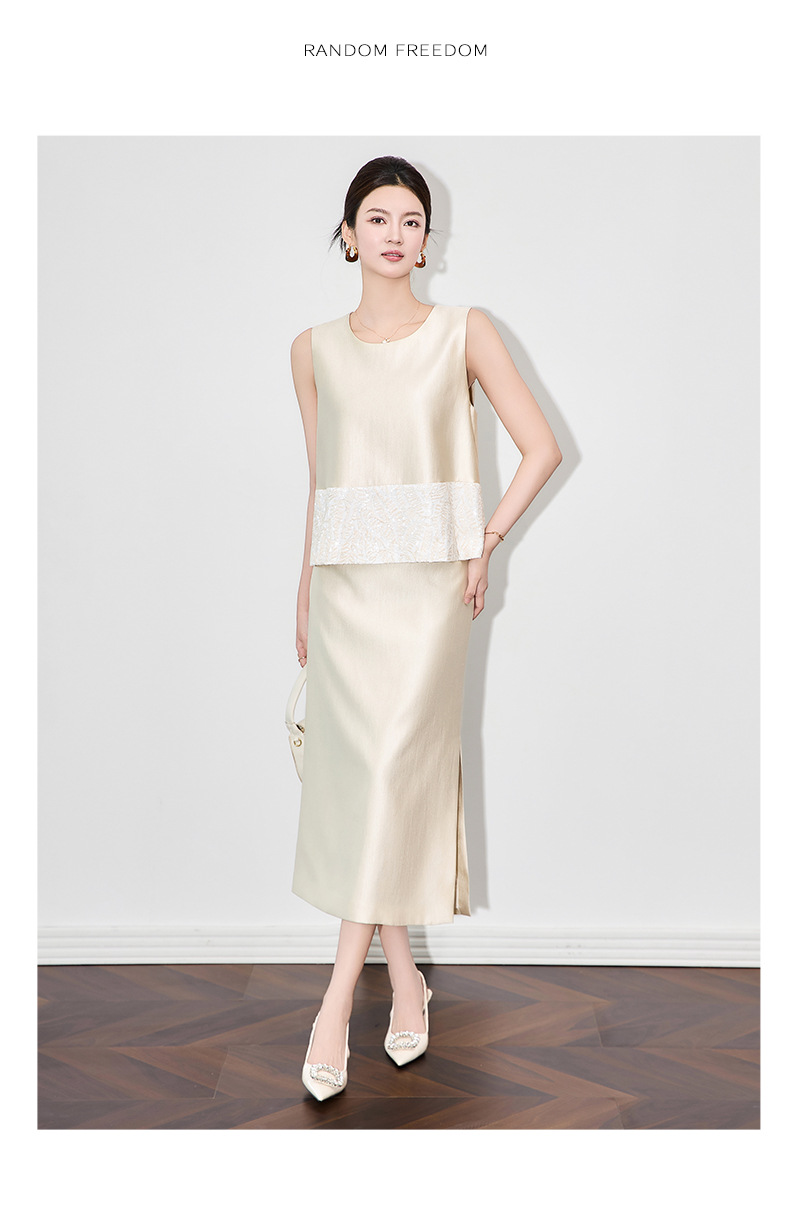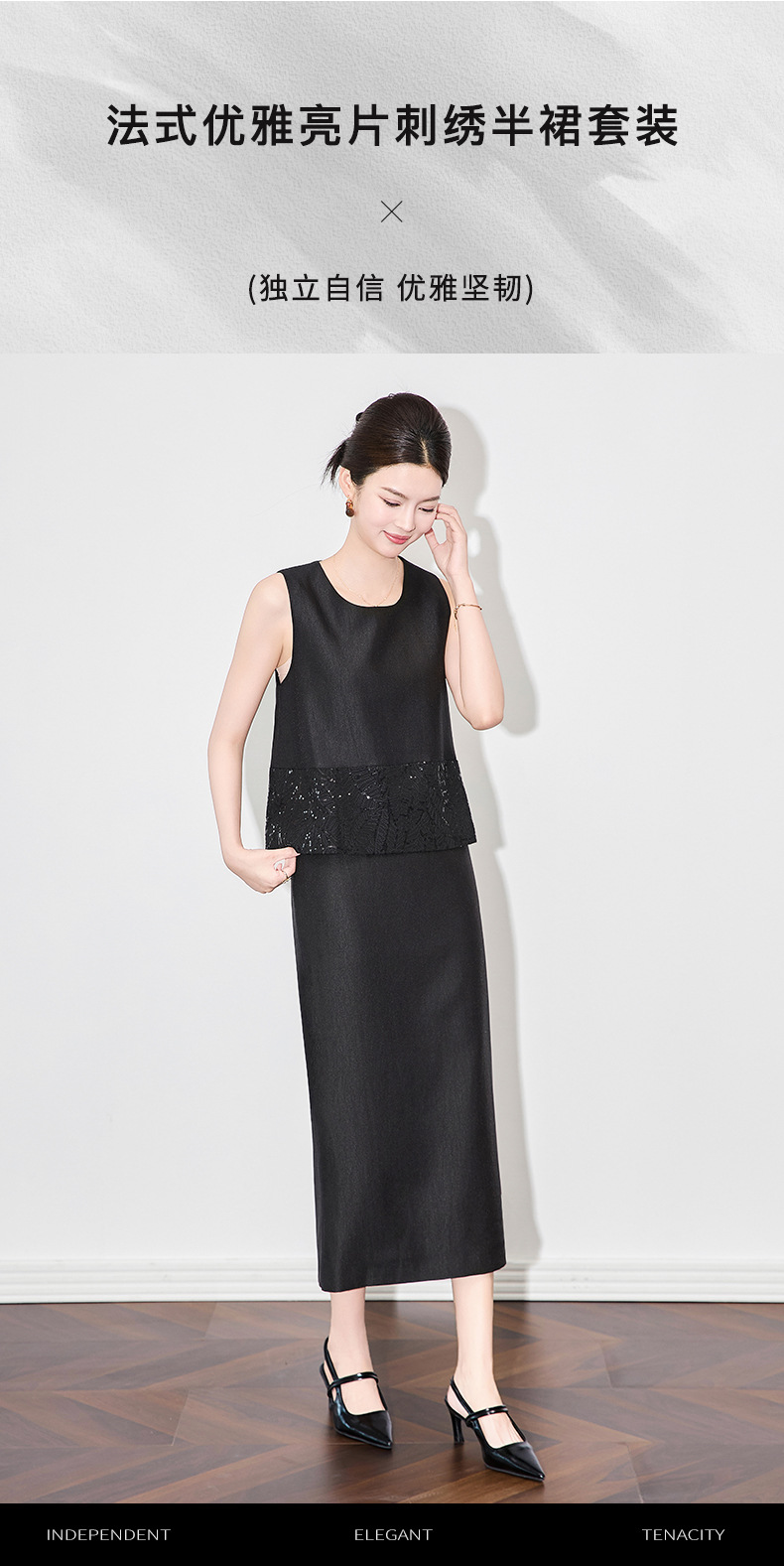 「高货wl」全新升级【铂金会员431/天猫579/差价148】(99427)洛诗琳法式优雅亮片刺绣马甲时尚天丝直筒半身裙两件套女
