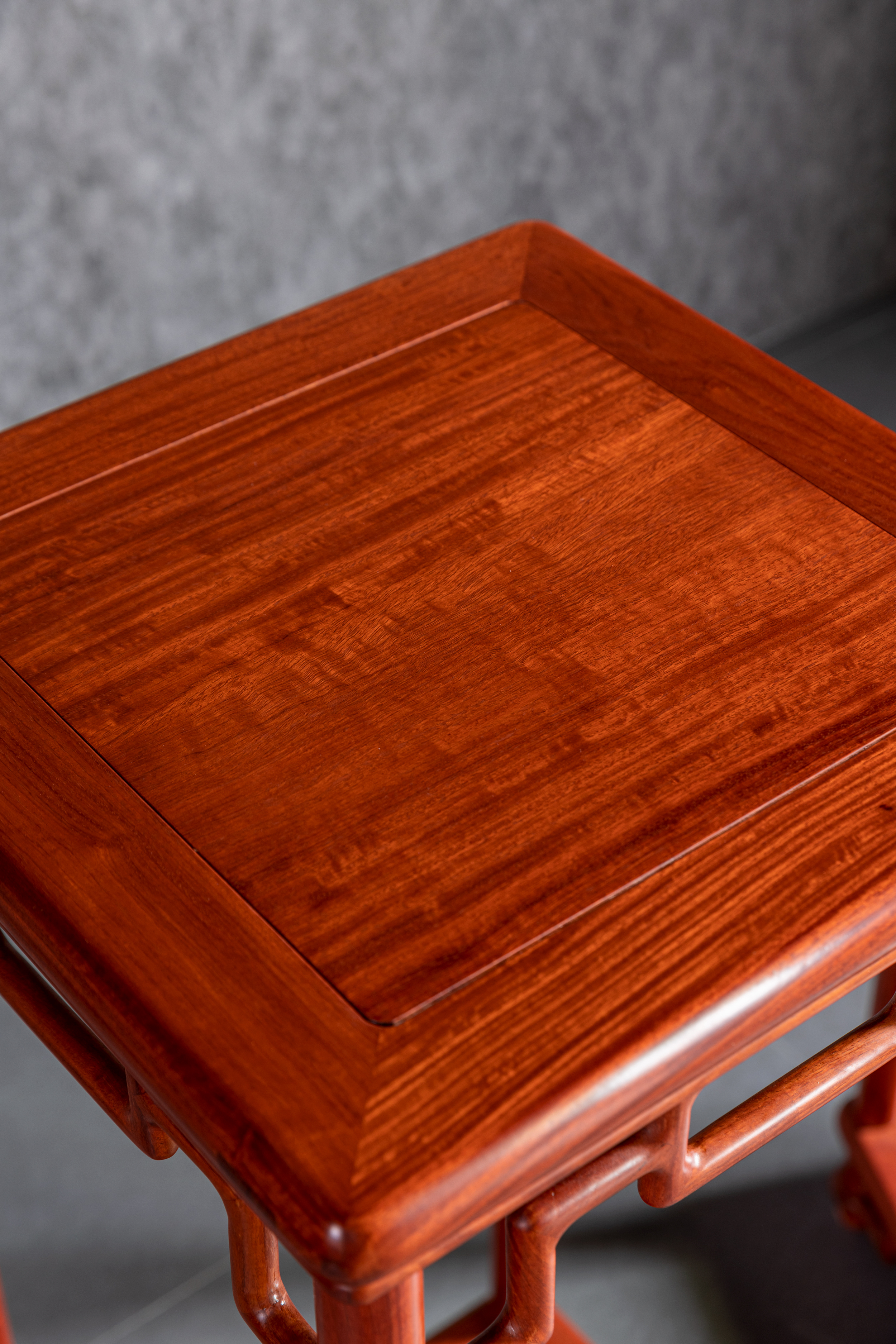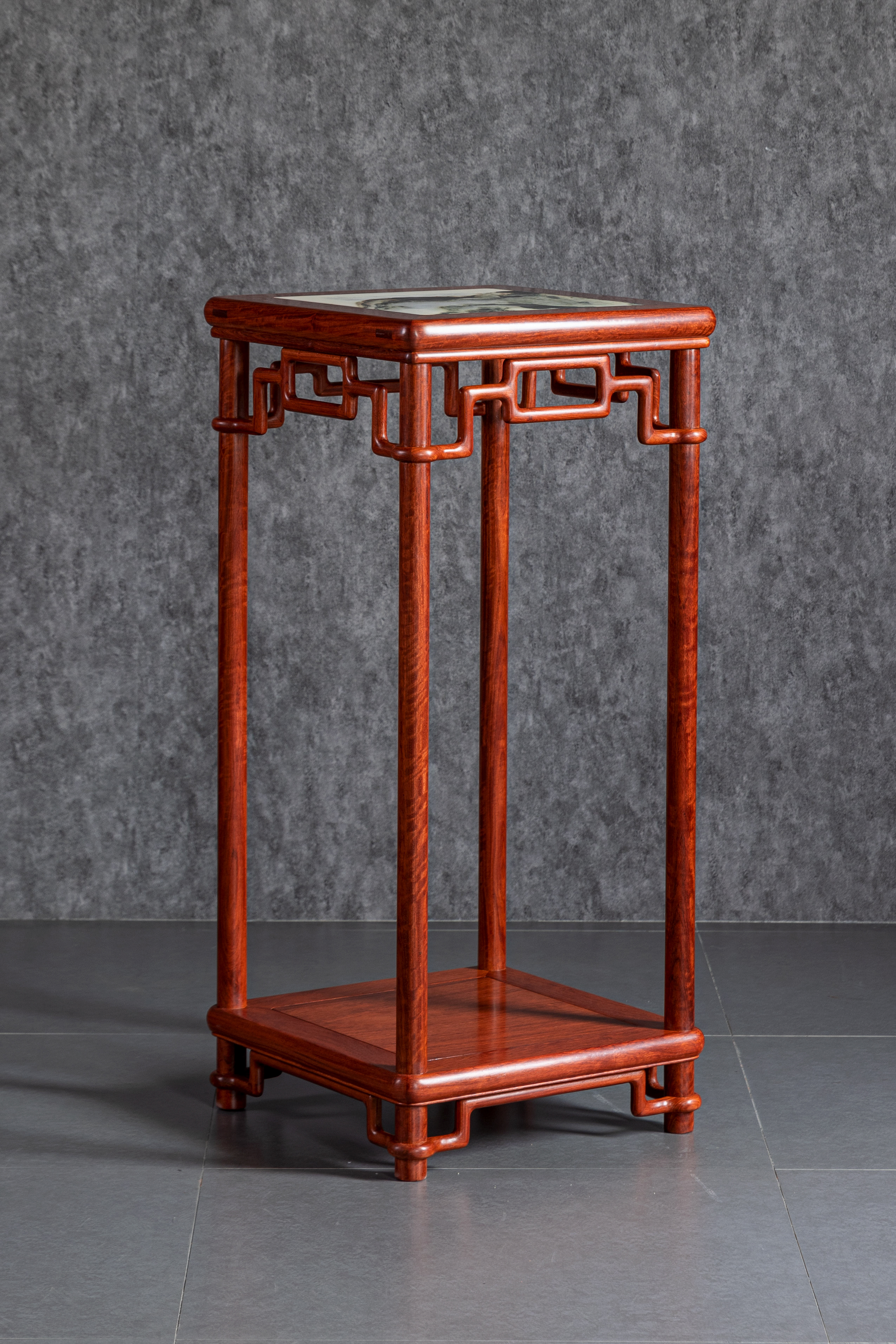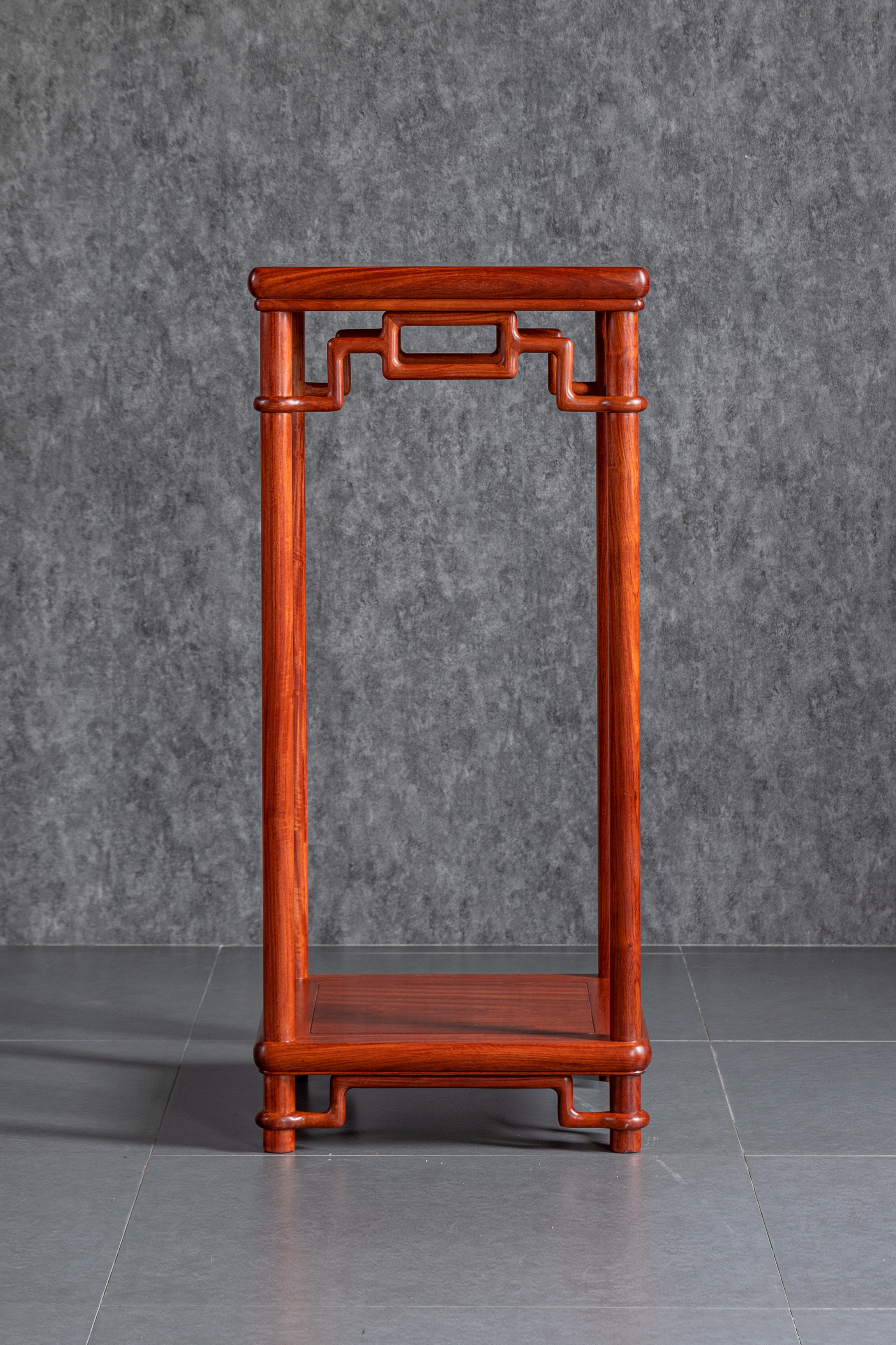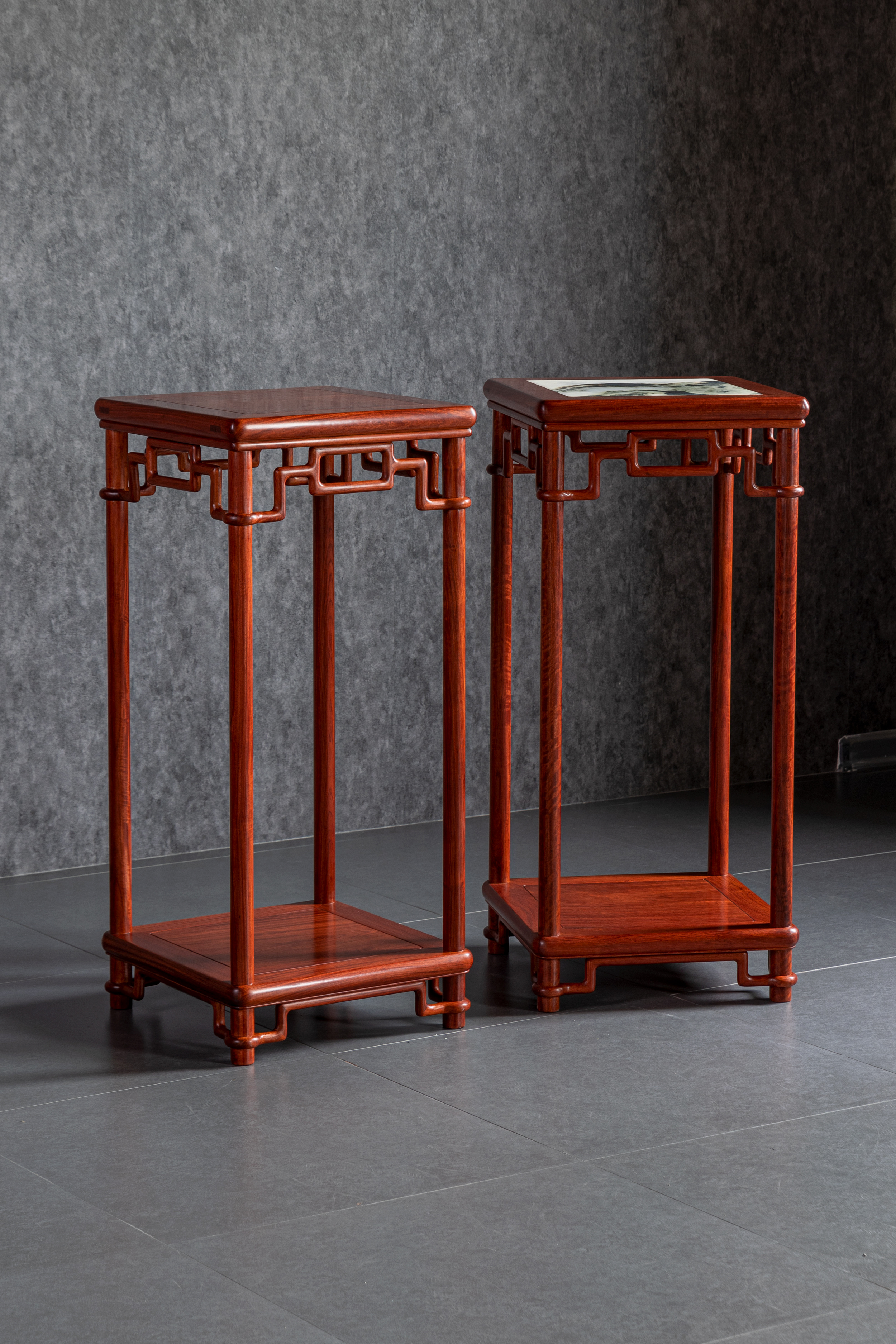这款颐和园花架,圆包圆双层式样,均有穿带,裹腿攒直角高拱罗锅枨结构,原型曾收藏于颐和园,并收录于田家青先生的《颐和园藏明清家具》一书中,方几面镶嵌云石,通体圆材,几面方形,四边攒框镶心,面侧沿呈泥鳅背式素混面,面下为圆棍攒框呈变形裹腿式罗锅枨,罗锅枨与腿足交圈圆包圆,四腿下装有素面屉板,板下装有圆棍攒直角高拱罗锅枨,亦与腿足交圈圆包圆。