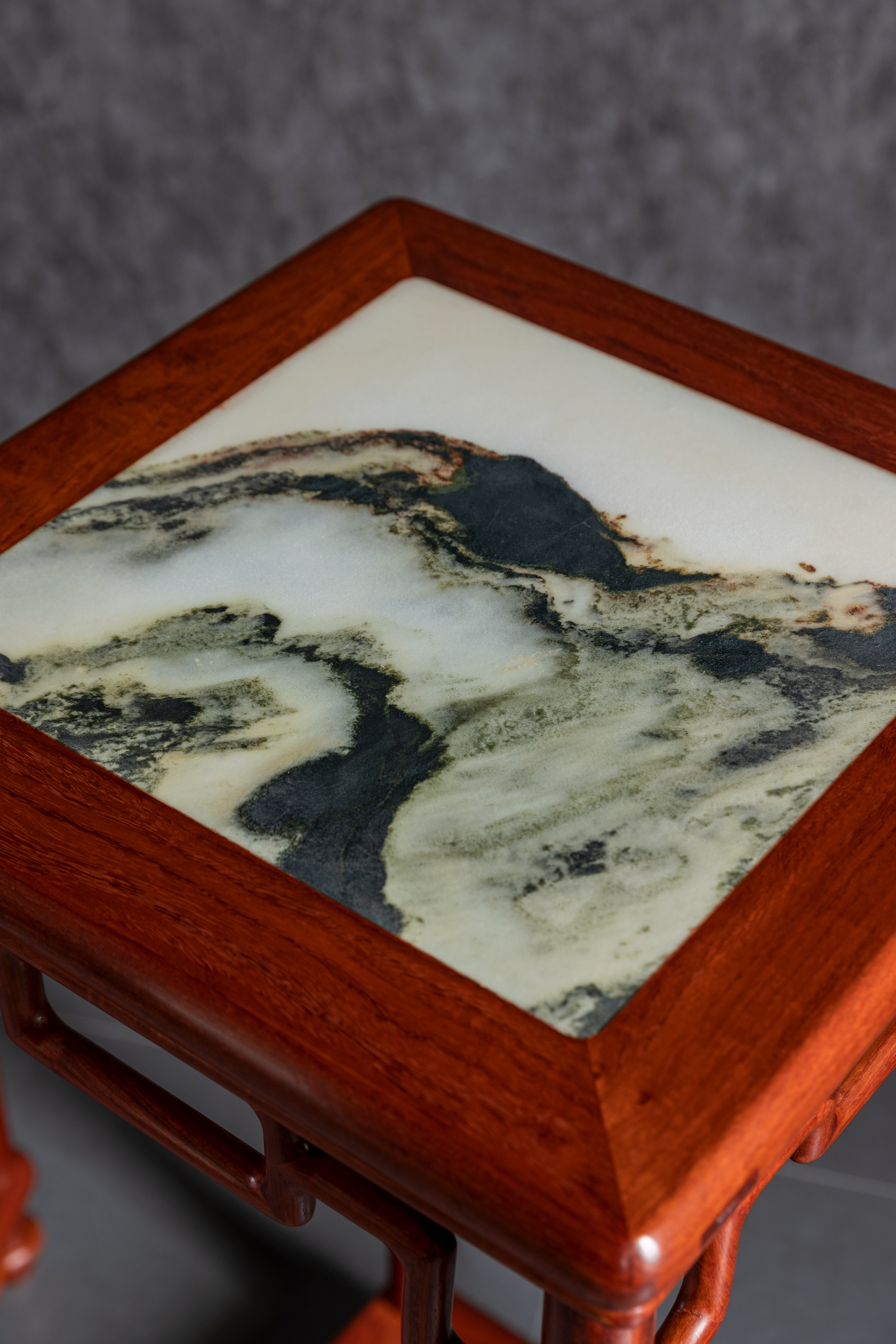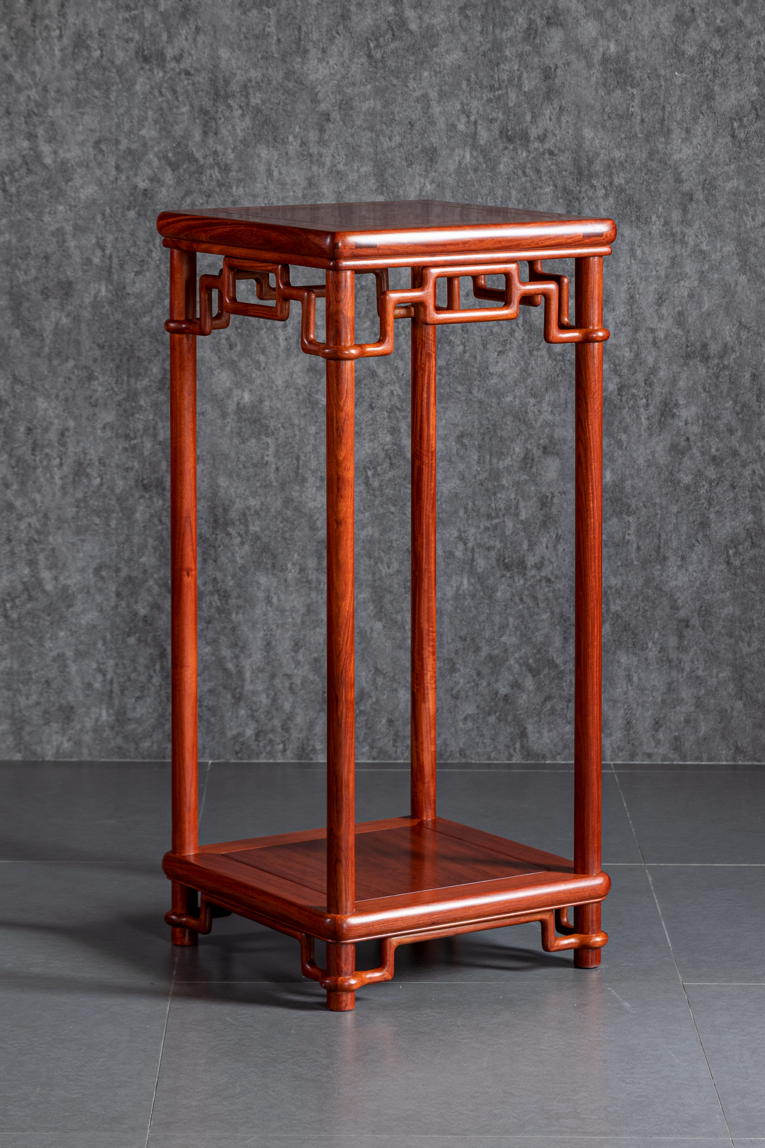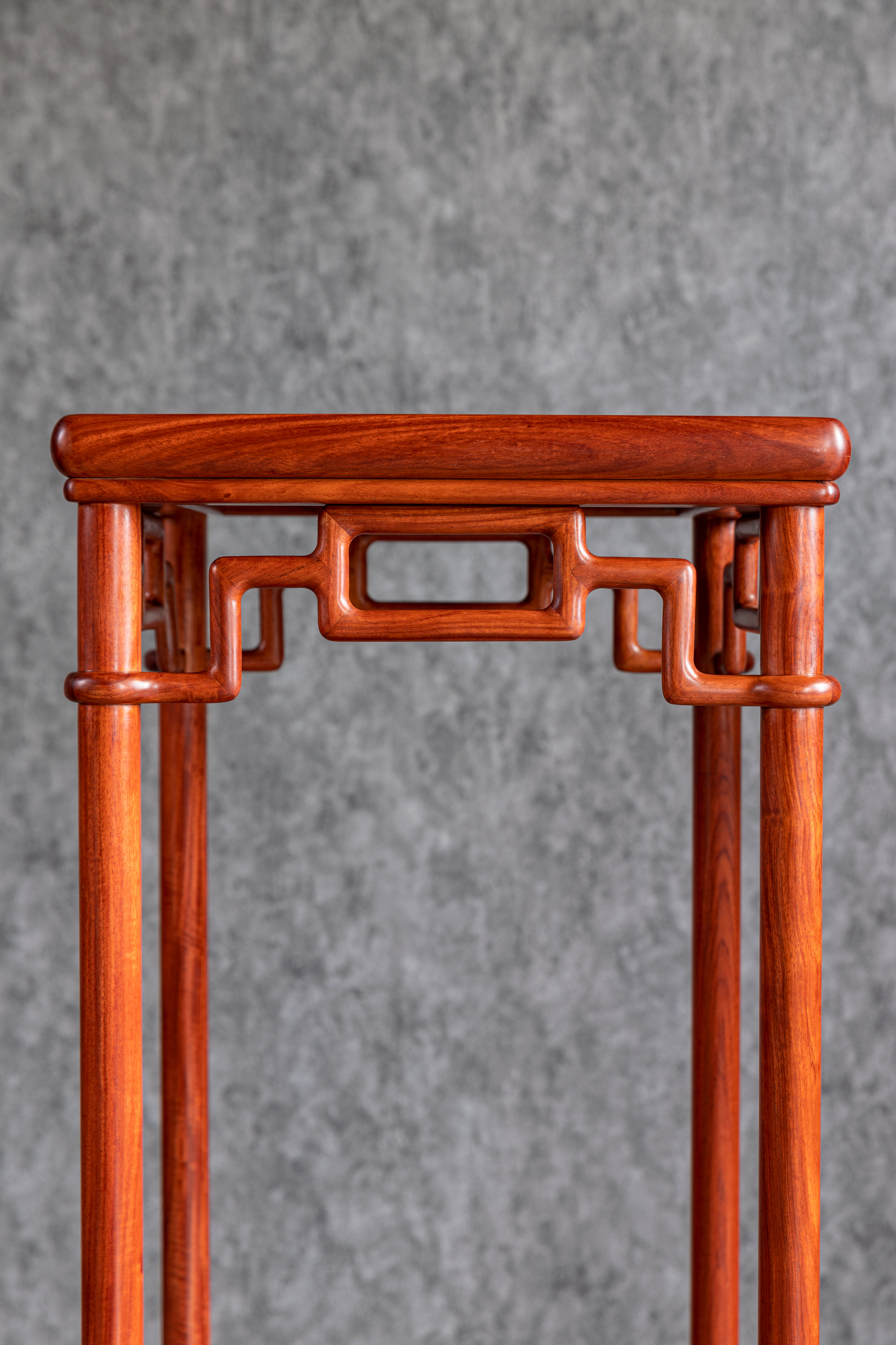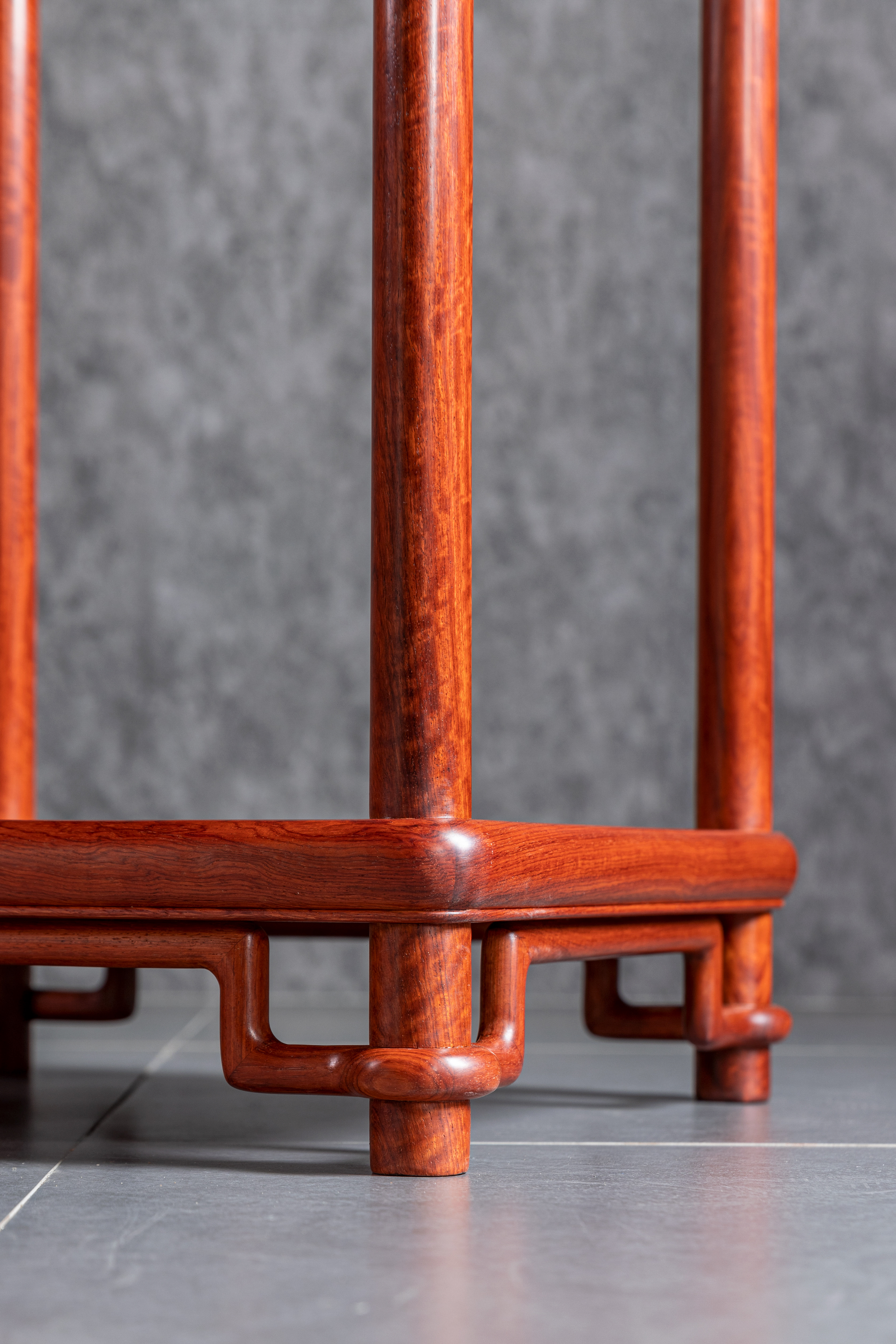 这款颐和园花架,圆包圆双层式样,均有穿带,裹腿攒直角高拱罗锅枨结构,原型曾收藏于颐和园,并收录于田家青先生的《颐和园藏明清家具》一书中,方几面镶嵌云石,通体圆材,几面方形,四边攒框镶心,面侧沿呈泥鳅背式素混面,面下为圆棍攒框呈变形裹腿式罗锅枨,罗锅枨与腿足交圈圆包圆,四腿下装有素面屉板,板下装有圆棍攒直角高拱罗锅枨,亦与腿足交圈圆包圆。