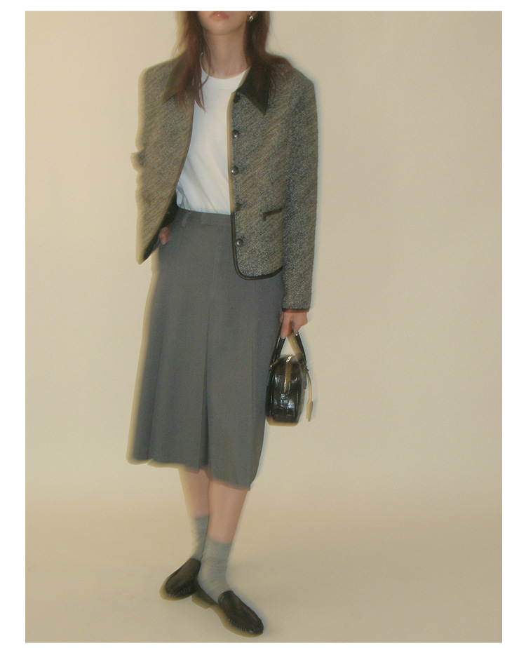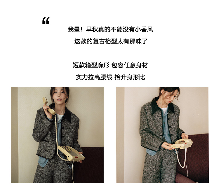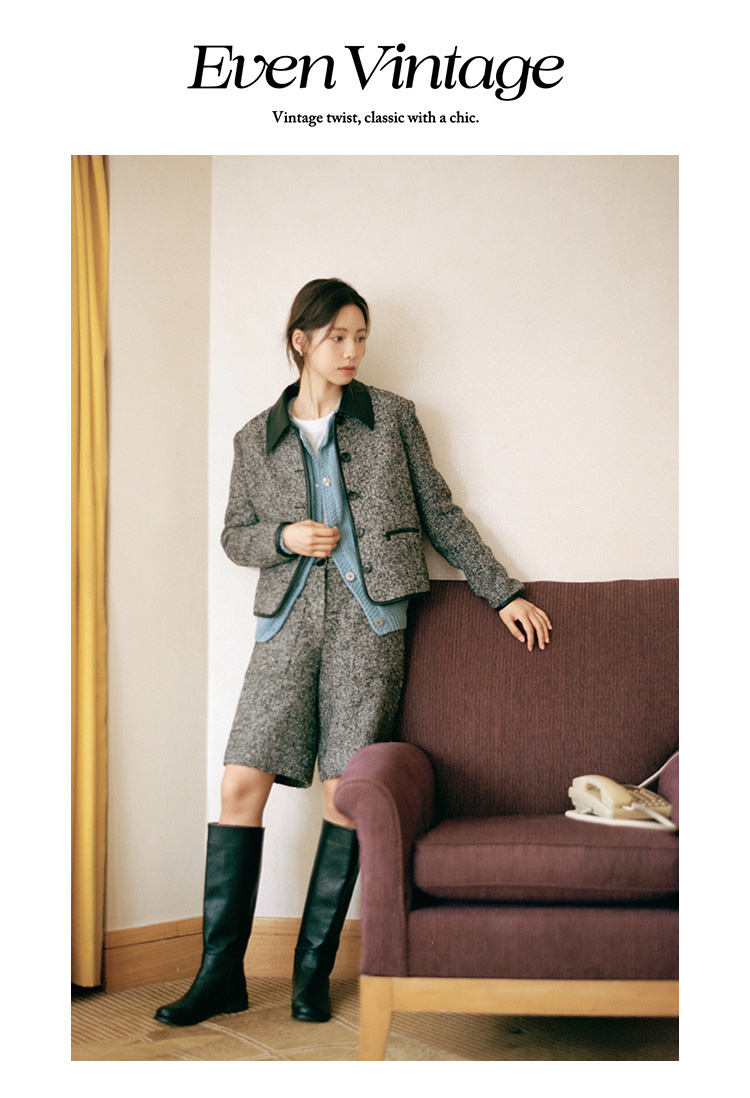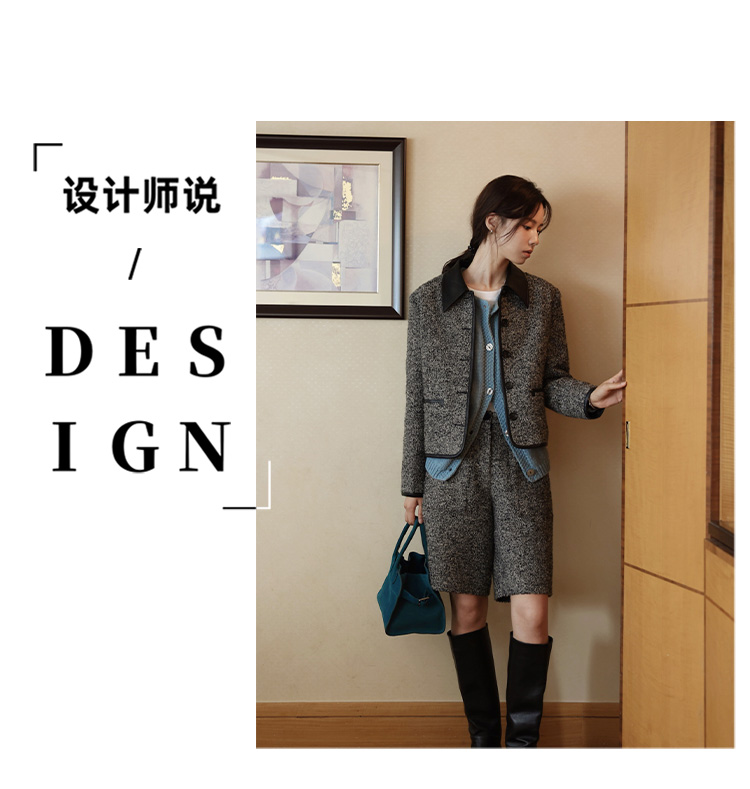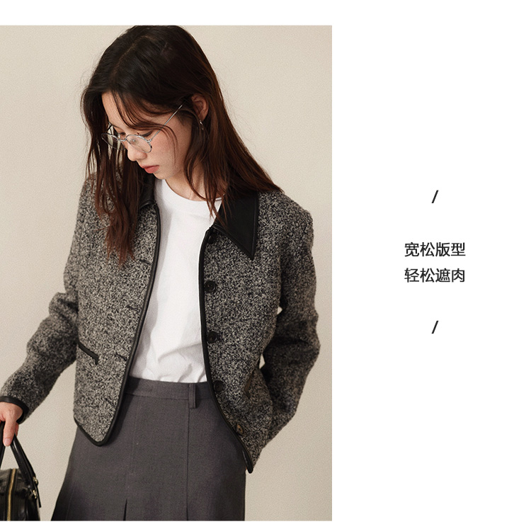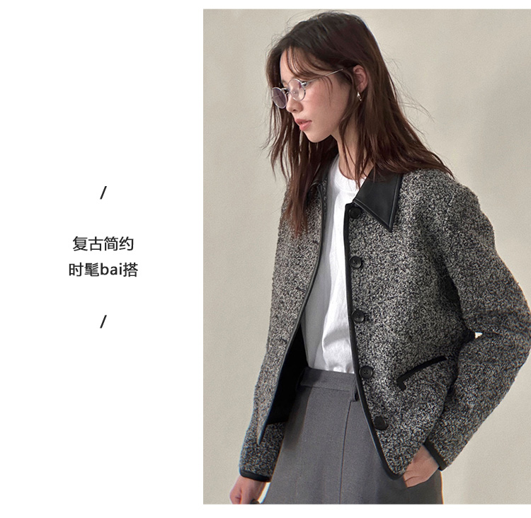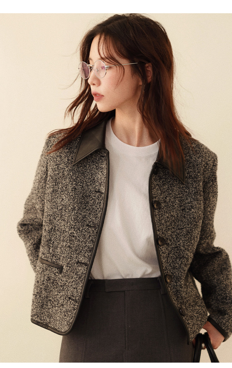 Even Vintage | 定制羊毛混纺粗花呢 皮包边翻领小香风短外套秋冬