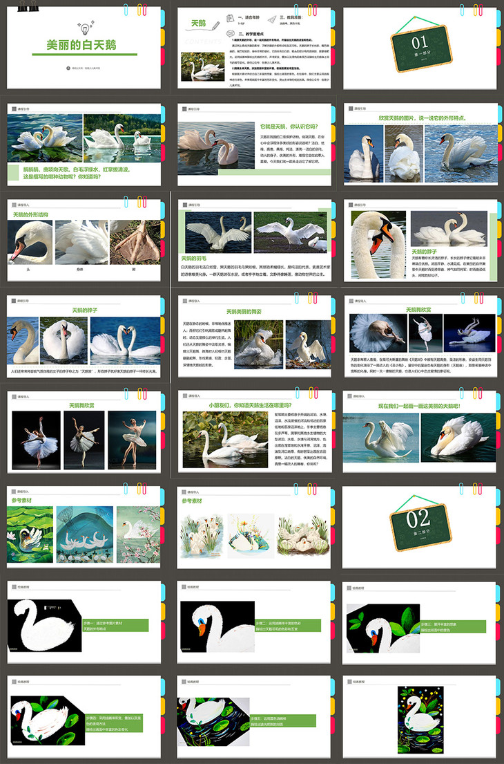 1.观察天鹅的外形,说一说天鹅的外形特点,并描绘出天鹅的造型和色彩。