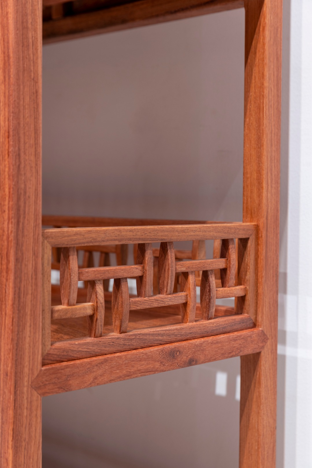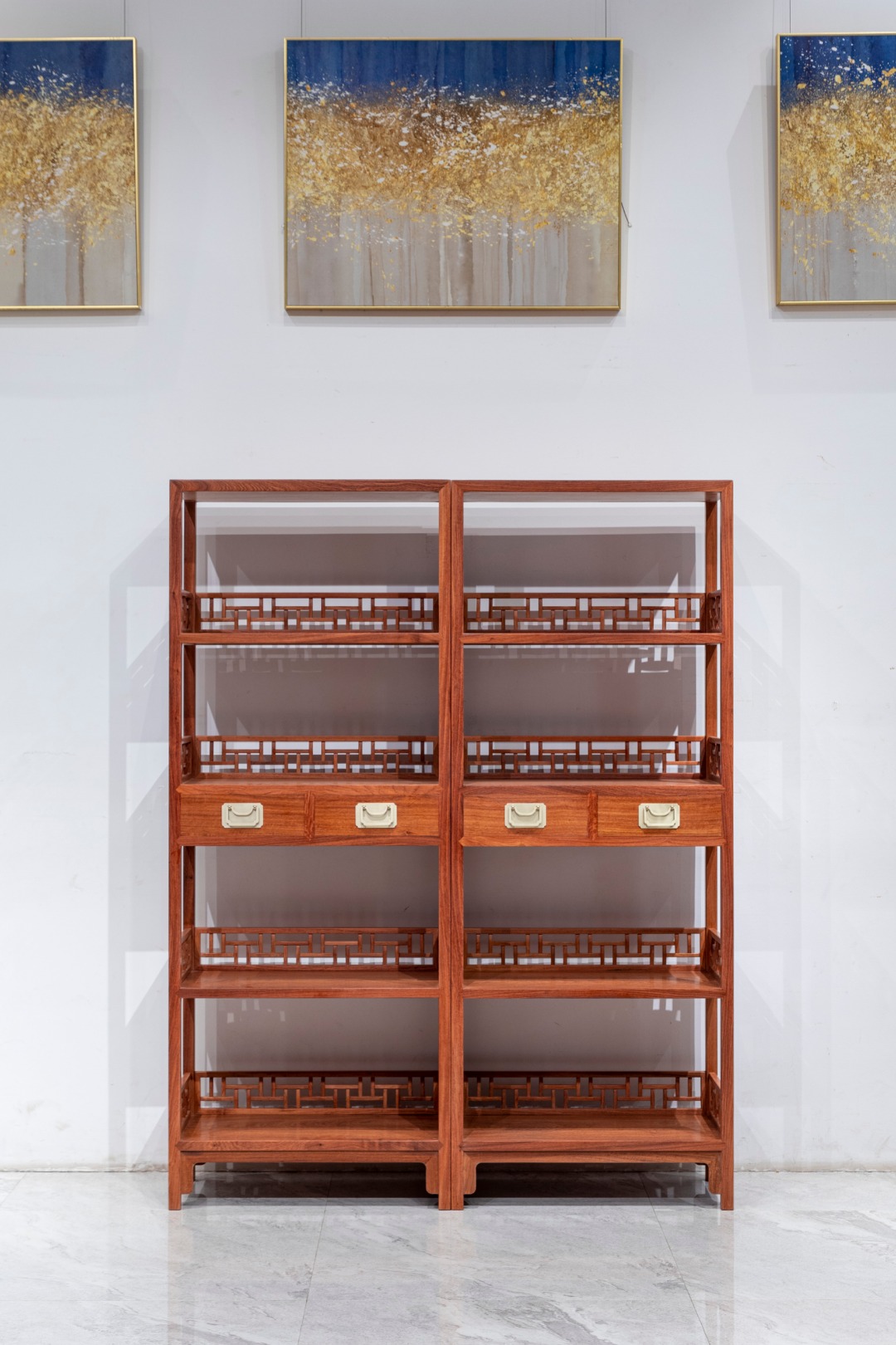 架格挺拔中见明秀简洁,单双可陈,分合可用。全器全独板制,架格以四根方材为立柱,方材直足通根,严丝合缝精湛牢固;用横板将空间分隔成四层,中部设抽屉两具。每层隔板三面设围子,可拆式,围栏用横竖材攒接而成,是品字栏杆的一种变体;攒接接件削弧形,中间宽两头窄,小细节更有看头,整体颇为吃工。