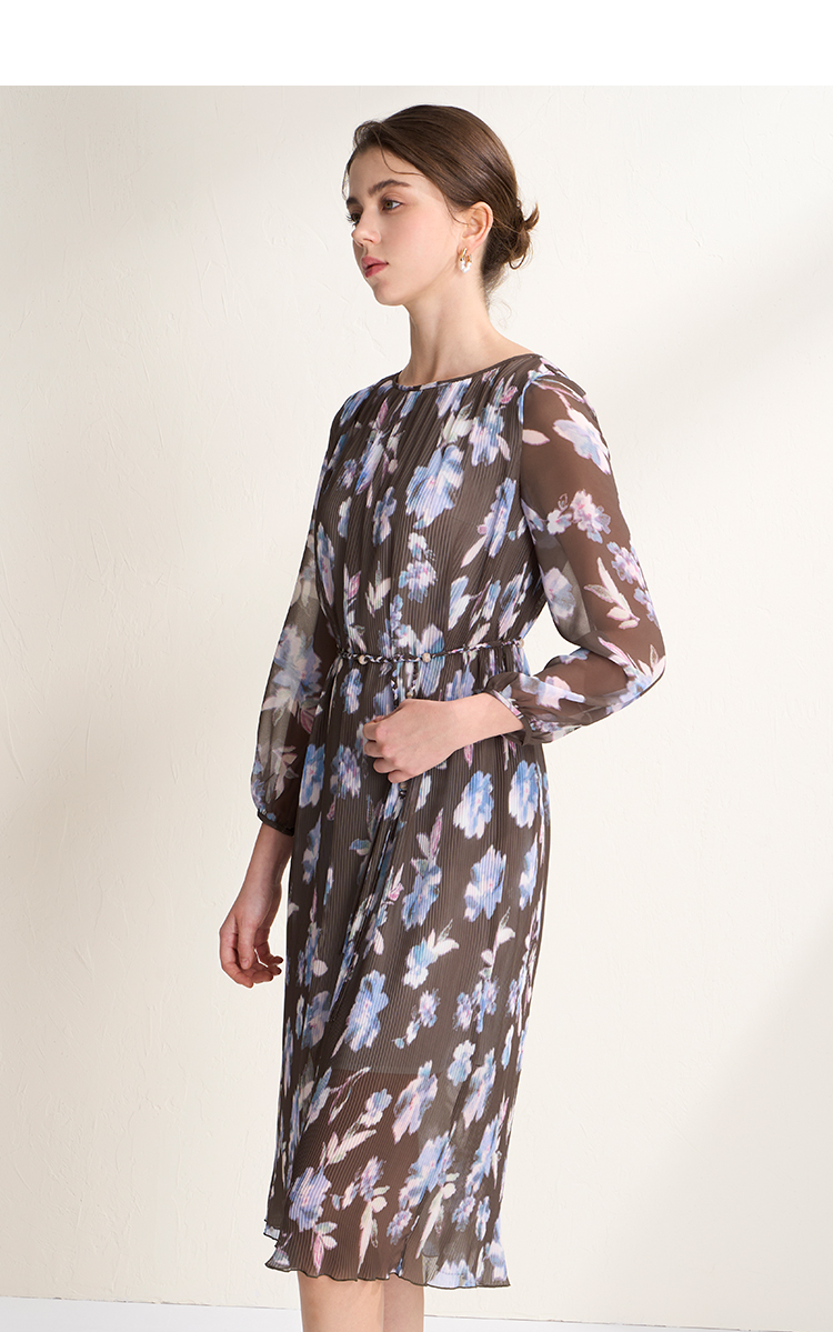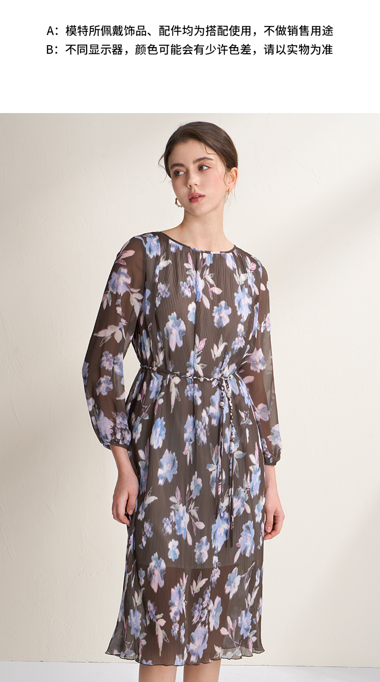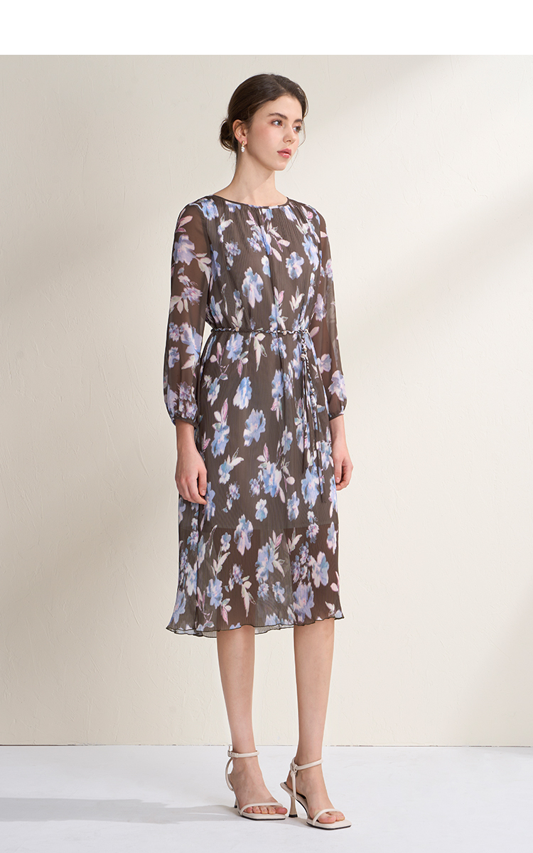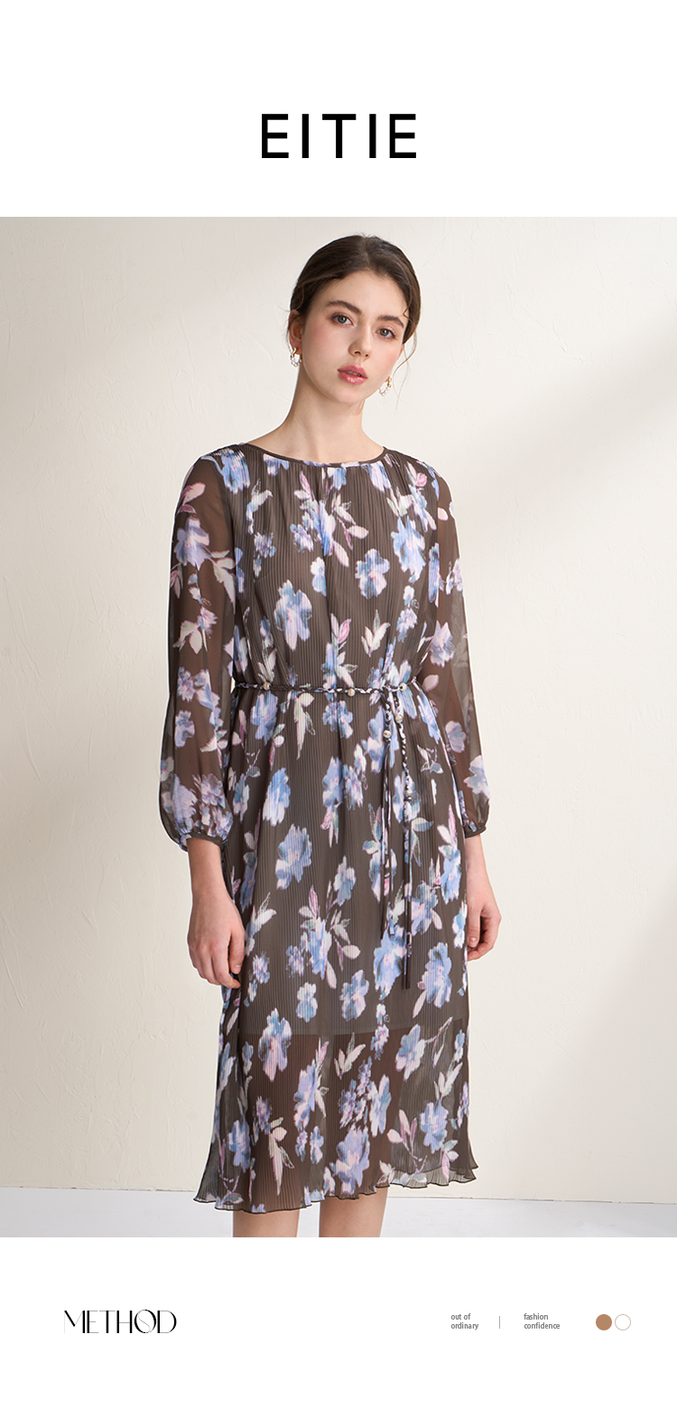 EITIE爱特爱优雅浪漫印花压褶收腰显瘦直筒连衣裙2026春季新款A2607115