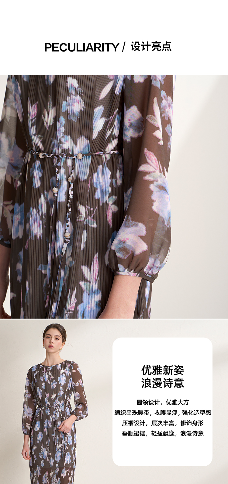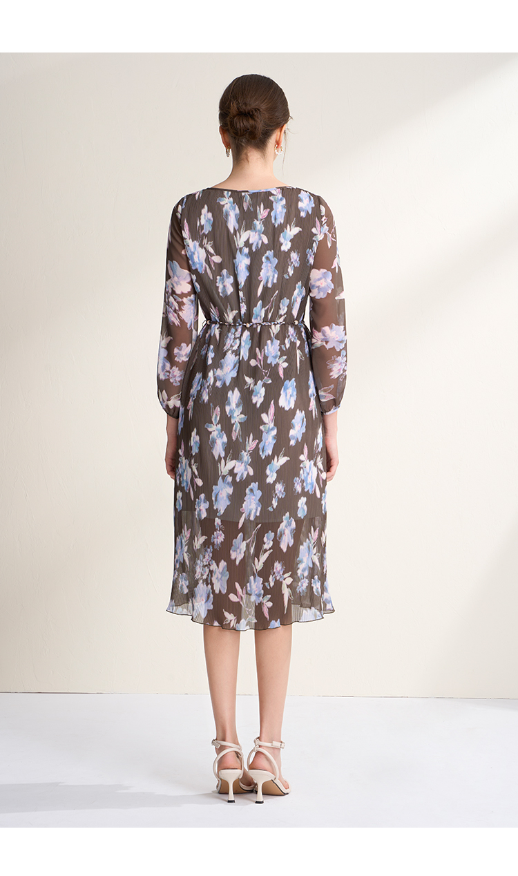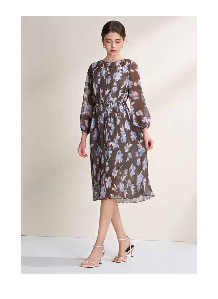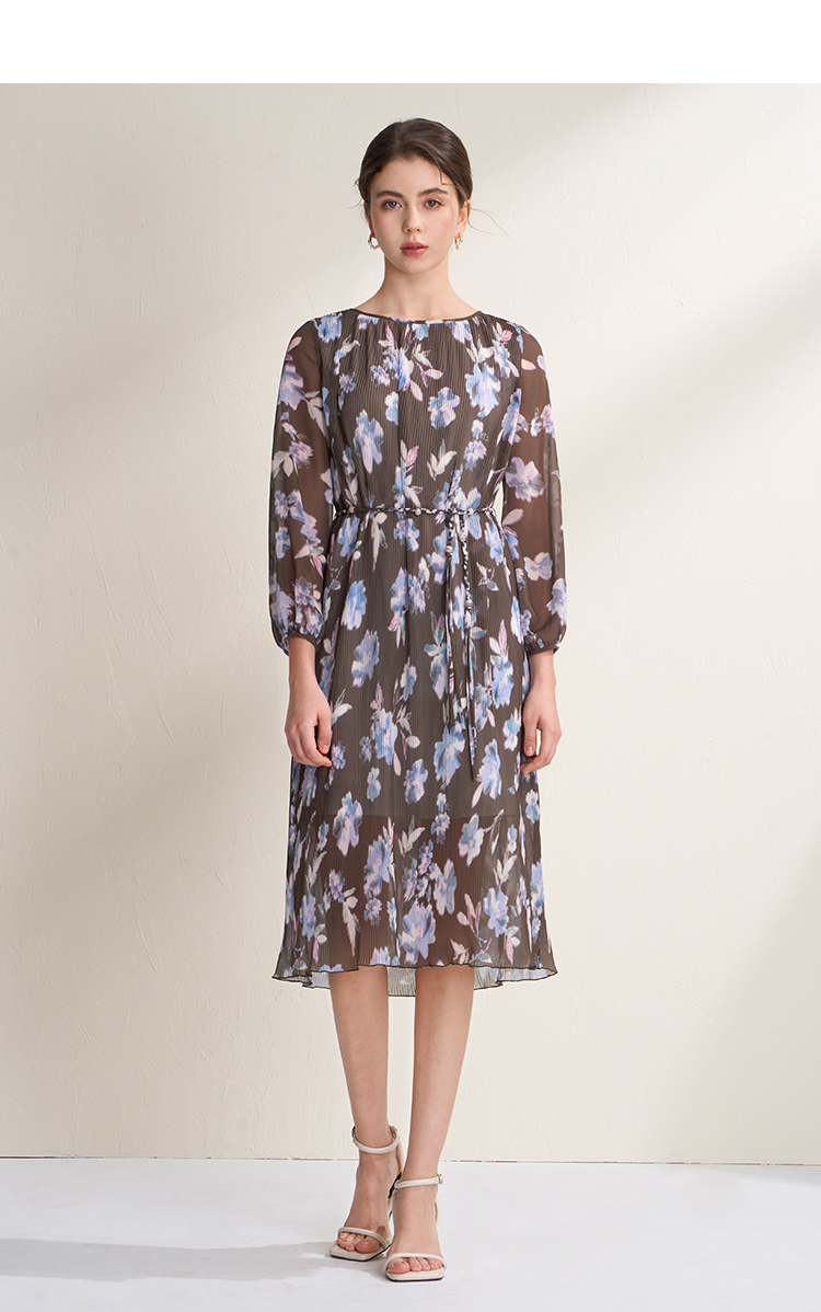 EITIE爱特爱优雅浪漫印花压褶收腰显瘦直筒连衣裙2026春季新款A2607115