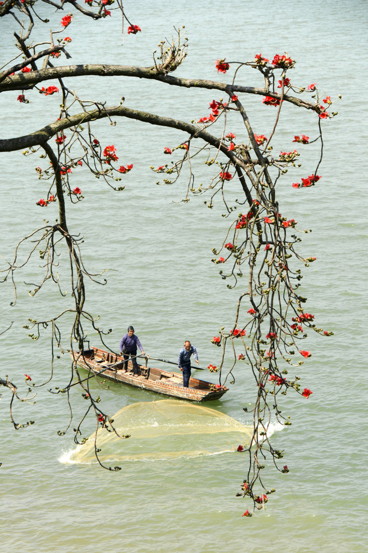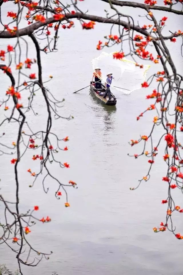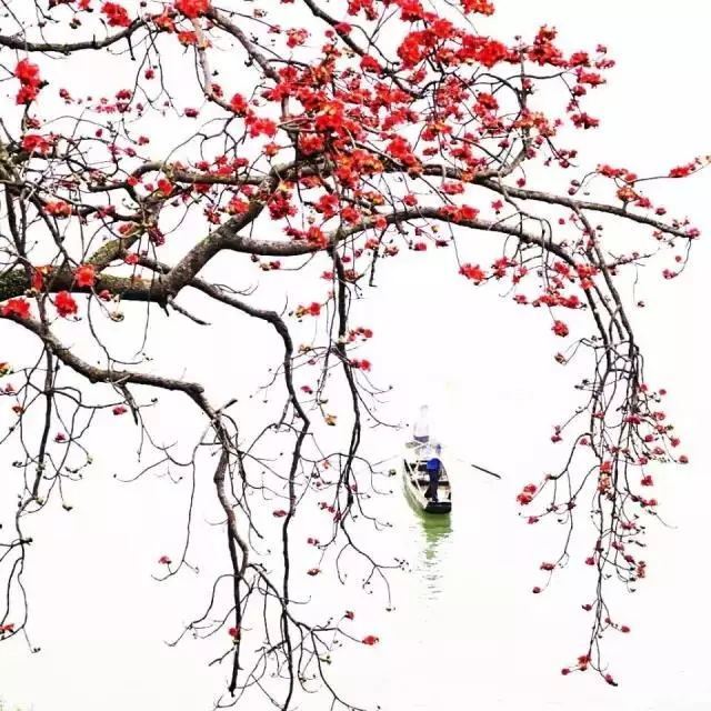 当一艘渔船在树下悠悠驶过,这画卷更添了几许岭南水乡的味道。如此优美的画面每年都吸引大批摄影爱好者前往拍摄,他们把这棵木棉称为“五邑最美木棉树”。