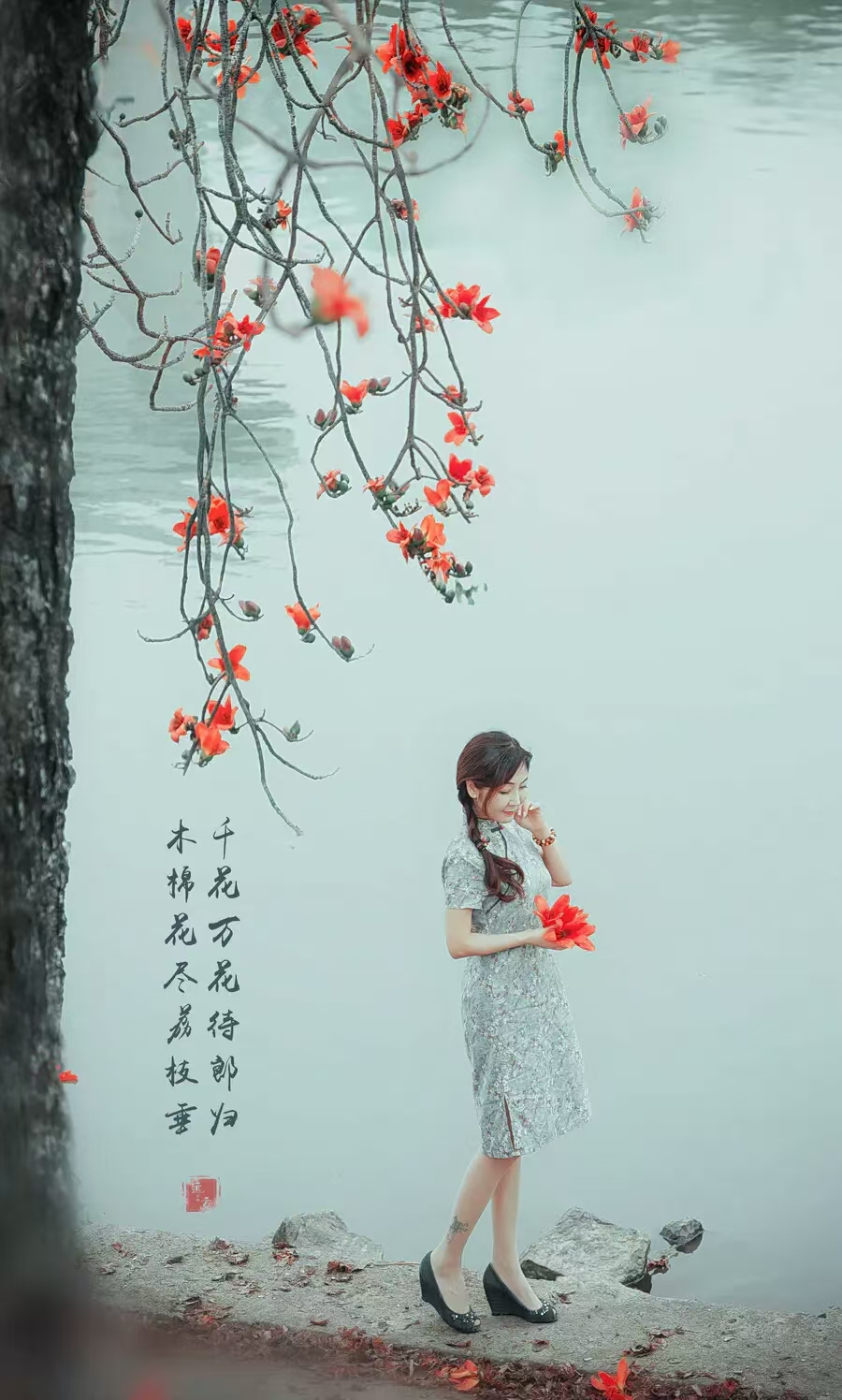 一棵20多米高的木棉矗立在小山坡上。这棵木棉的树枝并非全部向上伸展,而是有一部分弯腰贴着水面,展现出婀娜多姿的形态美,与堤岸上苍翠的树木相映衬,宛如一幅春意盎然的画卷。