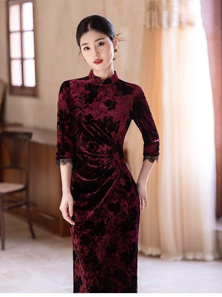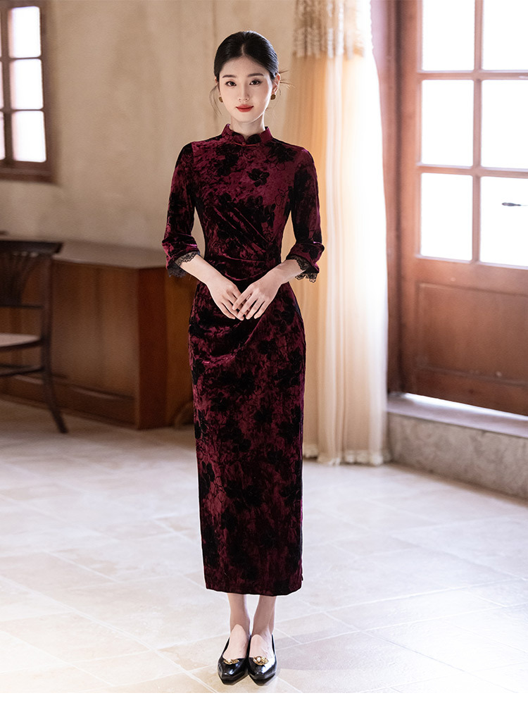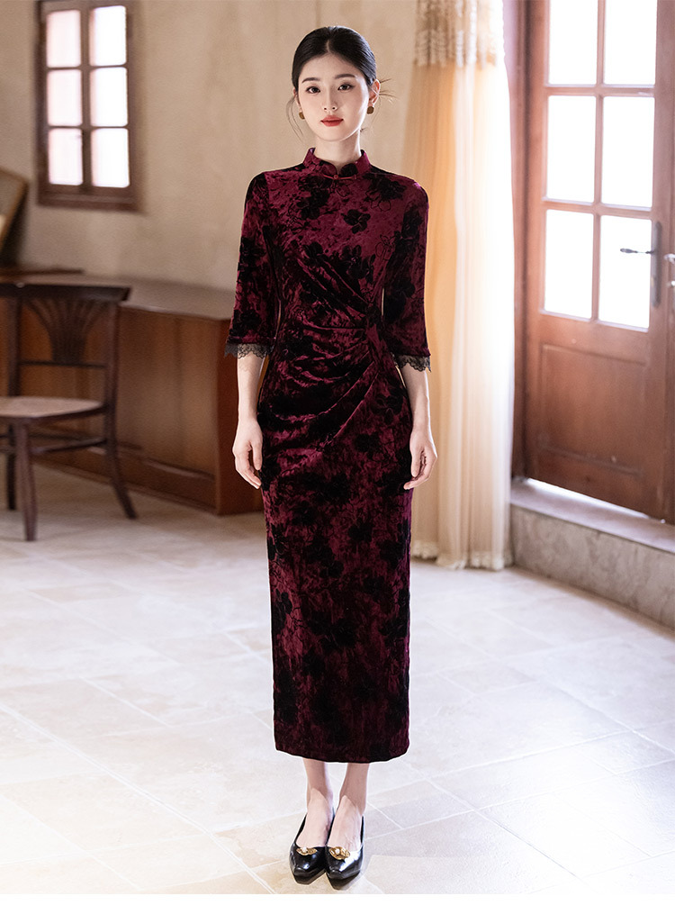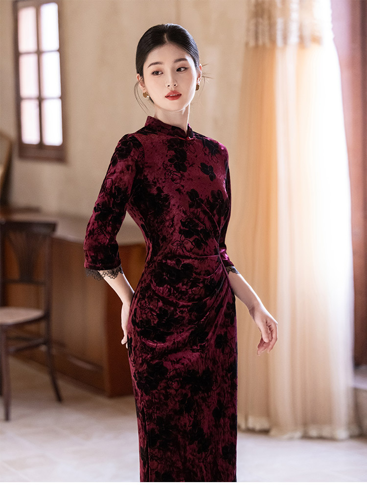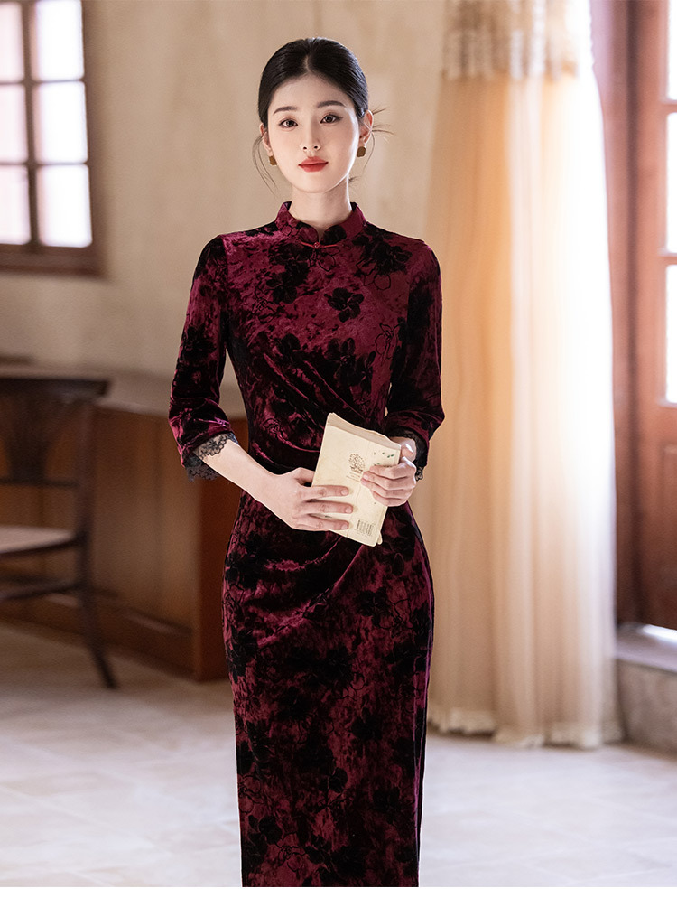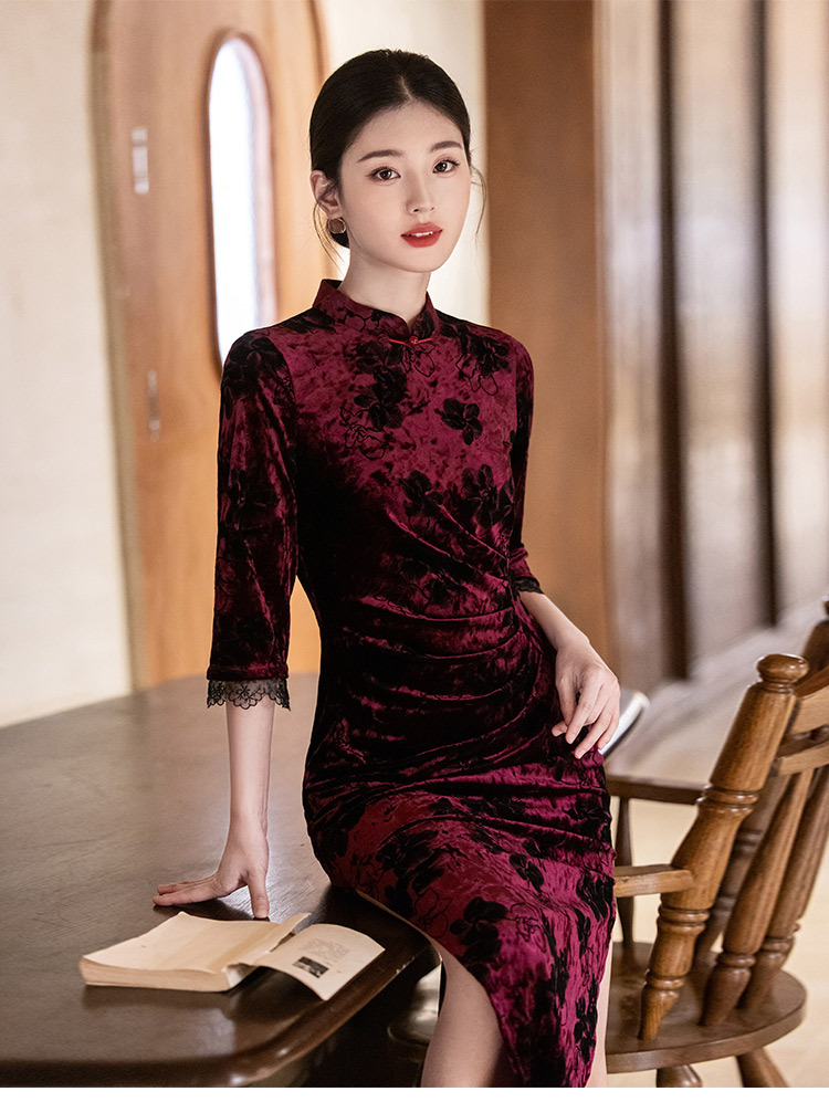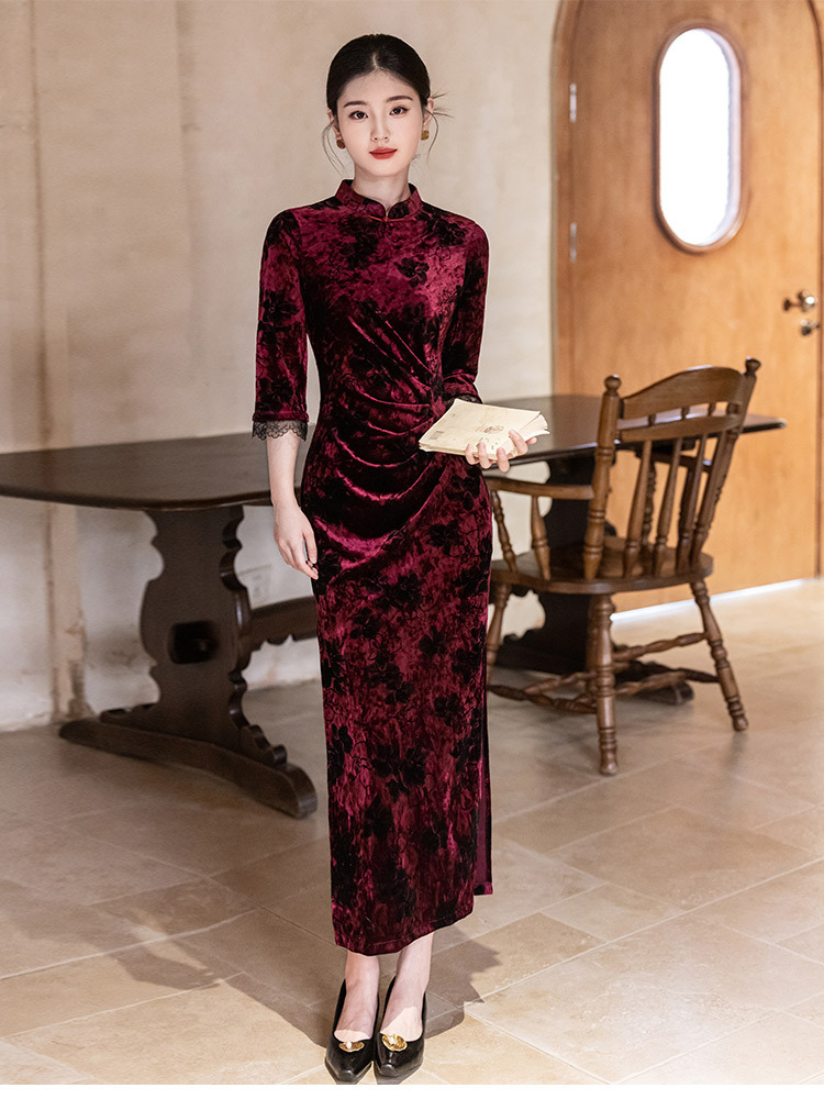 SC22220红色丝绒国风新中式秋季长袖旗袍2025新款年轻款女复古收腰秋冬装
