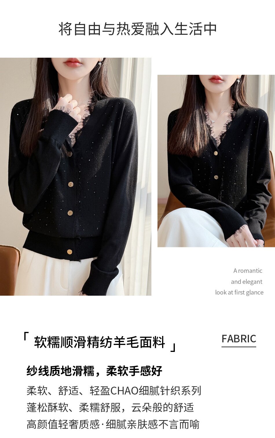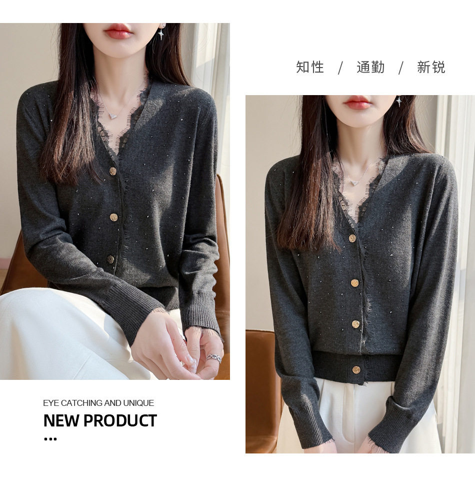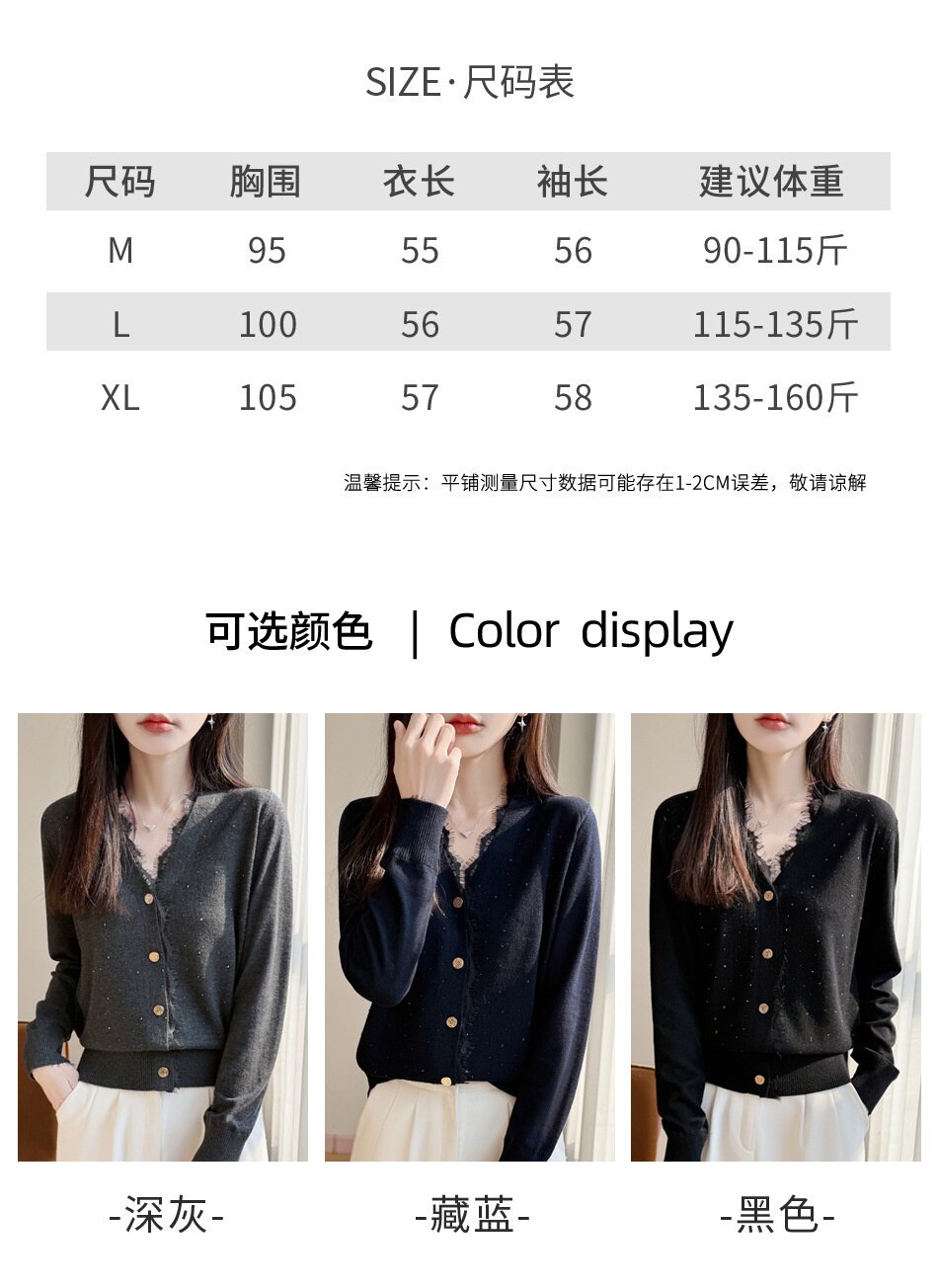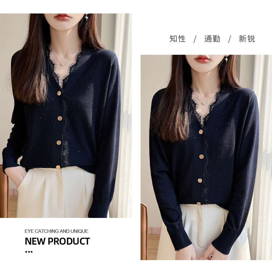 「自」全新升级【铂金会员146/天猫189/差价43】(00117)洛诗琳新款V领针织开衫2026春季气质亮片蕾丝拼接针织外套