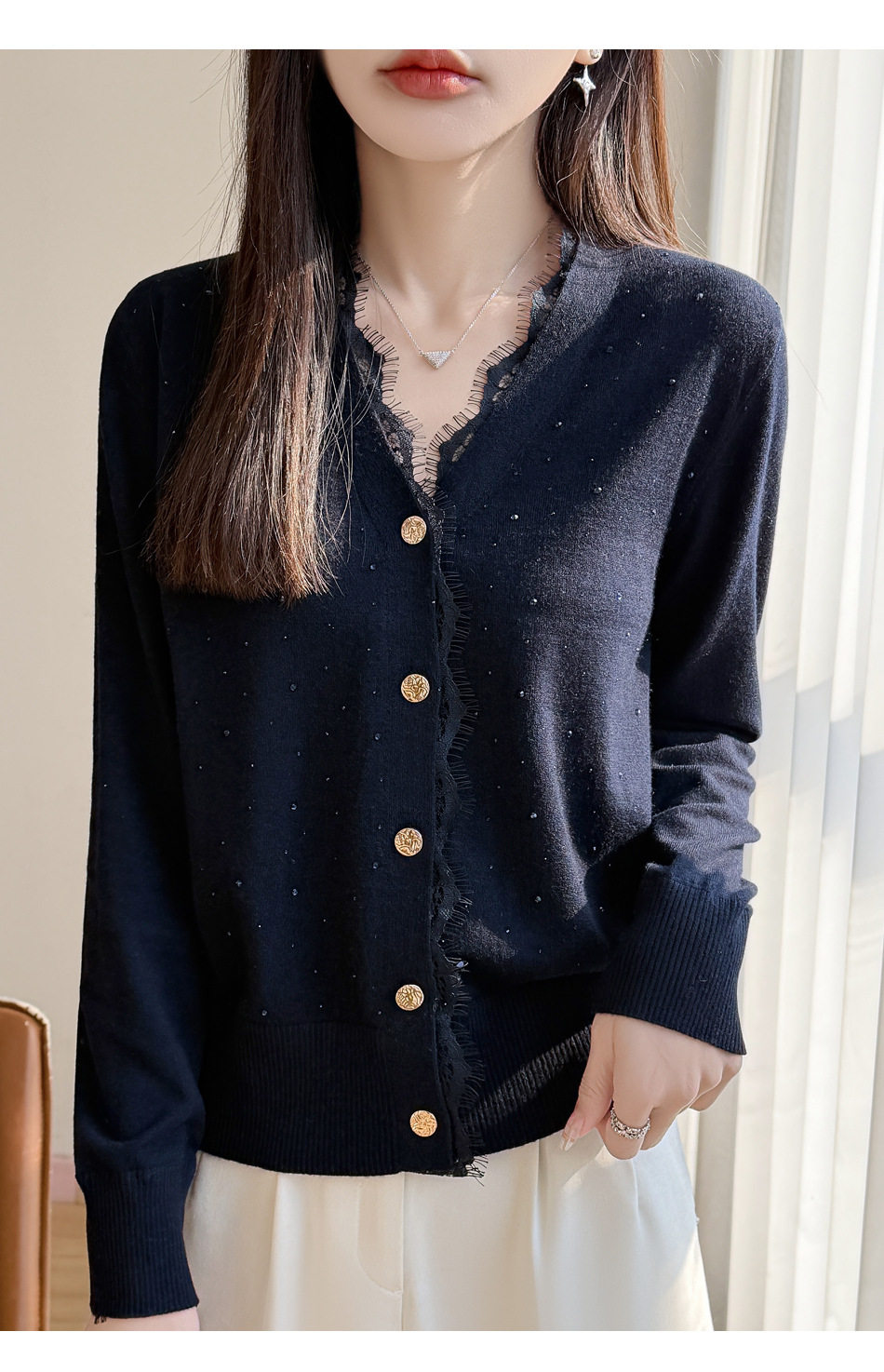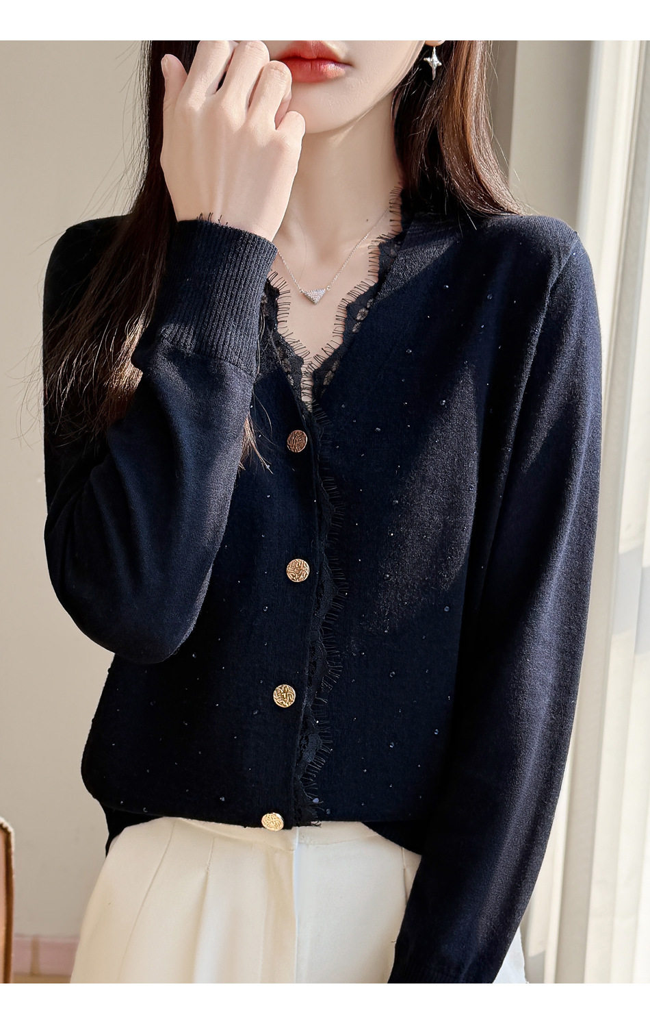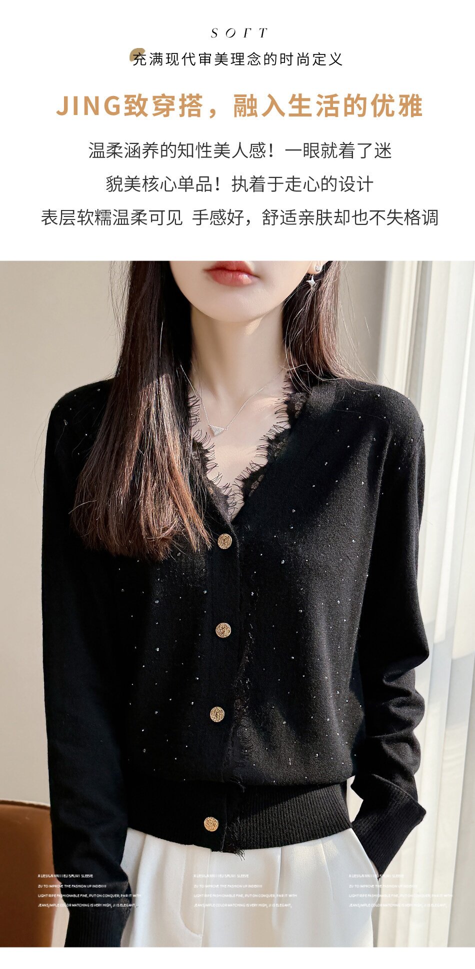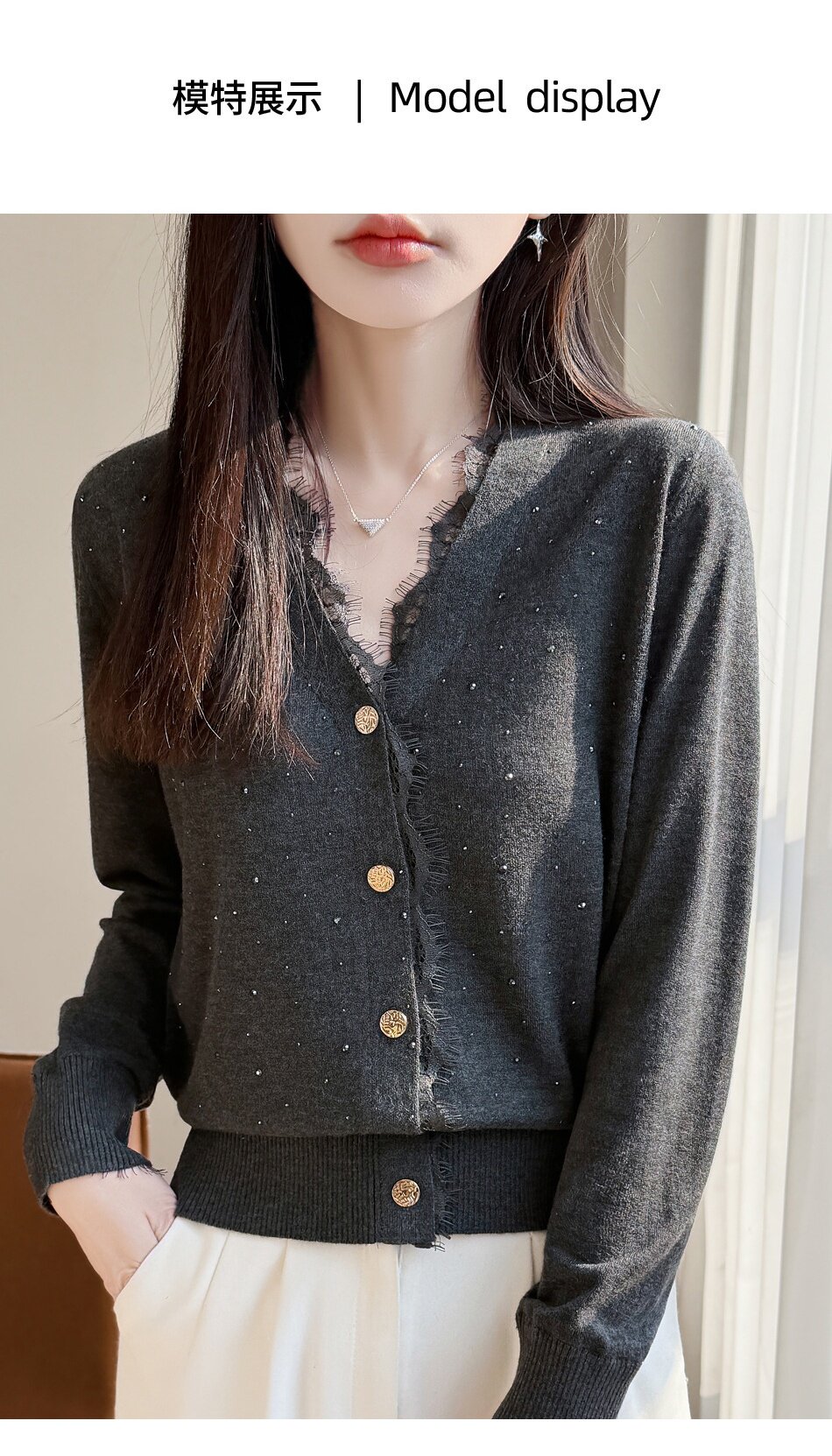 「自」全新升级【铂金会员146/天猫189/差价43】(00117)洛诗琳新款V领针织开衫2026春季气质亮片蕾丝拼接针织外套