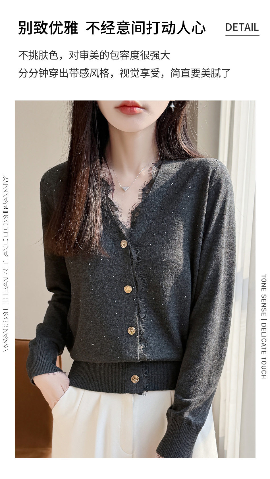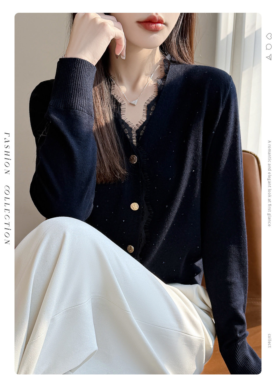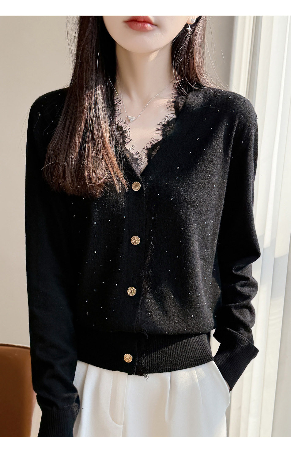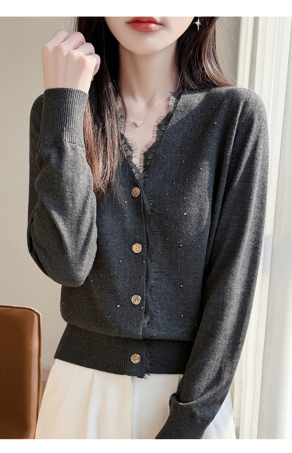 「自」全新升级【铂金会员146/天猫189/差价43】(00117)洛诗琳新款V领针织开衫2026春季气质亮片蕾丝拼接针织外套