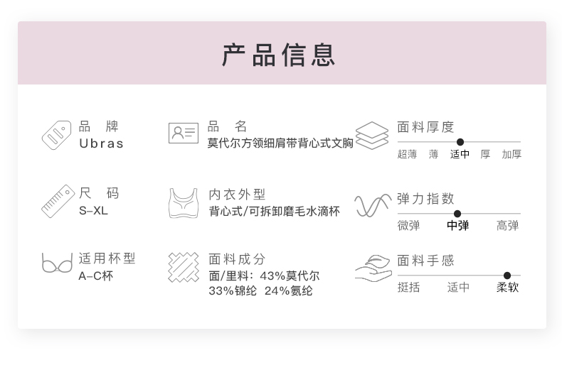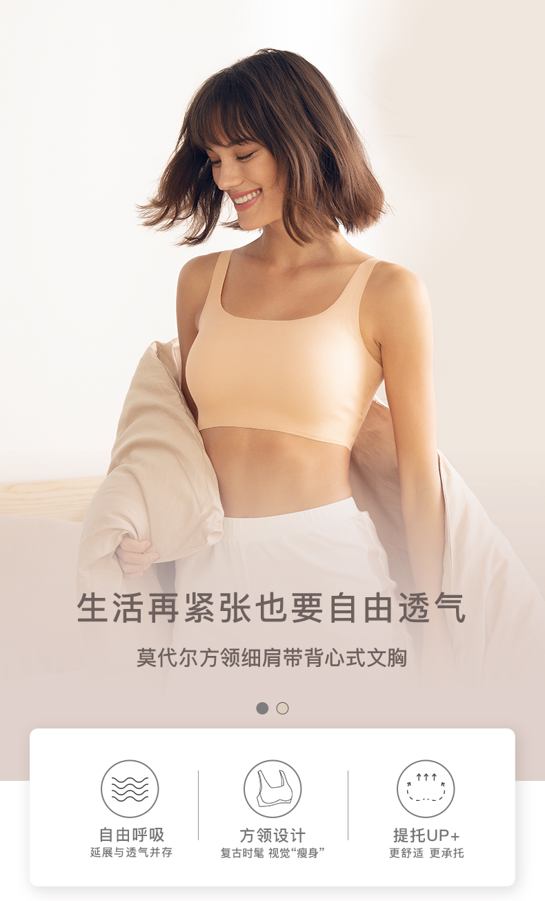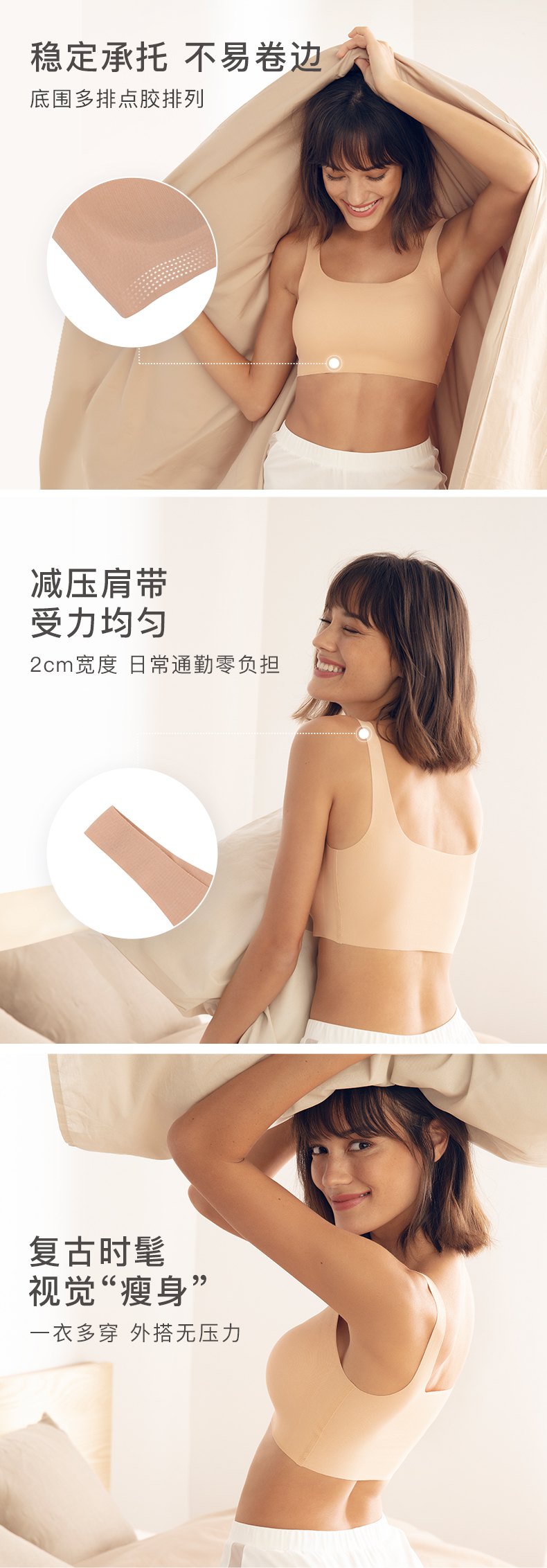 Ubras莫代尔方领细肩带背心式文胸内衣女无钢圈无痕舒适透气胸罩