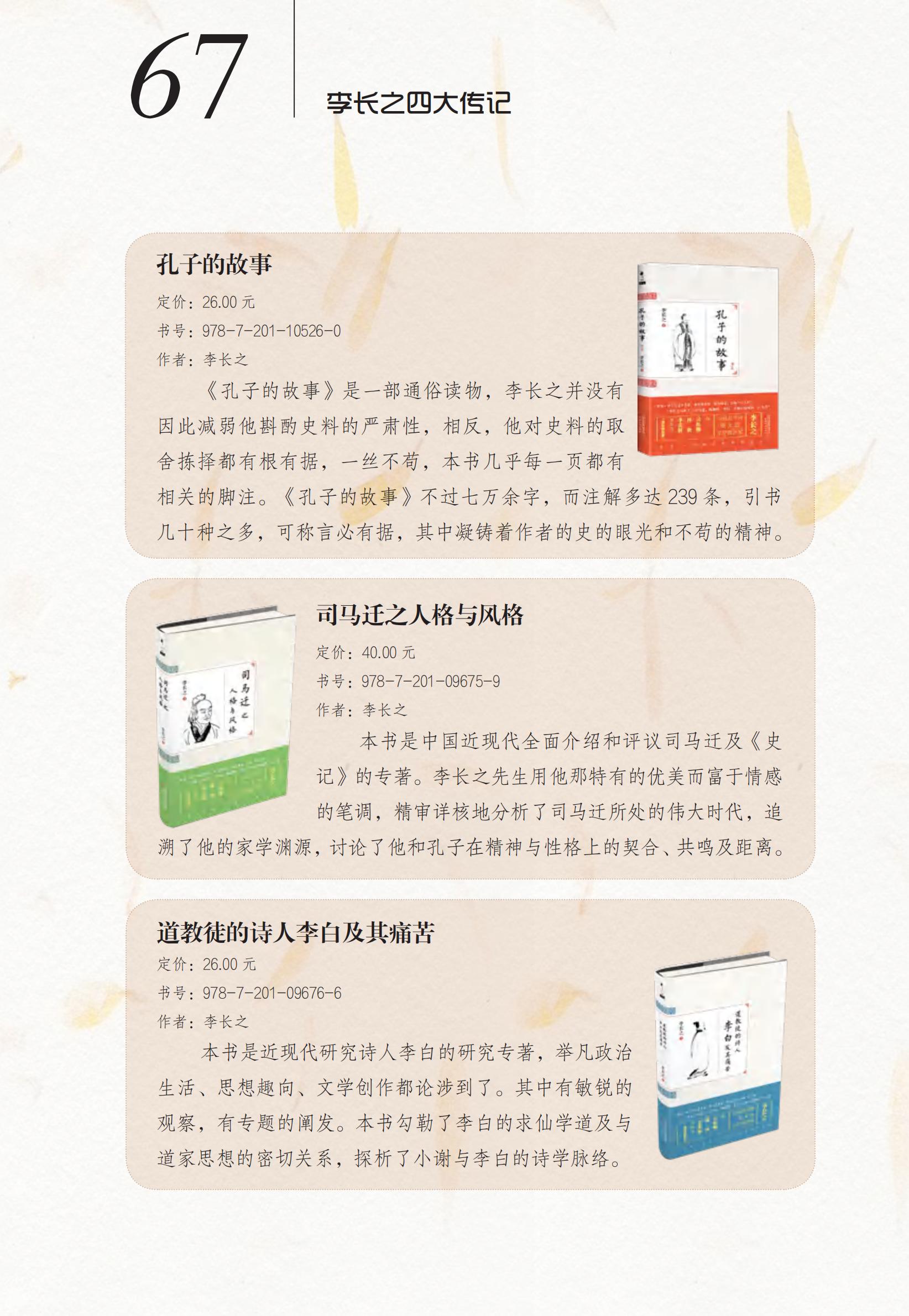 “李长之文学批评四大传记”:《司马迁的人格与风格》《道教徒的诗人李白及其痛苦》《陶渊明传论》《孔子的故事》